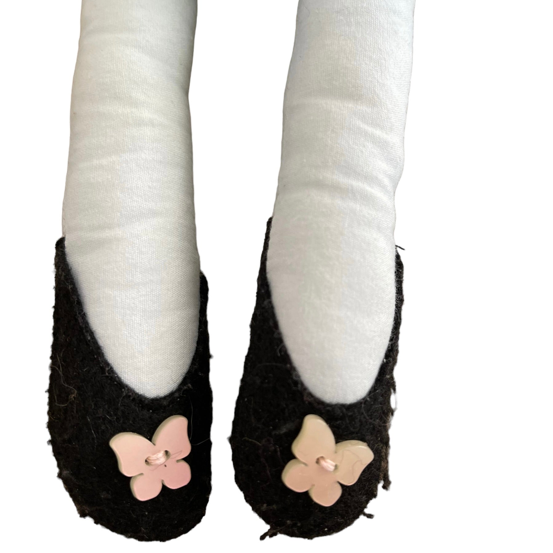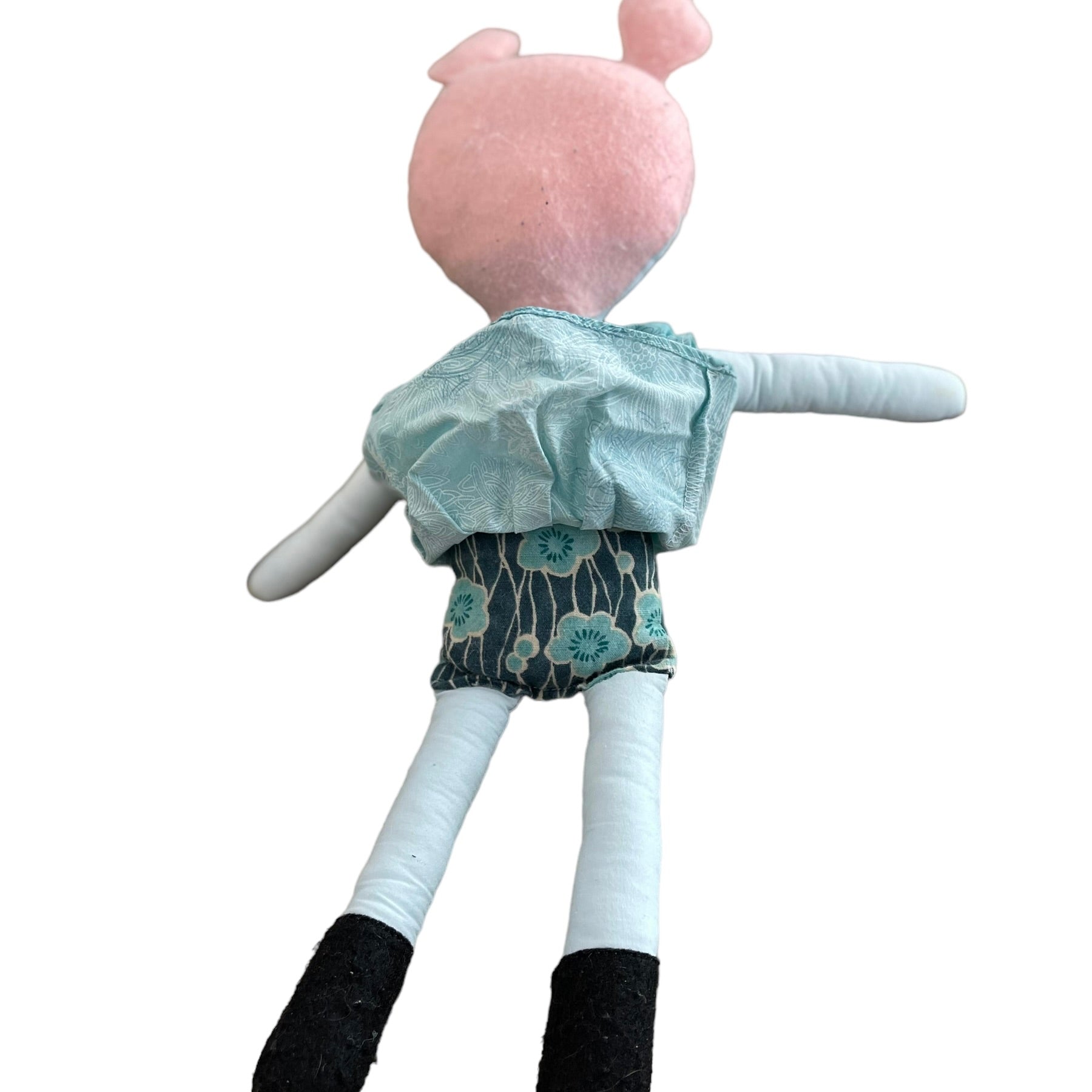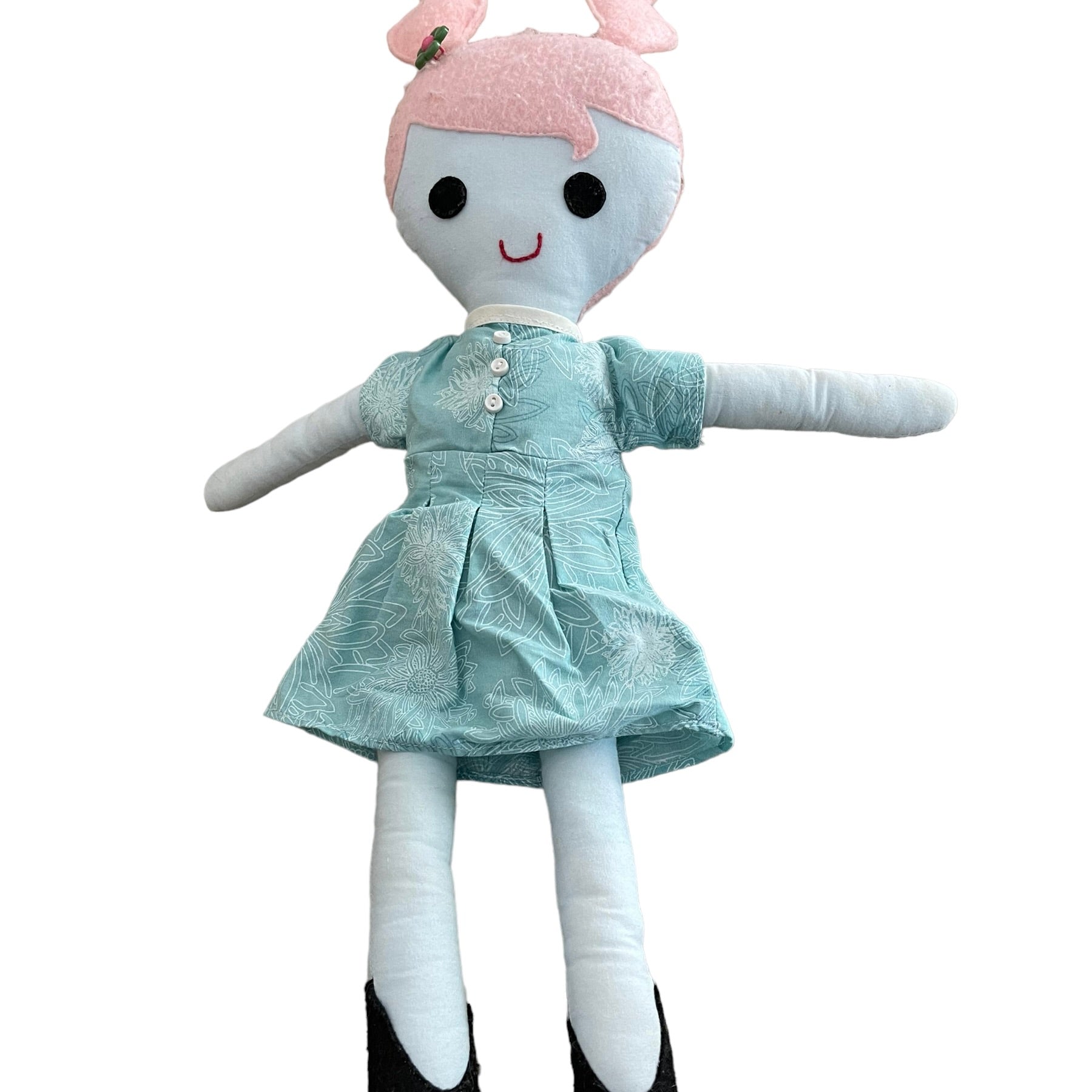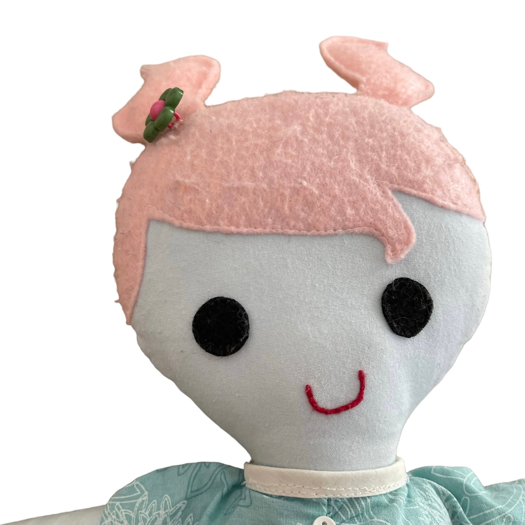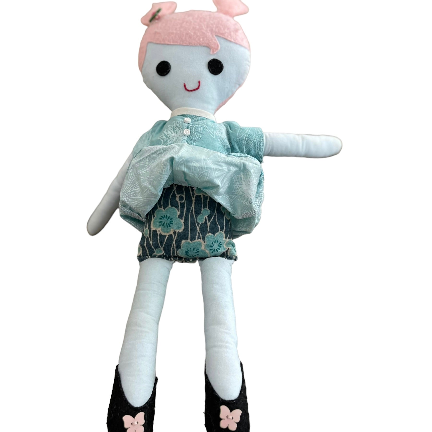 !5" Cloth doll pink felt hair and an aqua dress with & tiny button detail. Her body is aqua and grey floral print, and her black felt Ballerina Flats are embellished with pink button butterflies. This sweet girl is in excellent preowned condition and most suited for 3+