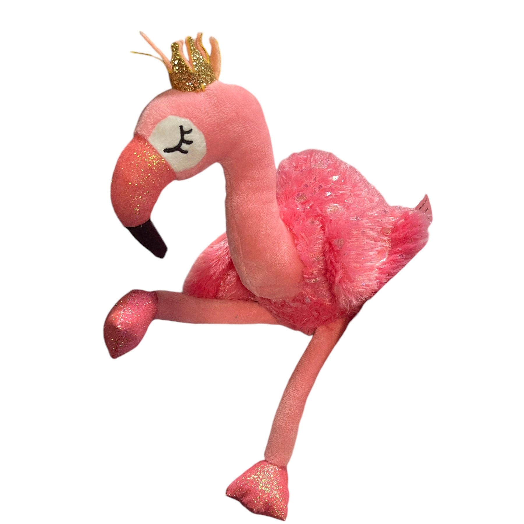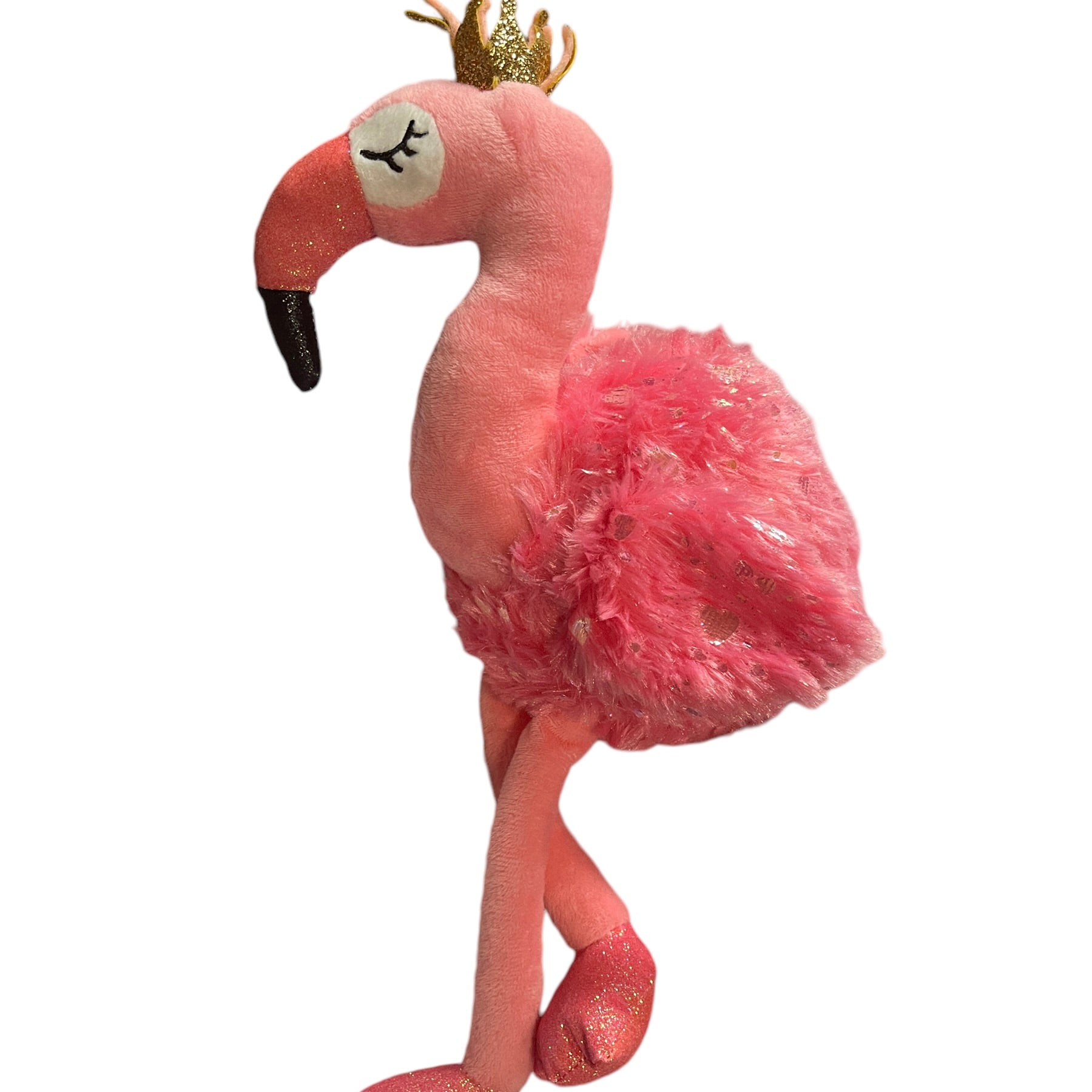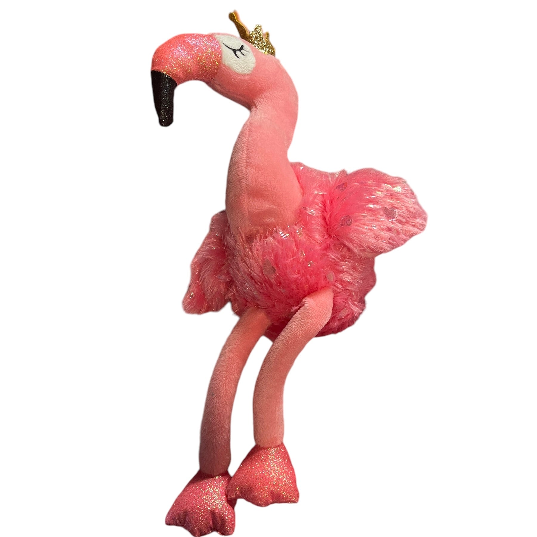 Adorable Walmart 14" Pink Sparkly Flamingo wearing a shiny gold crown. This cutie has embroidered closed eyes with long black lashes and long pink legs. Excellent preowned condition. An extra special plush.