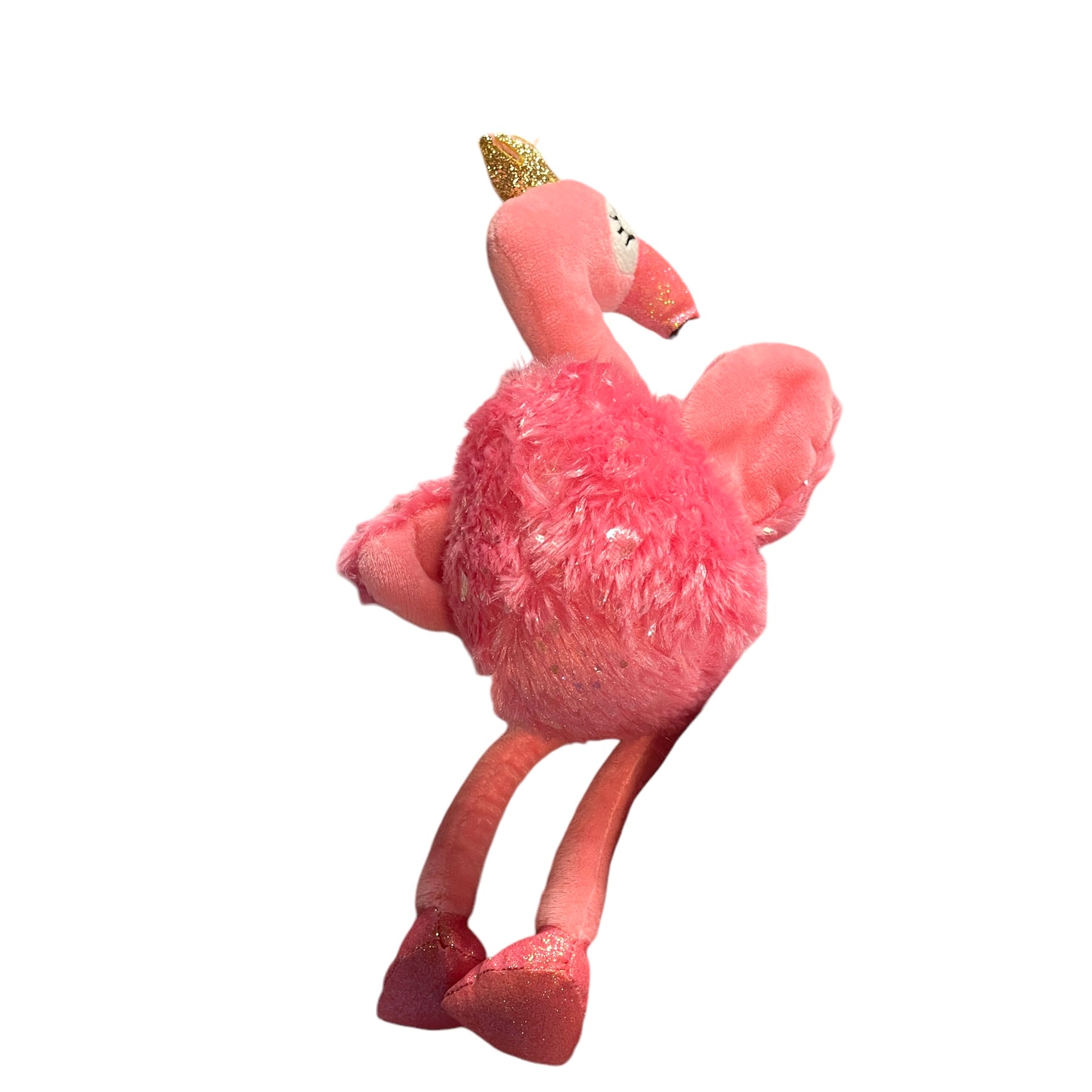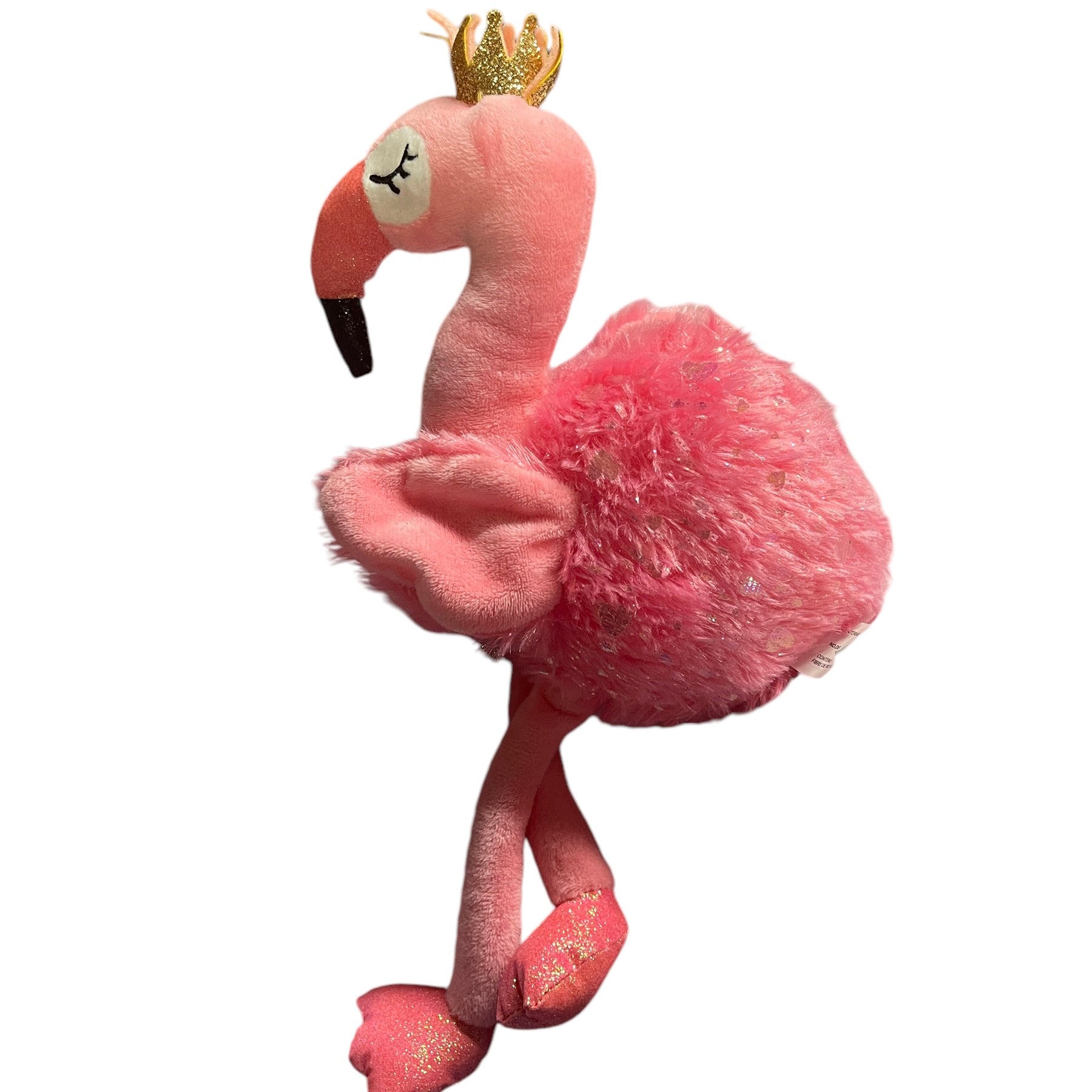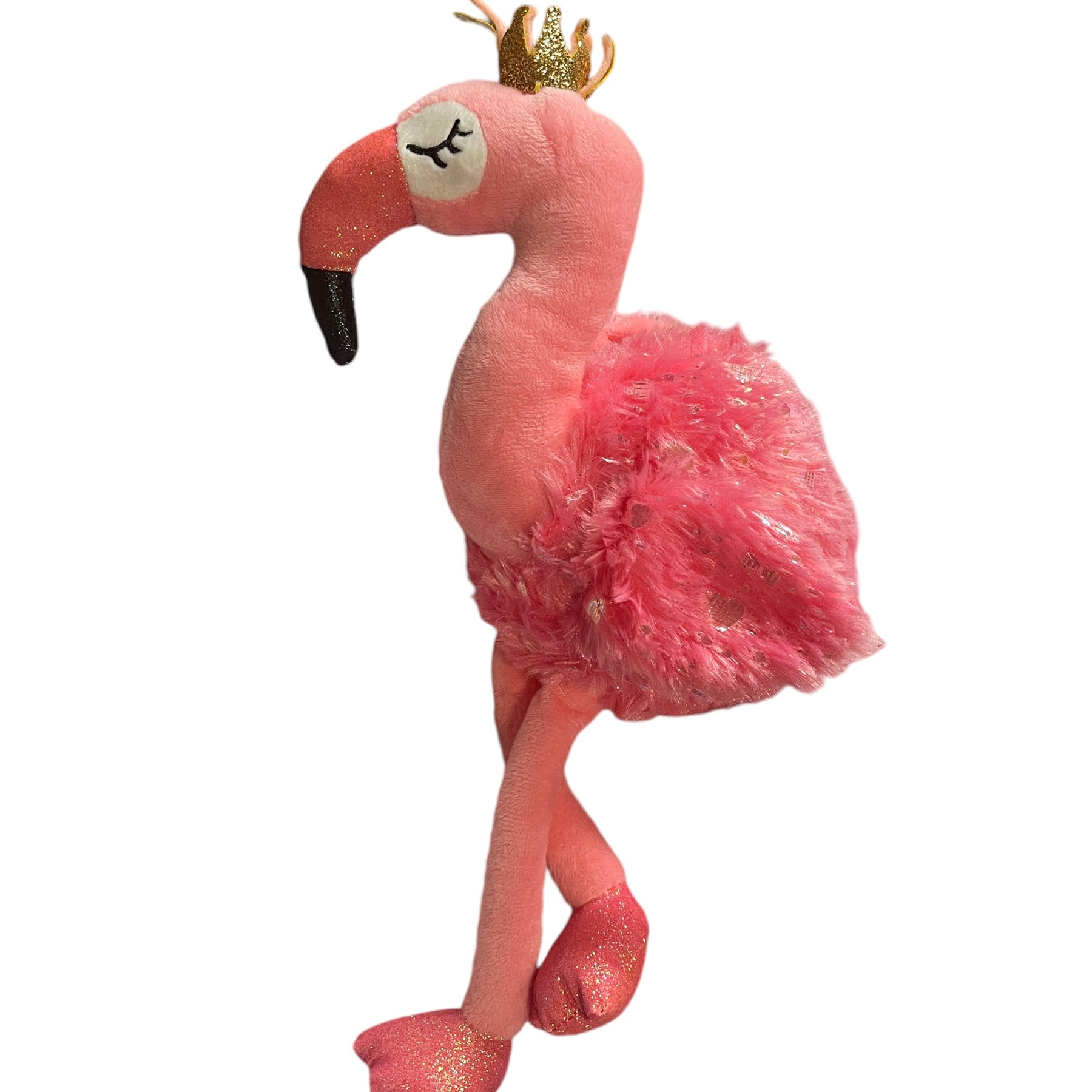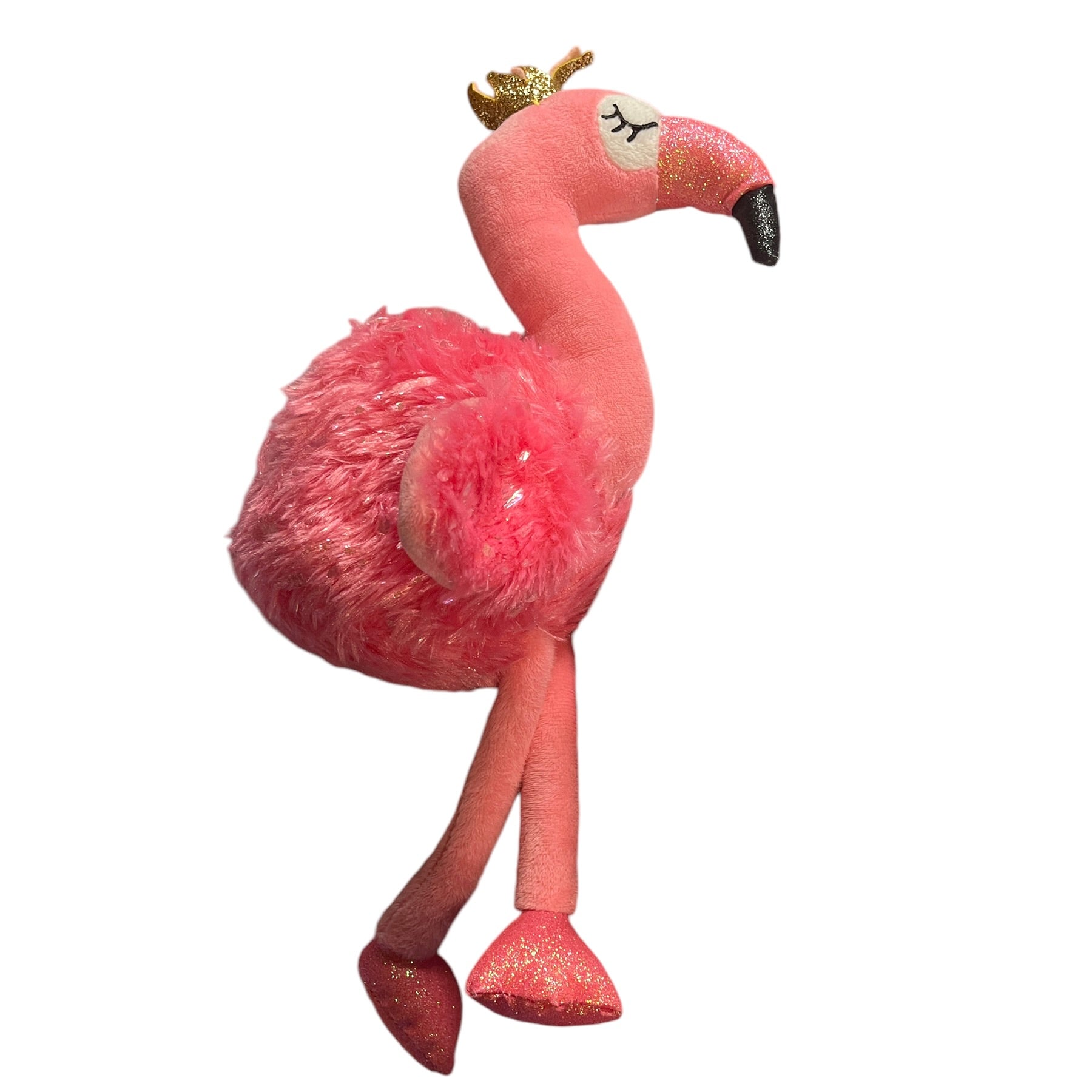 Adorable Walmart 14" Pink Sparkly Flamingo wearing a shiny gold crown. This cutie has embroidered closed eyes with long black lashes and long pink legs. Excellent preowned condition. An extra special plush.