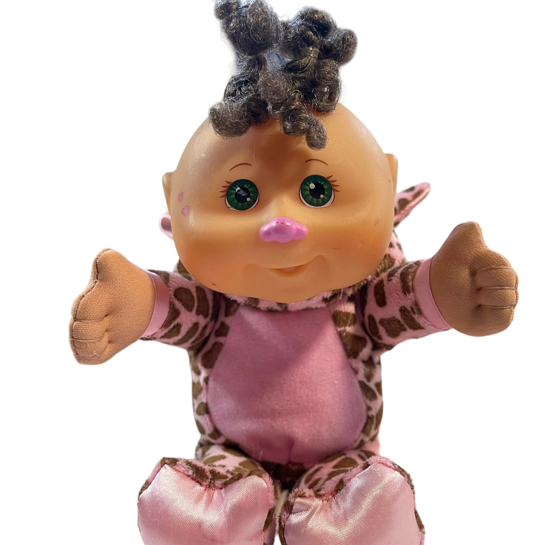 Cabbage Patch Cuties Doll in Pink and Brown Giraffe Print. This sweet baby has bright green eyes and classic fragrance. A lovely addition to your playroom or collection.
