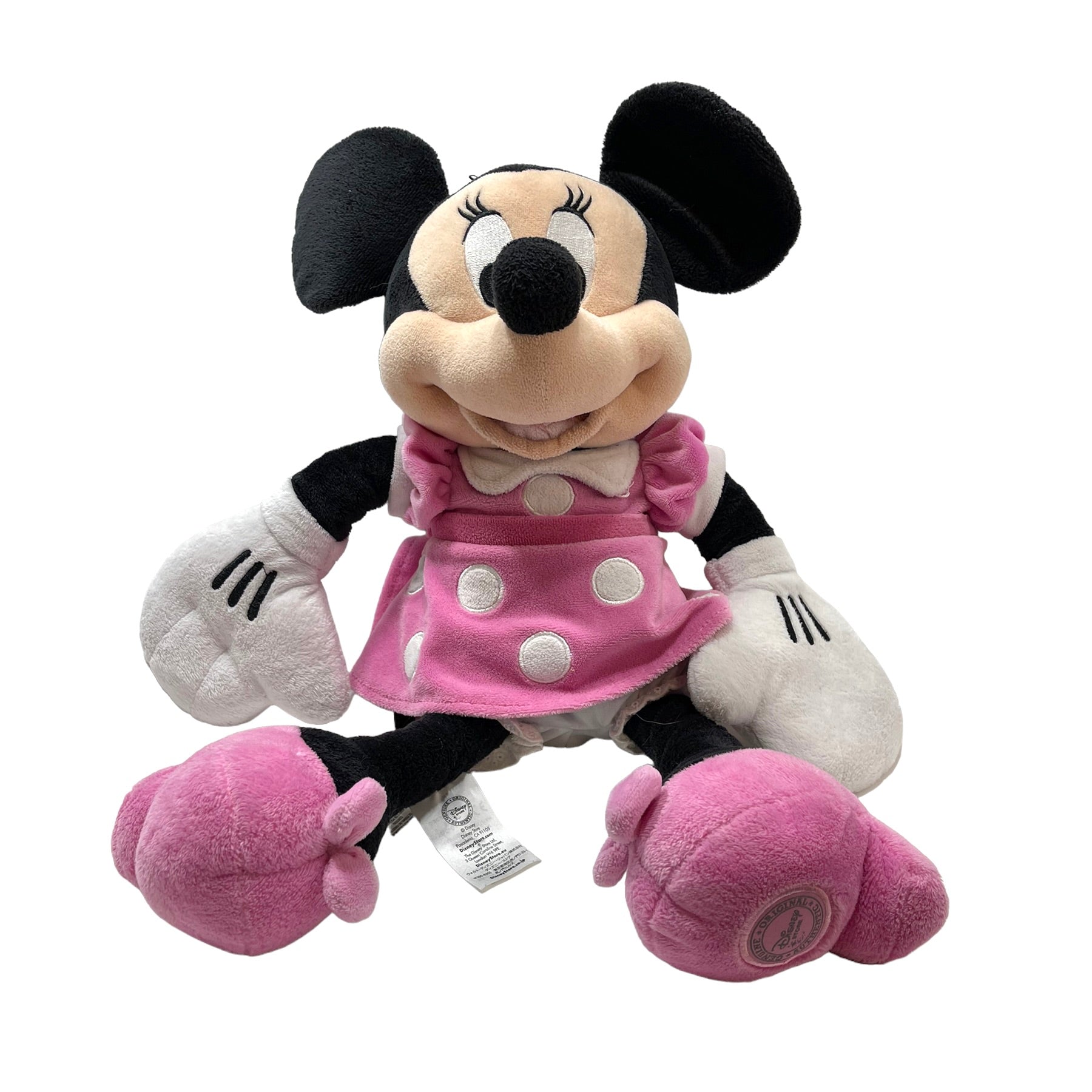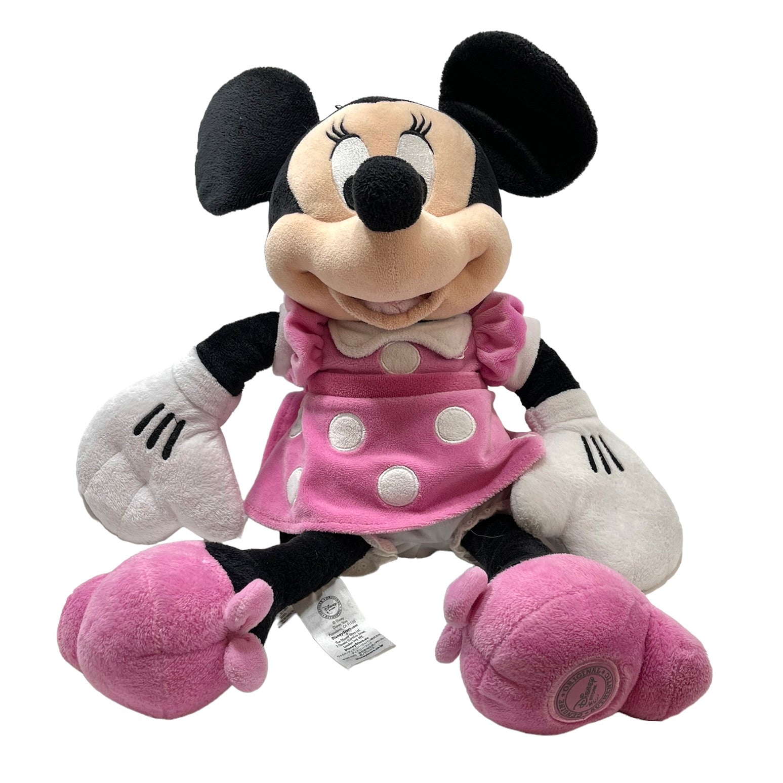 18" Preowned Pink Minnie Mouse Plush from the Disney Store, in pink velvet dress with white polka dots , pretty shoes and a sweet embroidered face. Minnie is in excellent used condition, just waiting for a new best friend.