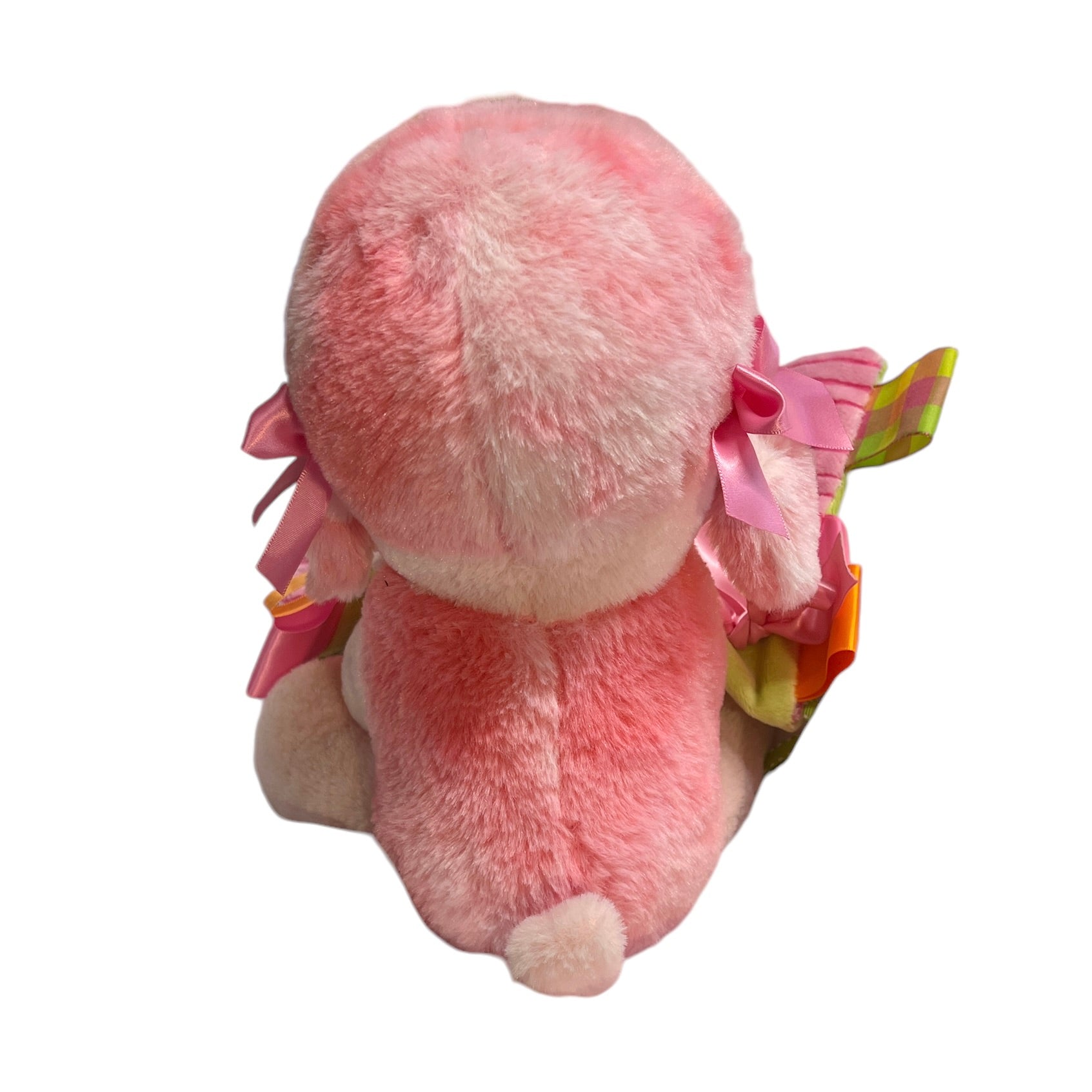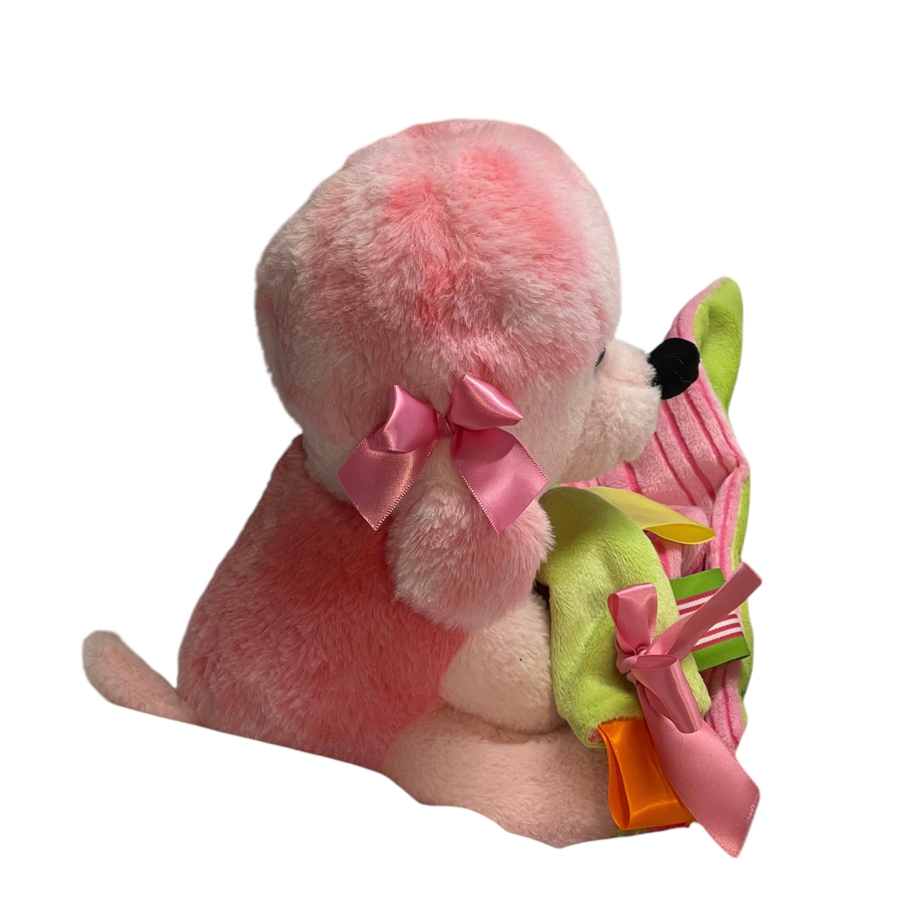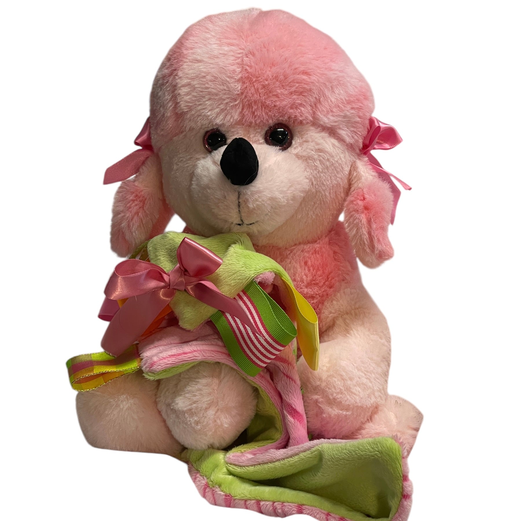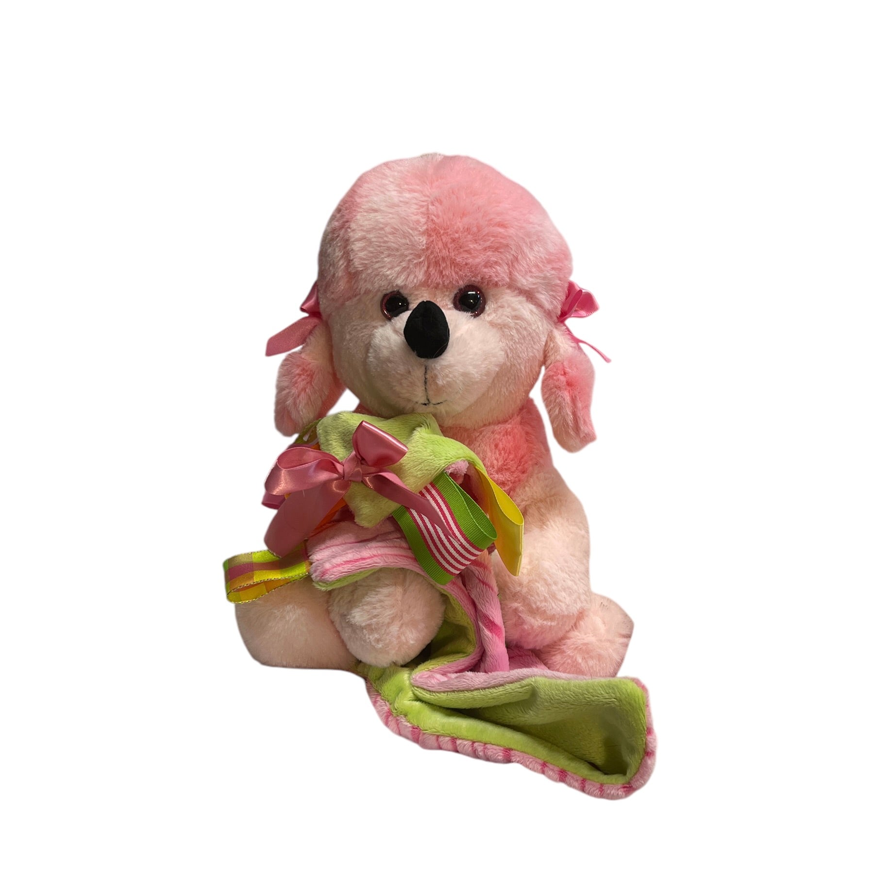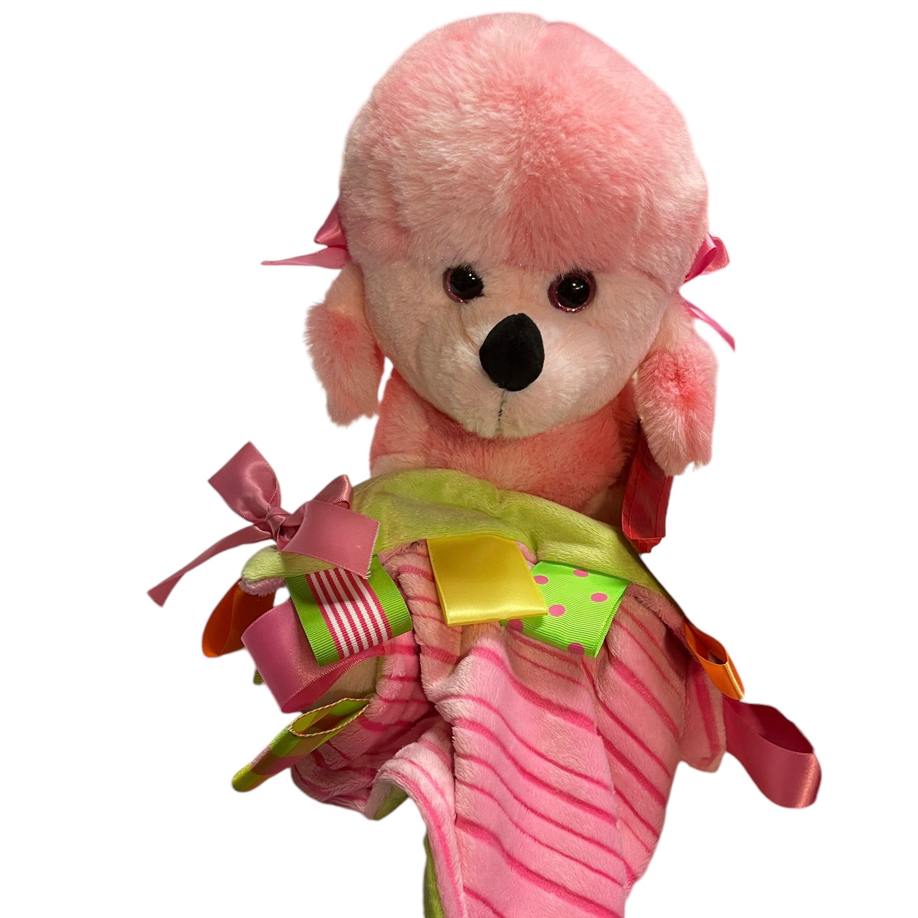 This sweet unbranded 11" seated pink poodle puppy dog plush stuffed animal toy has bright black eyes ringed in sparkly pink, and a perky black nose! Paired with a bright, handmade lime green and striped pink 12x9.5" multi-textured sensory ribbon tag lovey security blanket. A beautiful combination gift for a special little person.
