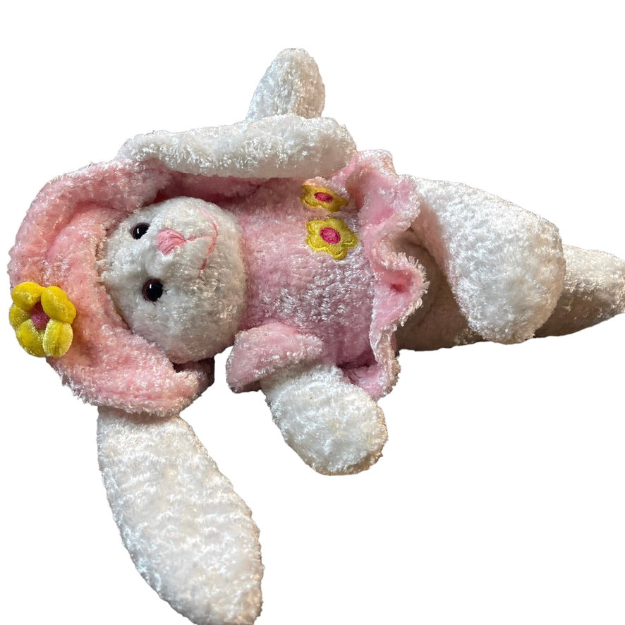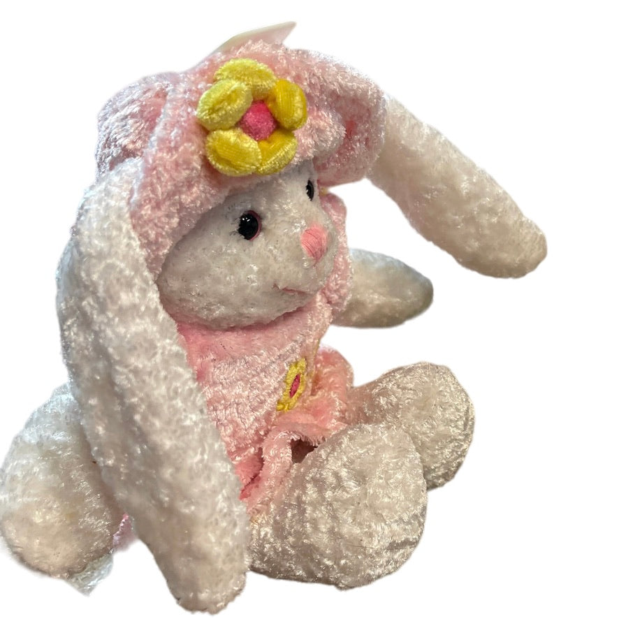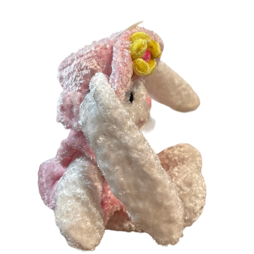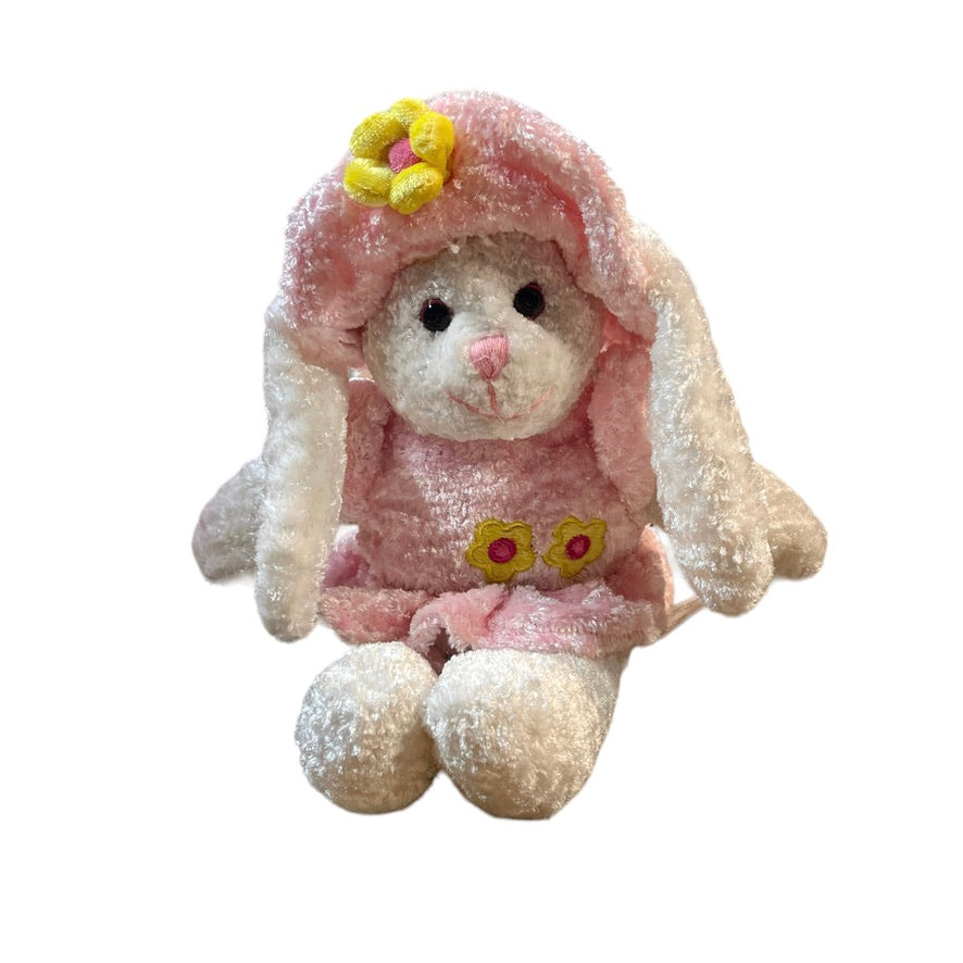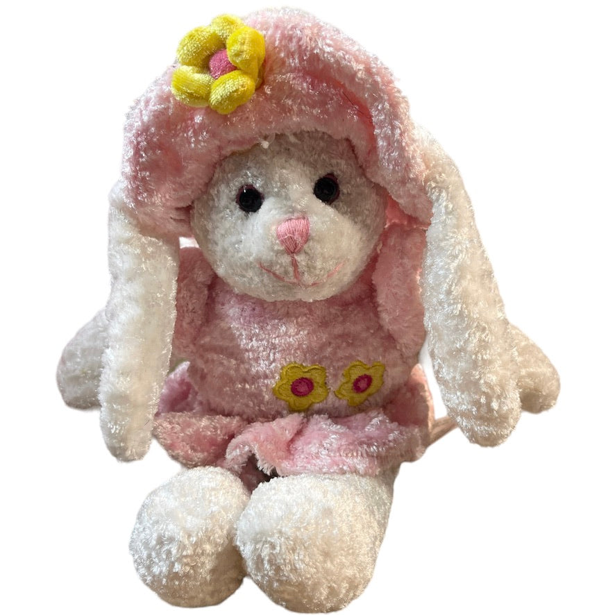 Adorable crushed velvety plush Easter Bunny Rabbit Stuffed Animal Toy in a Pink Dress and Matching Hat Adorned with Happy Yellow Flowers. This adorable textured bunny is in excellent preowned condition.