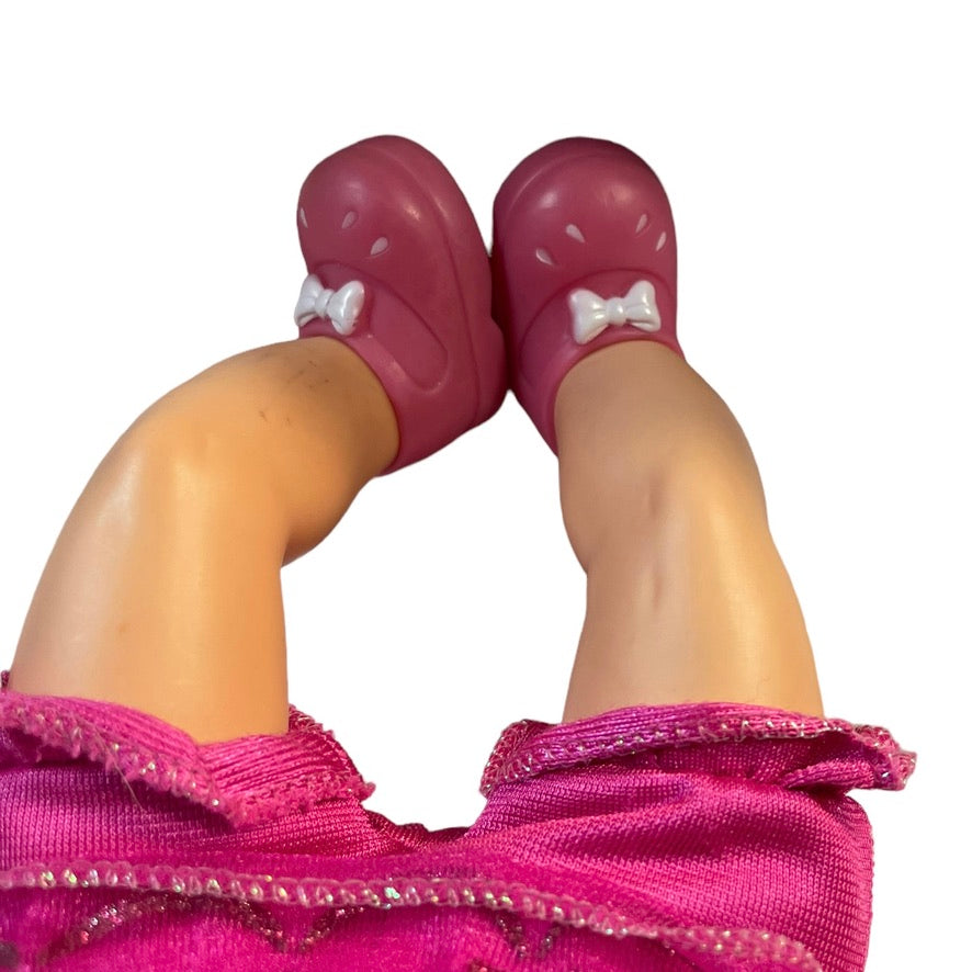 Sweet Preowned Disney Tollytots Frozen Princess Anna 12" Baby Doll in Original Outfit has a sweet smiling face and a sprinkling of freckles on her nose.