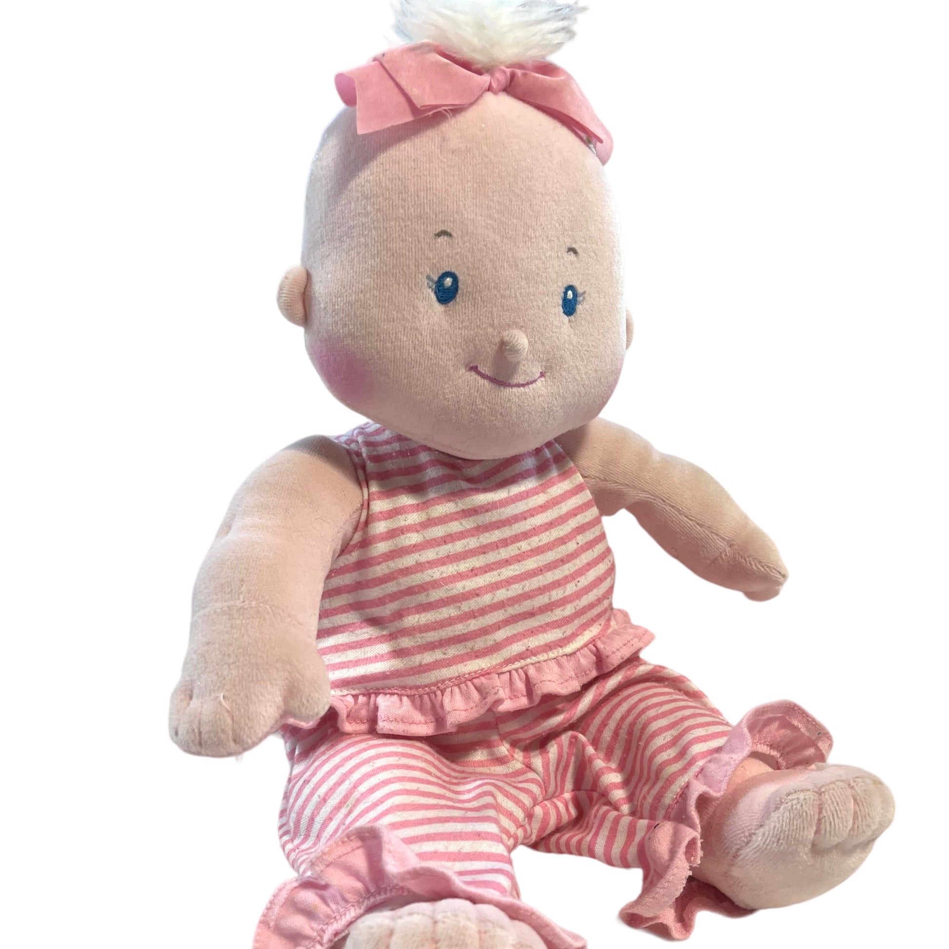 Adorable Vintage 2001 Toys R Us Soft First Doll. Embroidered Blue Eyes & Fluffy White hair with oversize hair bow, Wearing original pink striped outfit. So darn cute! EUC