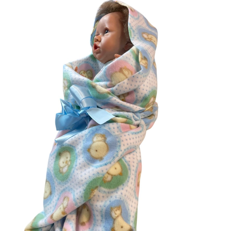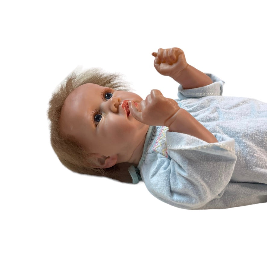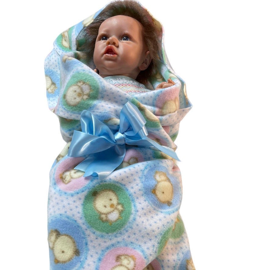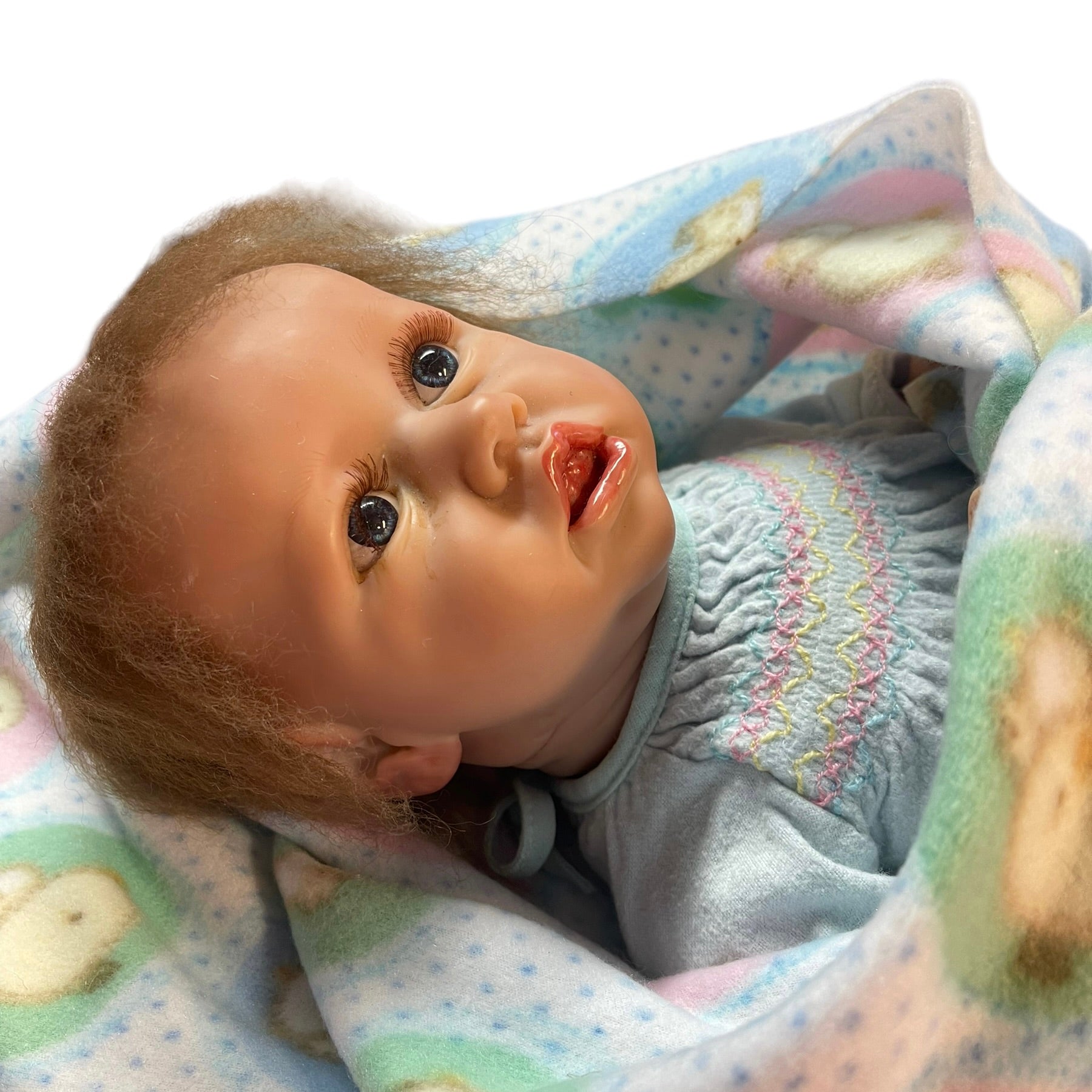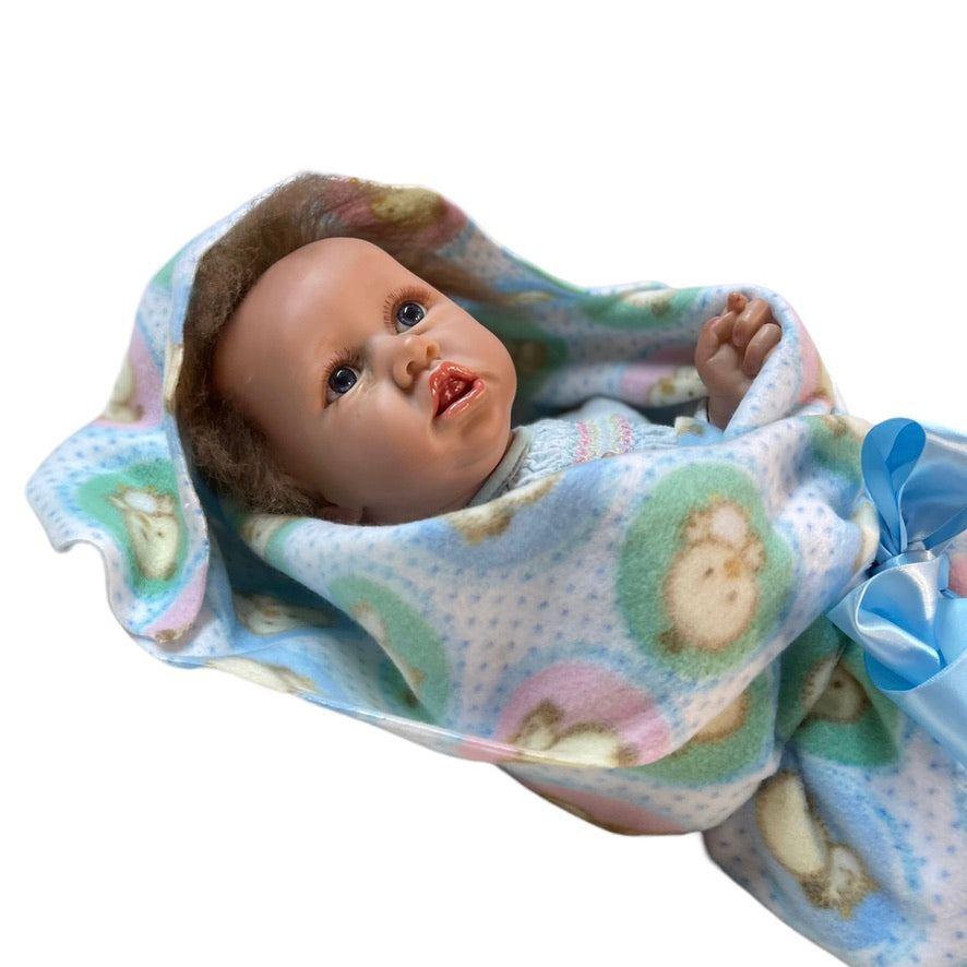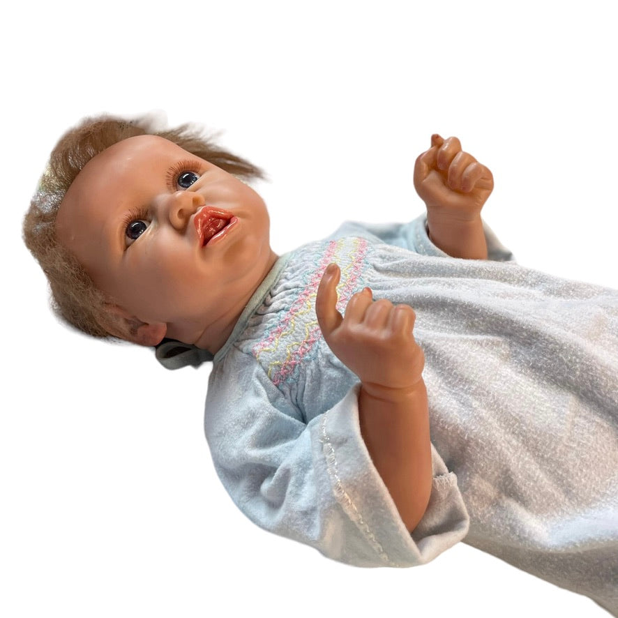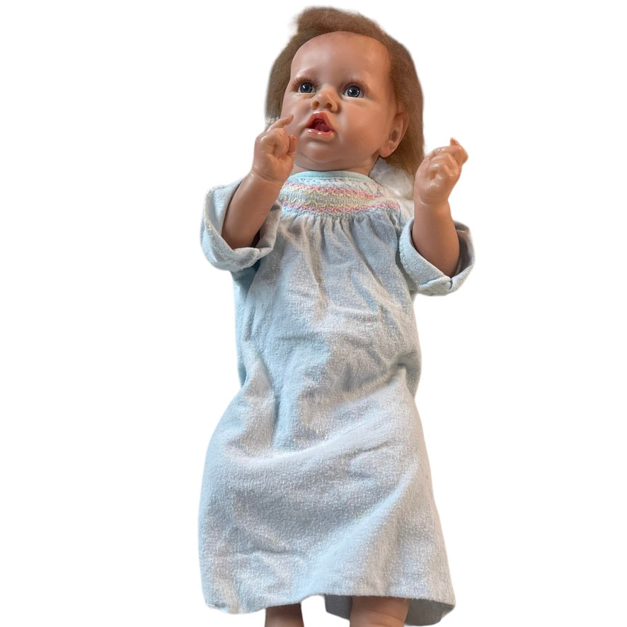 Beautifully moulded 22" Anatomically Correct Female Reborn Baby Doll dressed in a vintage smocked baby nightie and cozy fleece blanket. A very special baby.