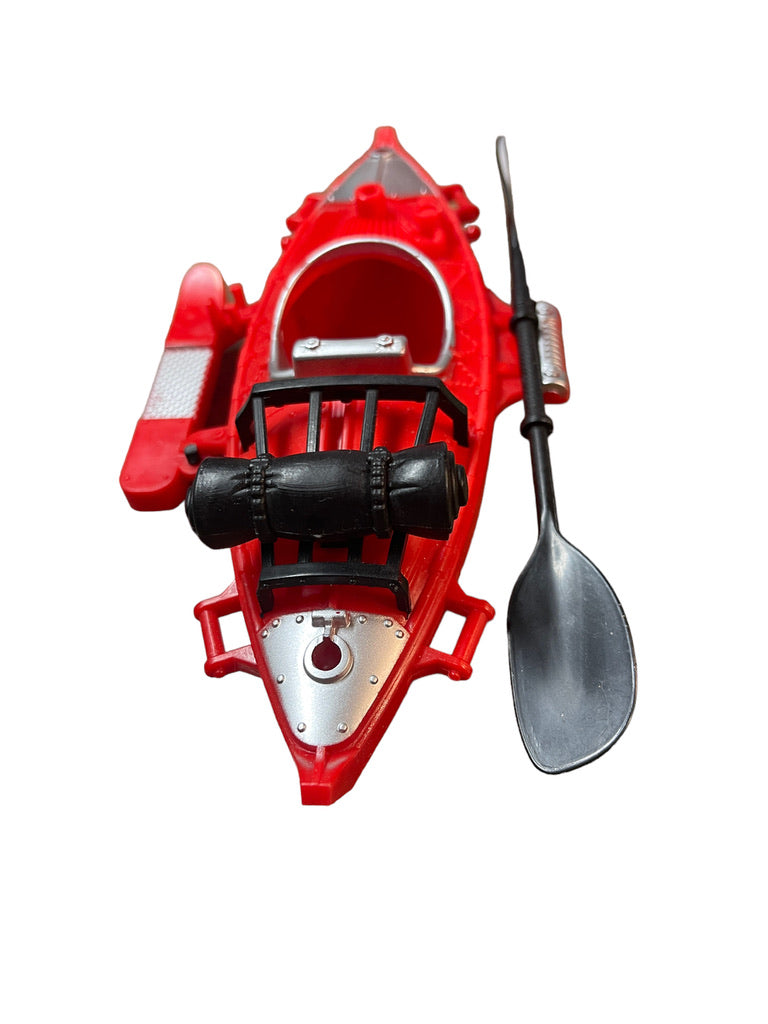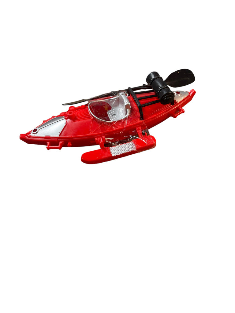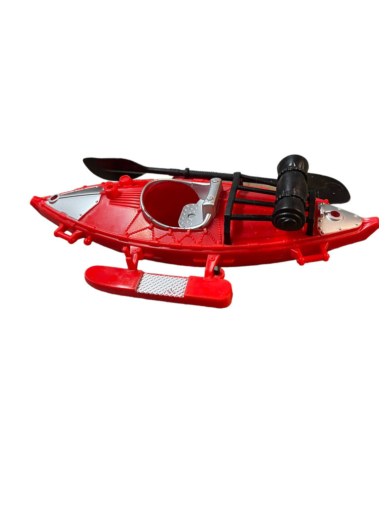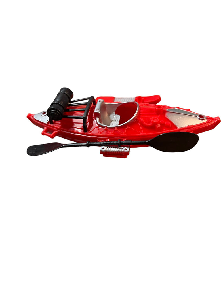 Unbranded red plastic kayak with silver & black accents and room for a small action figure! In good preowned condition.