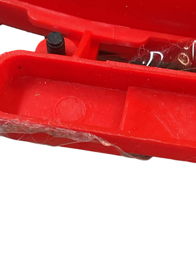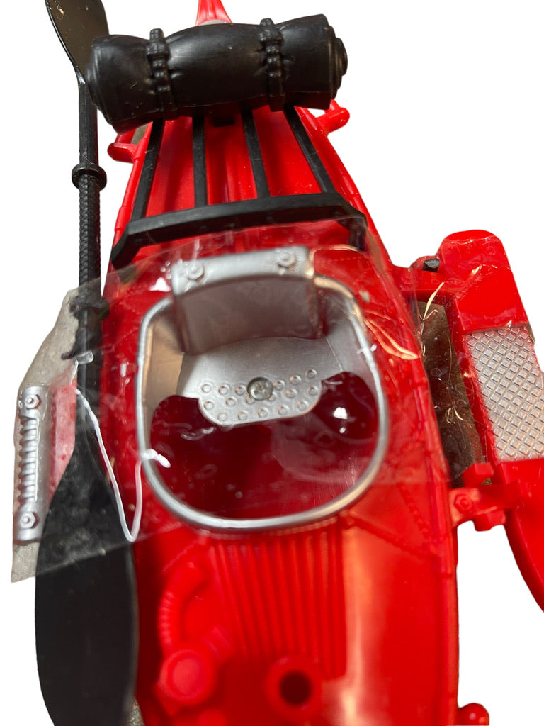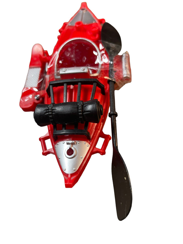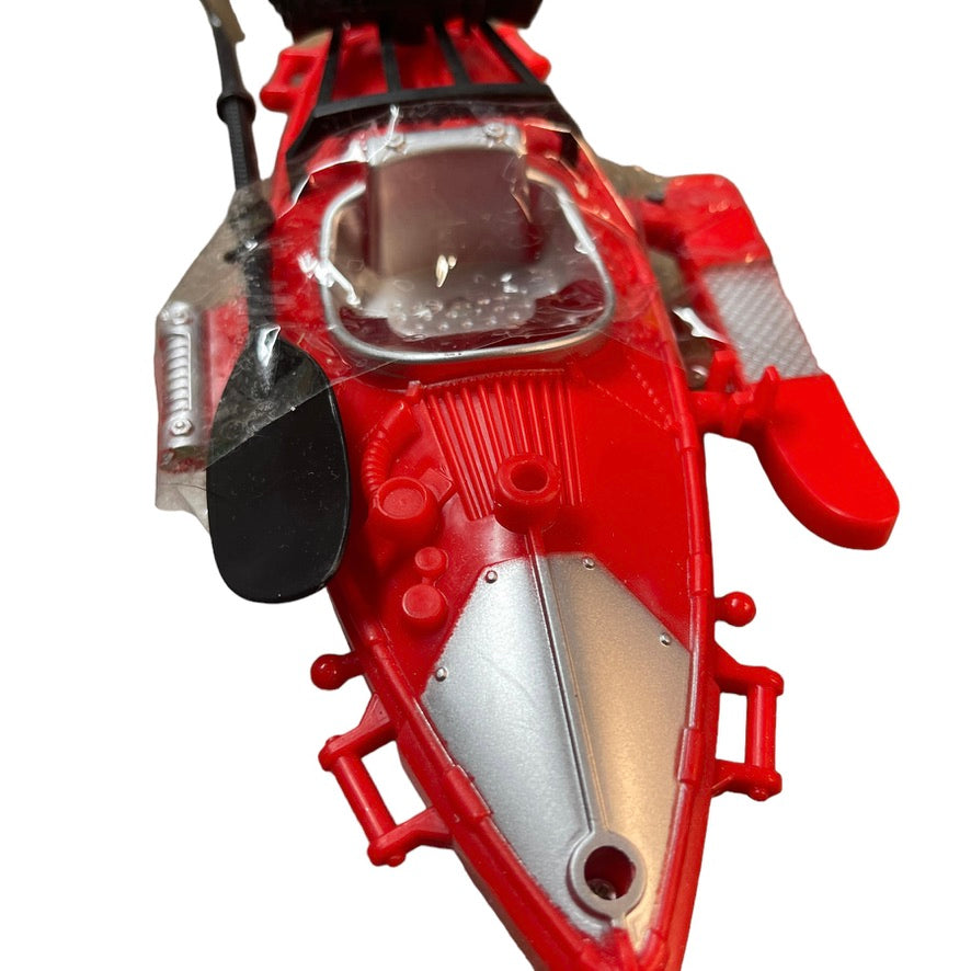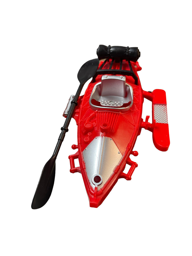 Unbranded red plastic kayak with silver & black accents and room for a small action figure! In good preowned condition.