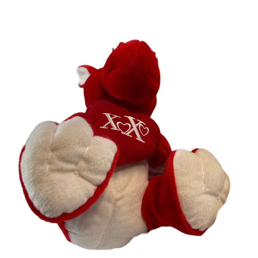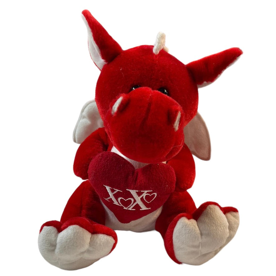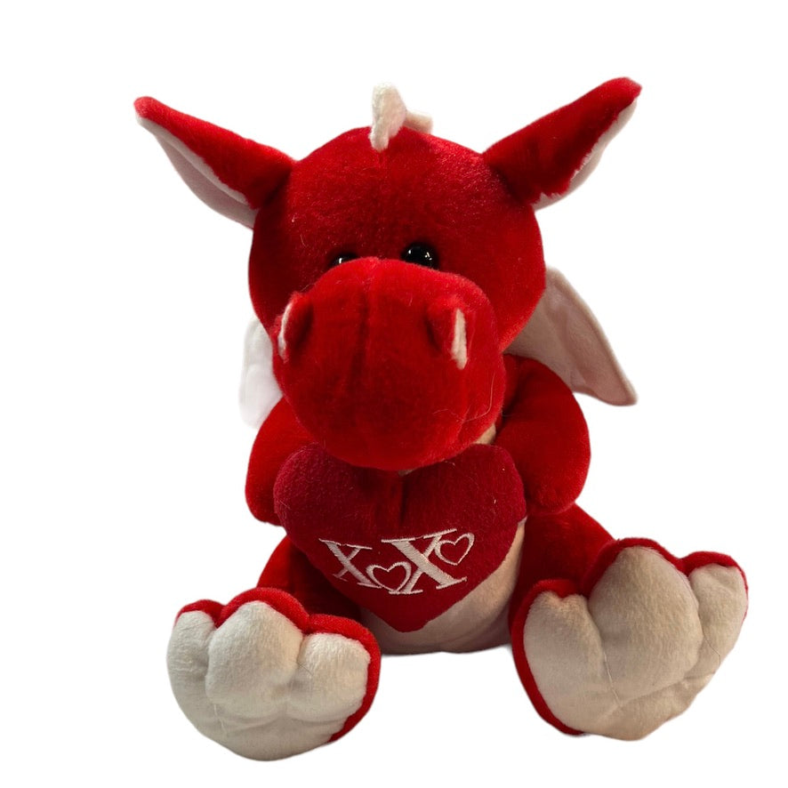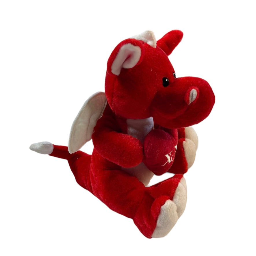 Adorable Red and White Valentine Dragon Plush Holding a Heart XoXo, White Wings and Heart on the end of its Tail. EUC. Black Bead Eyes, Unbranded.