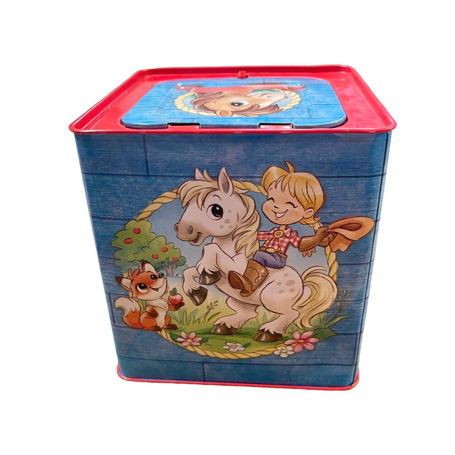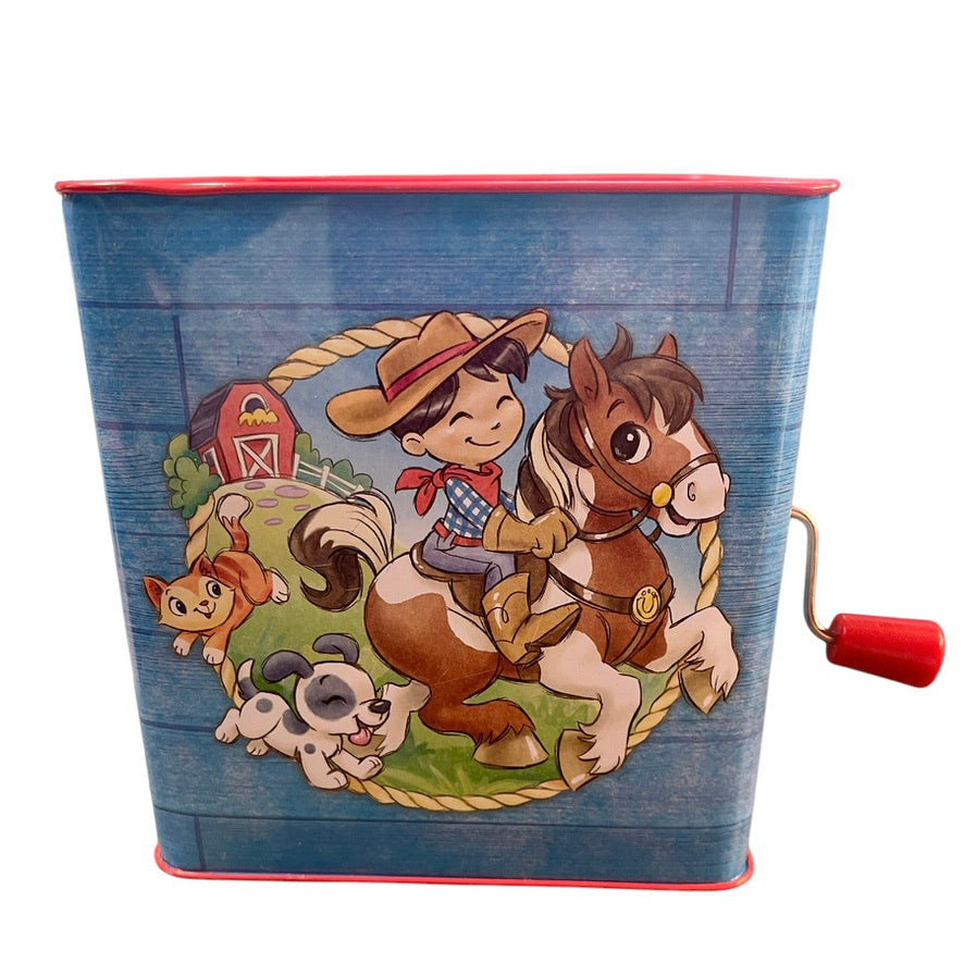 'Home on the Range', Musical Schylling tin Jack-in-the-Box is in very good preowned condition with no dents or scratches. Pretty blue background with horse and cowboy motif illustrations. Turn the crank to operate, and watch the plush horse pop up!
