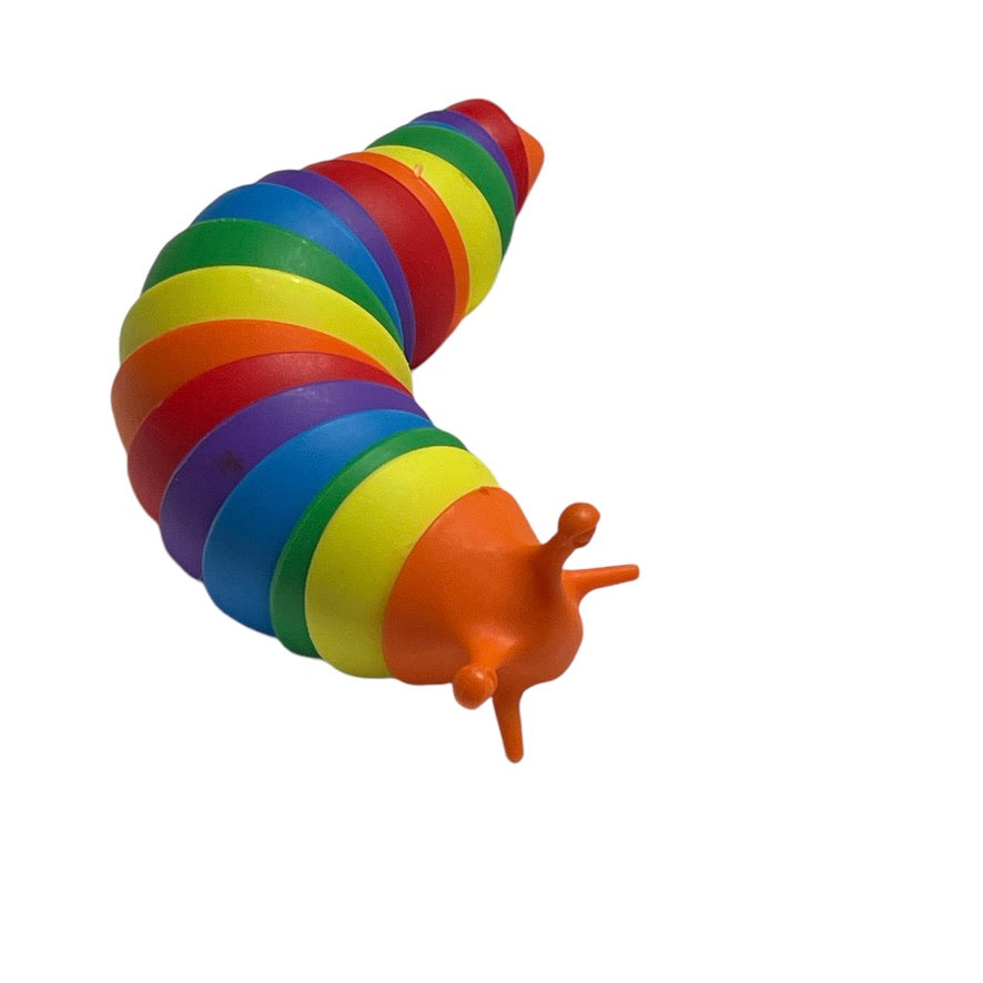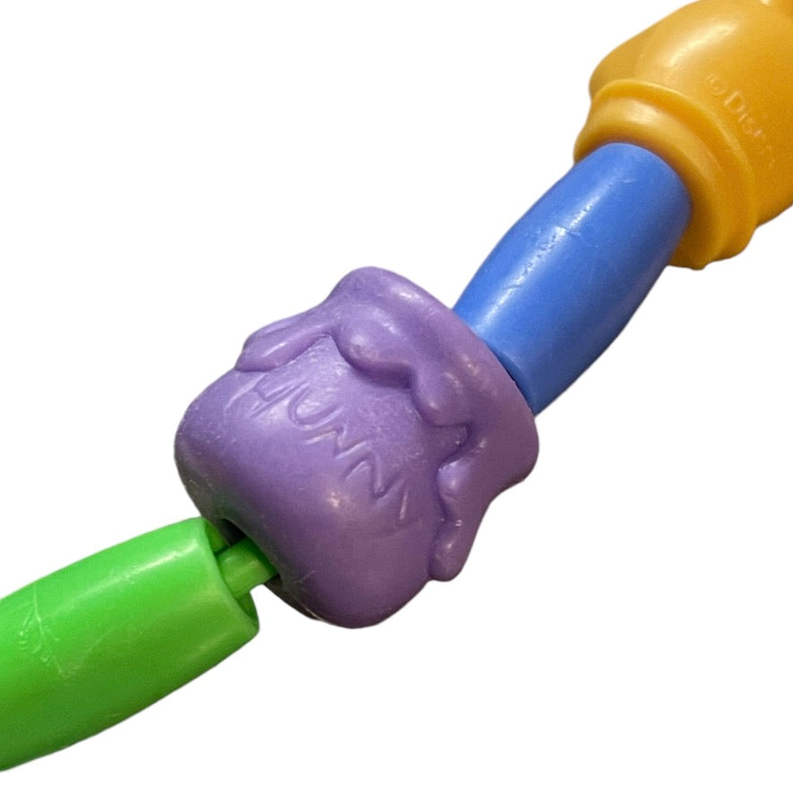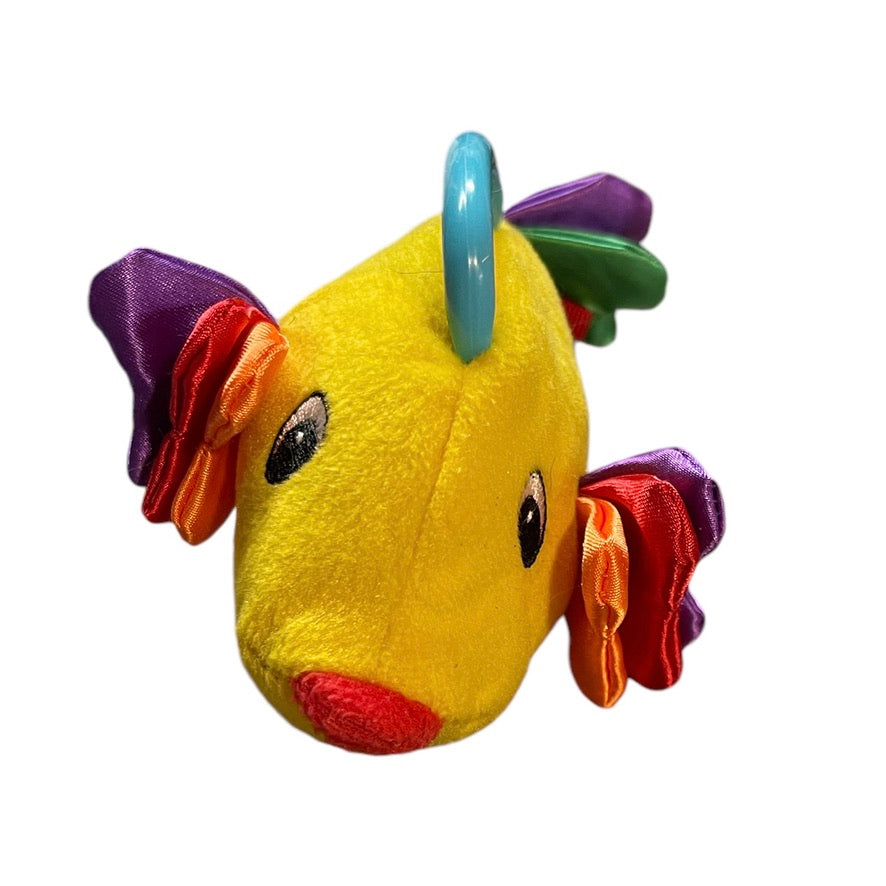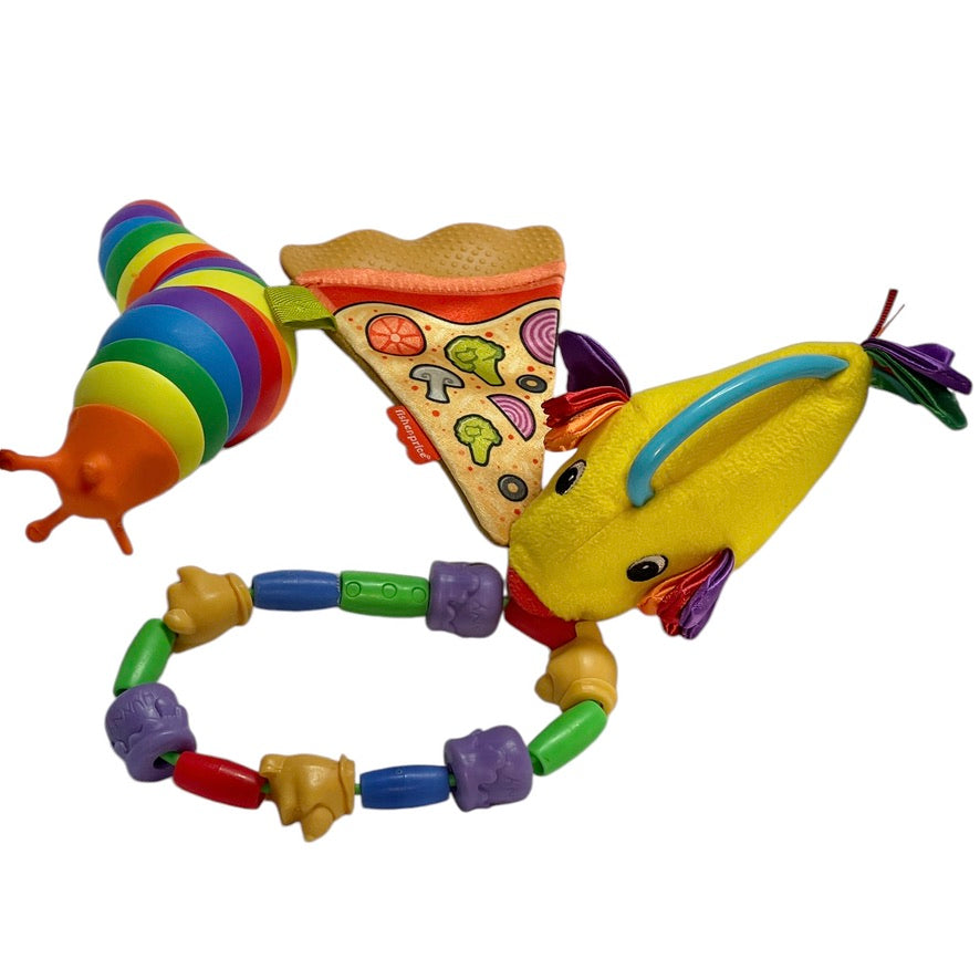A terrific mixed lot of sensory, teething & fidget toys for babies and toddlers, including a Disney Winnie the Pooh Teething ring , a great chewy & crinkly piece of Fisher-Price Pizza, a wonderfully colourful and squiggly, wiggly Rainbow Fidget Slug, and a yellow plush ribbon fish with multi-coloured/textured ribbons, all in great preowned condition.
