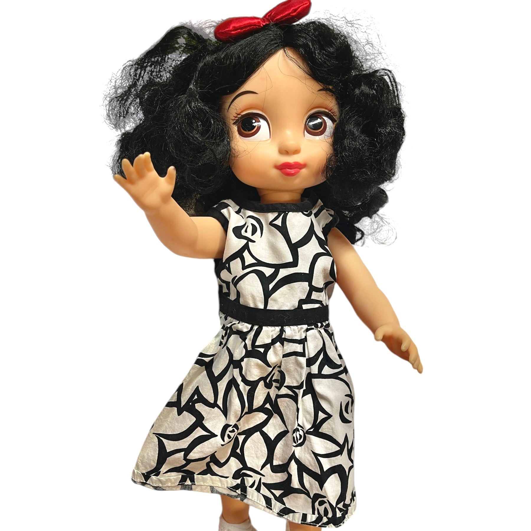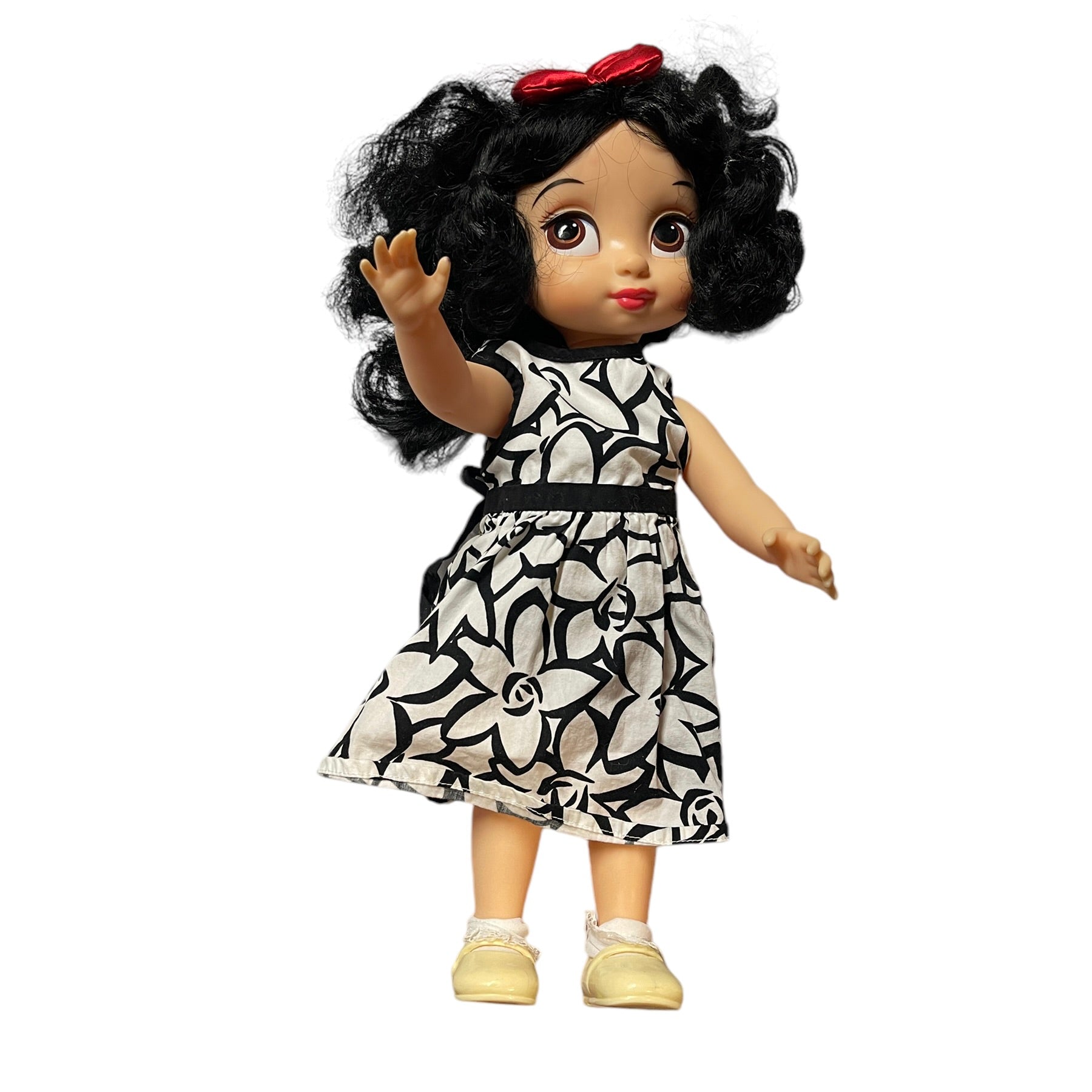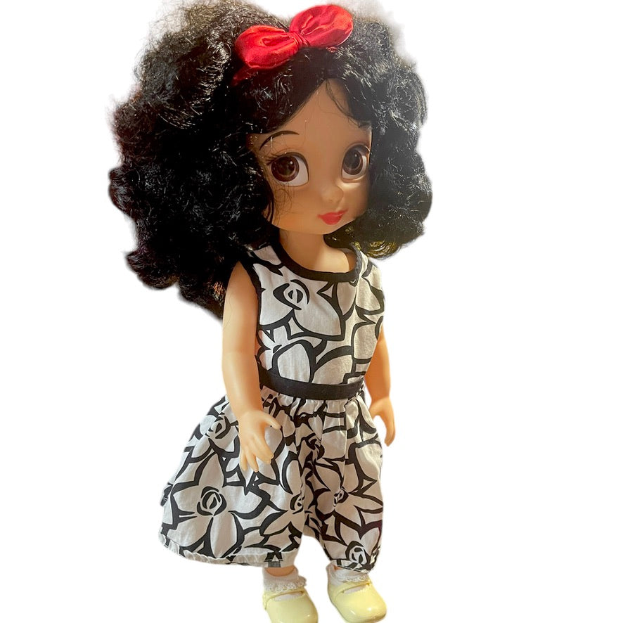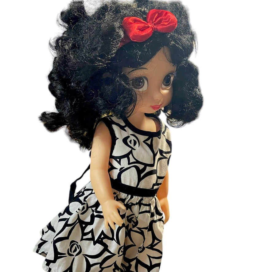 Absolutely Beautiful Snow White Animator Princess Toddler Doll with Classic Black Curls & Bright Red Lips. HerRed Hair Bow. contrasts nicely with her pretty black & white print dress. He4r outfit is completed with white ruffled socks and cute Mary Jane Shoes. She is in Great Preloved Condition.