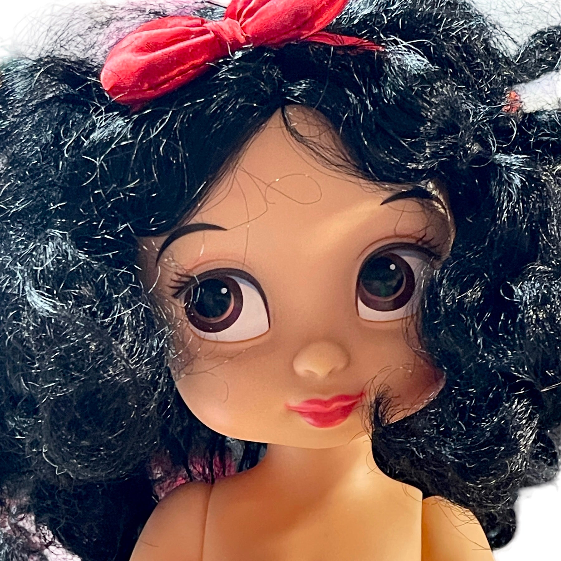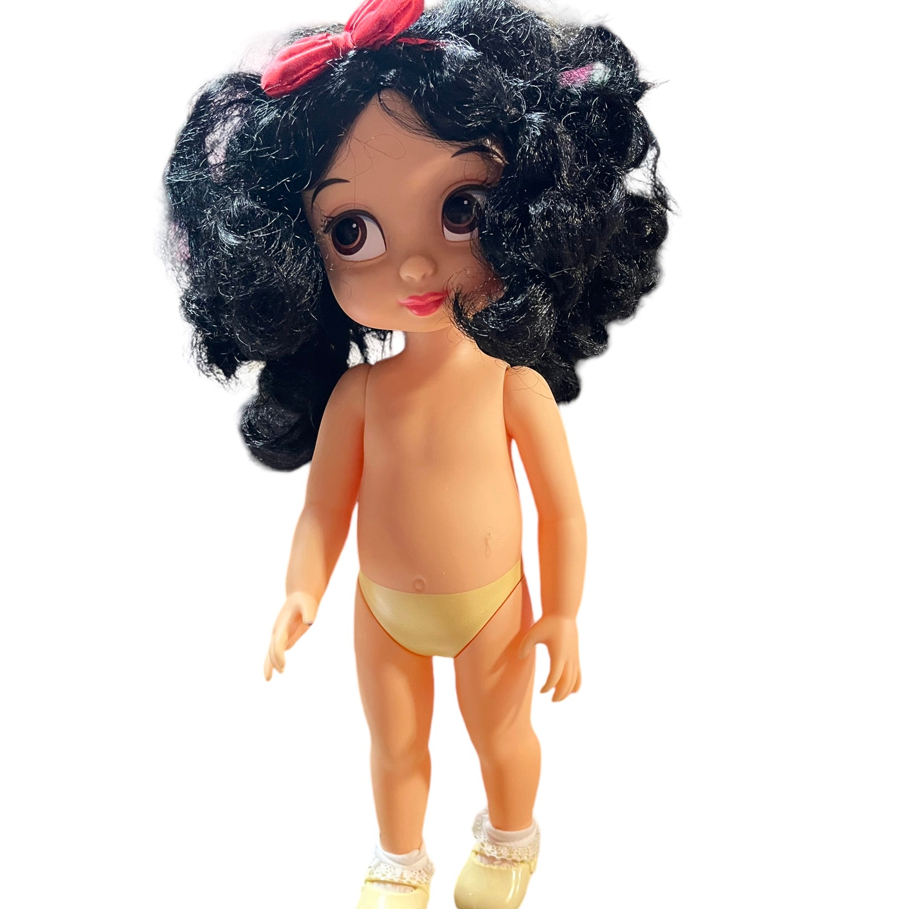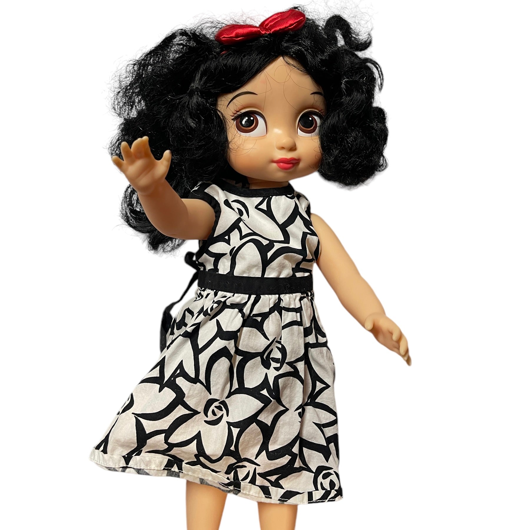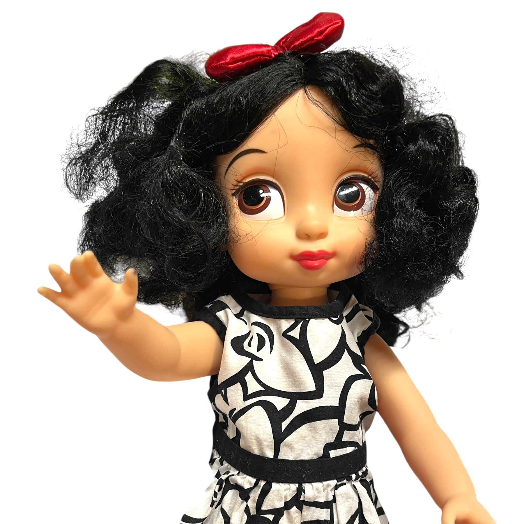 Absolutely Beautiful Snow White Animator Princess Toddler Doll with Classic Black Curls & Bright Red Lips. HerRed Hair Bow. contrasts nicely with her pretty black & white print dress. He4r outfit is completed with white ruffled socks and cute Mary Jane Shoes. She is in Great Preloved Condition.