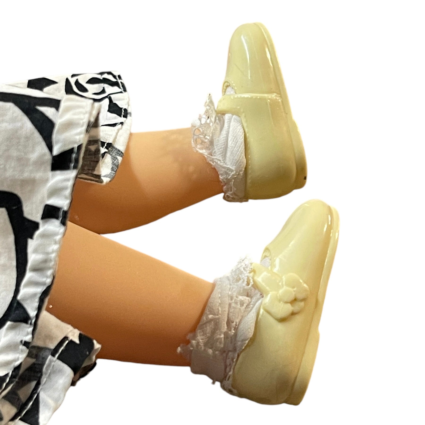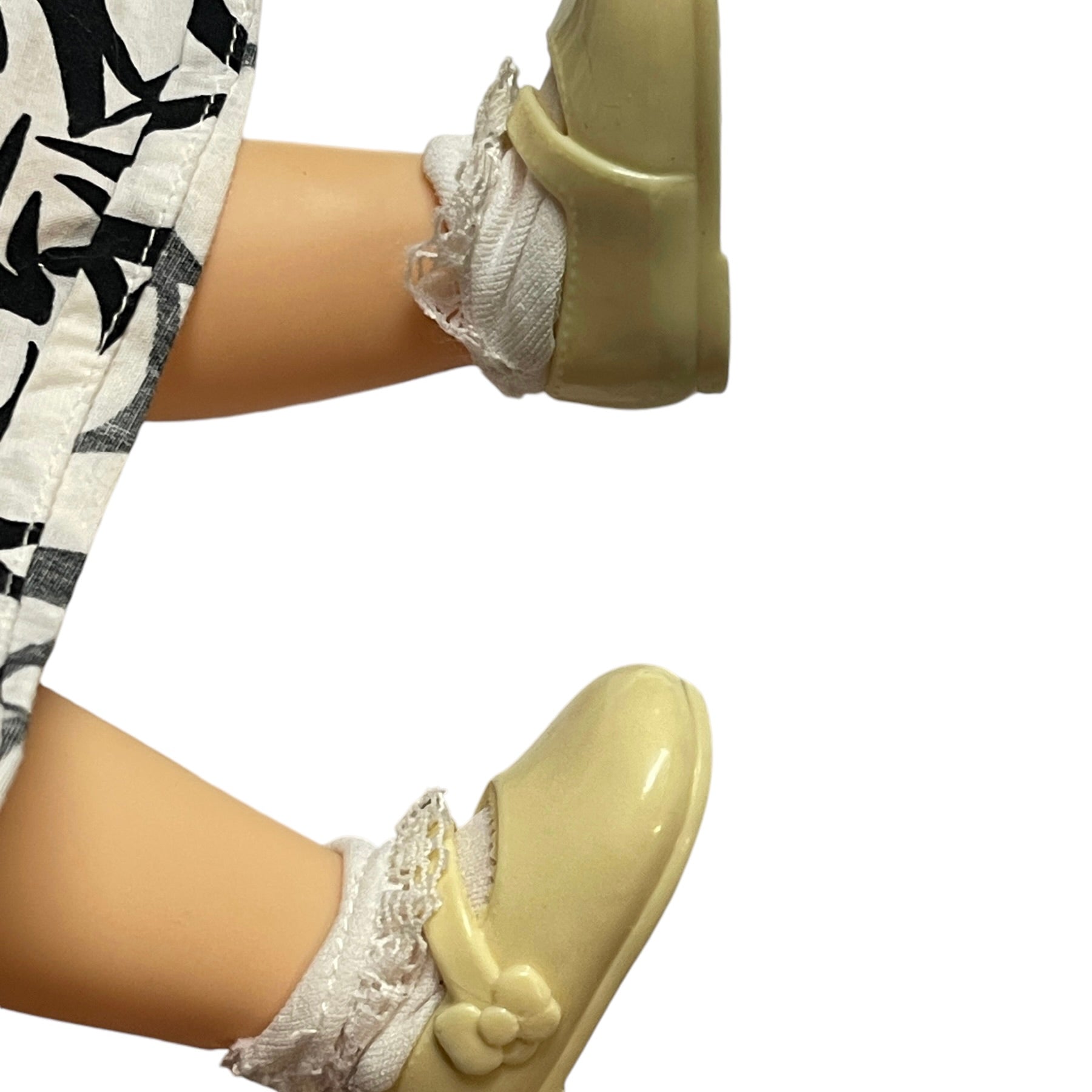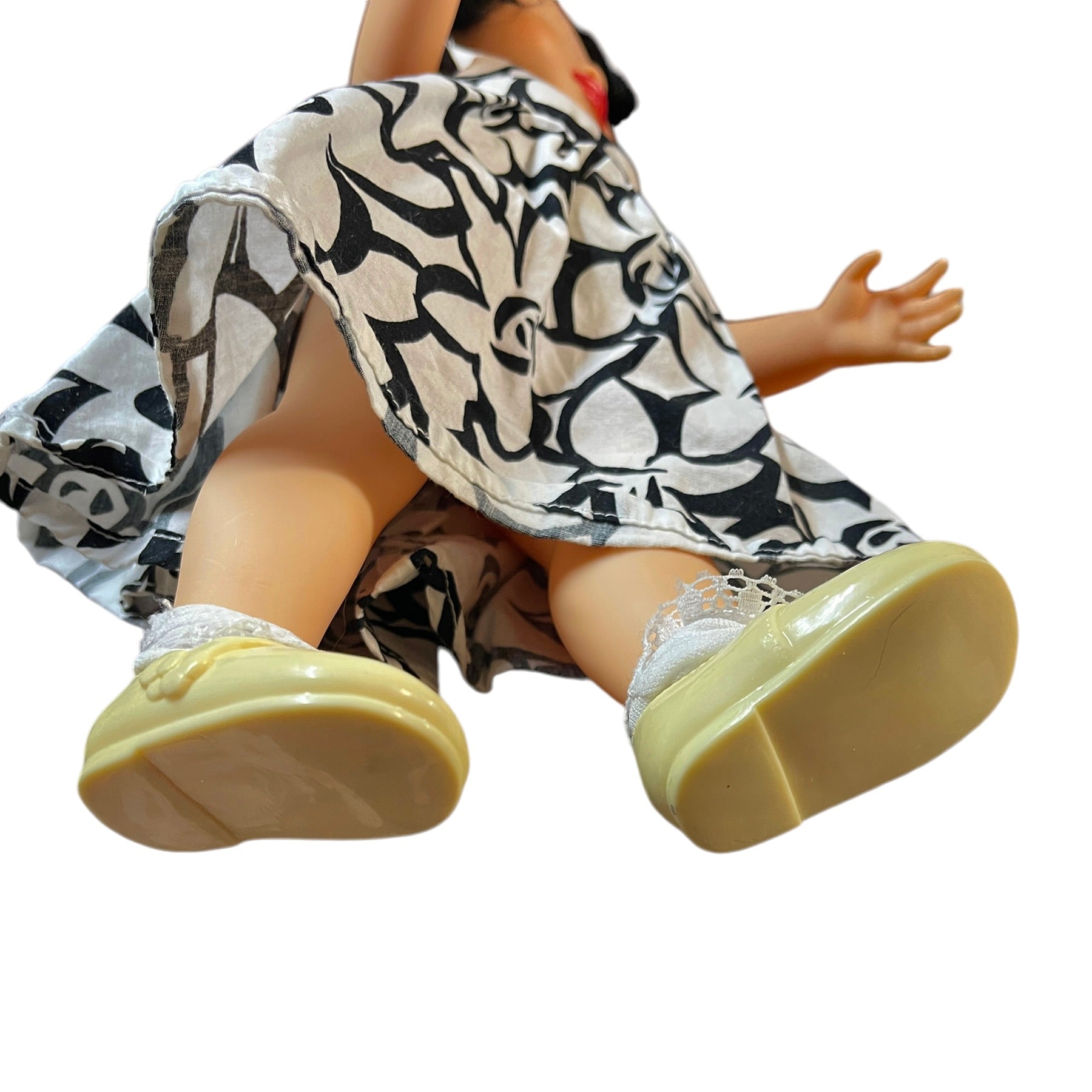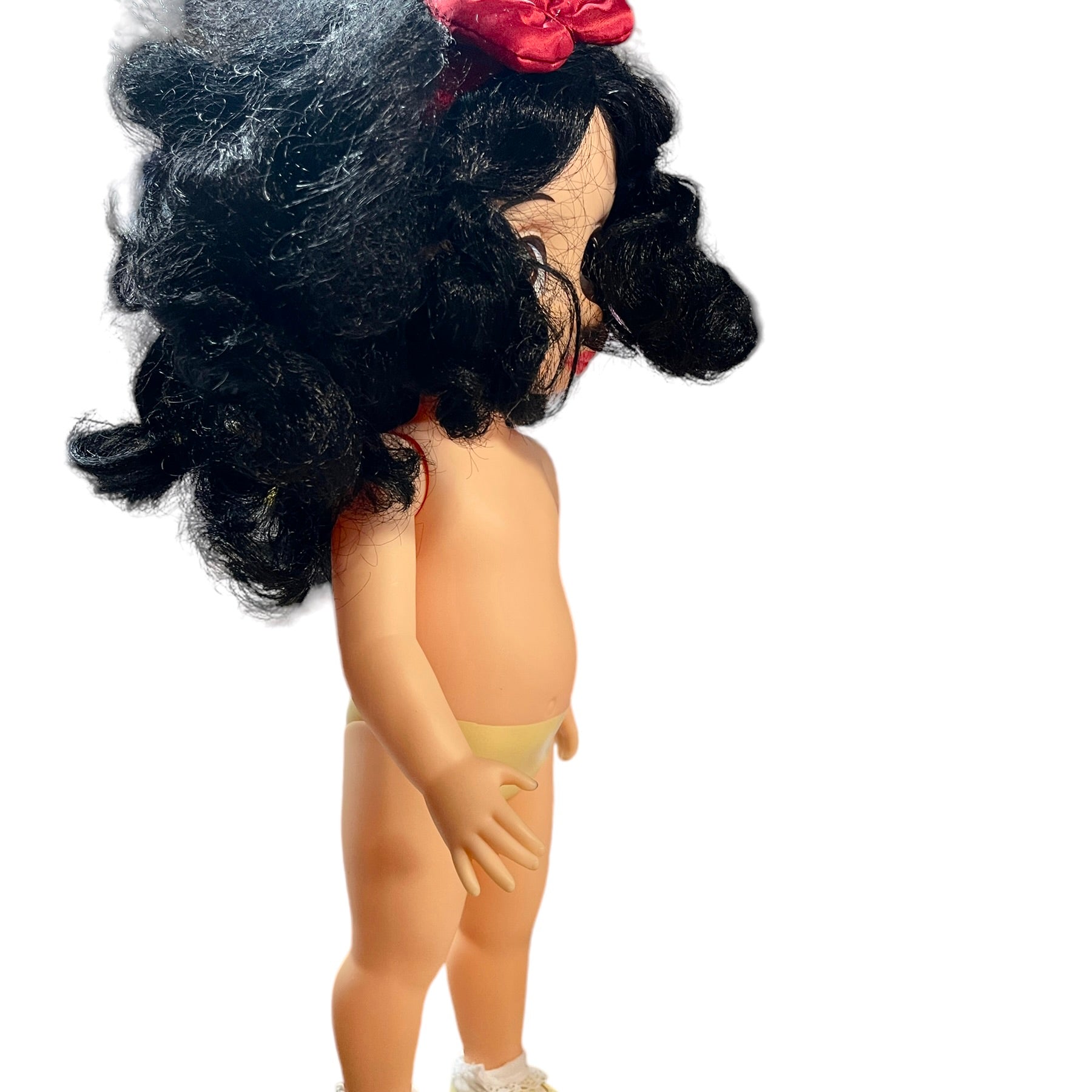 Absolutely Beautiful Snow White Animator Princess Toddler Doll with Classic Black Curls & Bright Red Lips. HerRed Hair Bow. contrasts nicely with her pretty black & white print dress. He4r outfit is completed with white ruffled socks and cute Mary Jane Shoes. She is in Great Preloved Condition.
