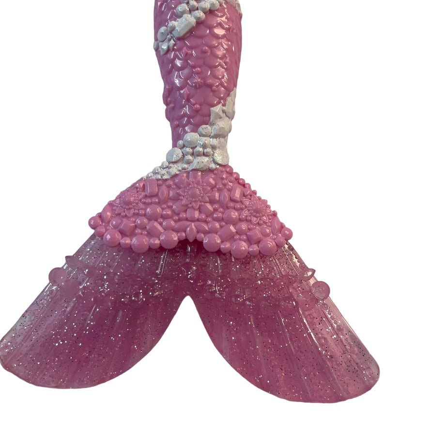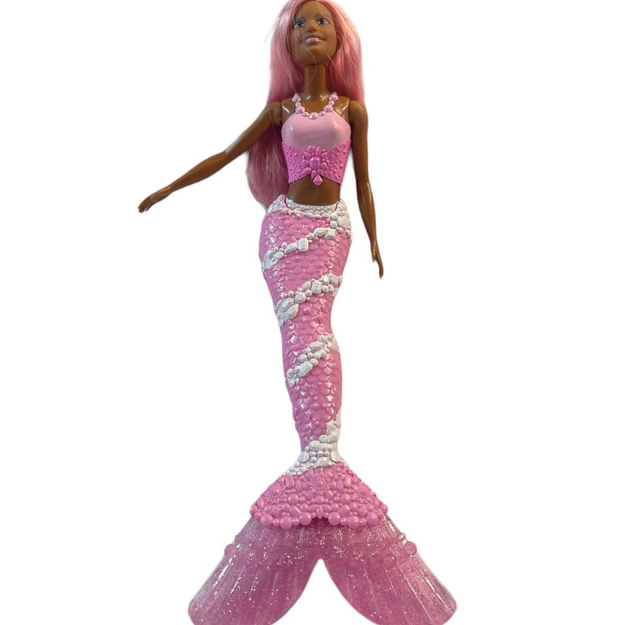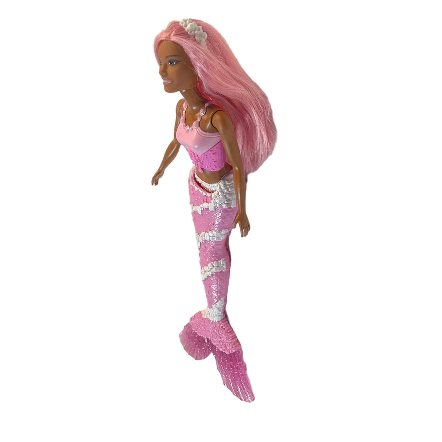 Mattel Dreamtopia Mermaid Barbie, for play on land or in water! This lovely doll is dressed in pink with a white floral headband & gorgeous pink lacy fins that look like jewels encircled with sparkly white seashells. Her long pink hair, pretty dark complexion and brown eyes make this lovely doll a beautiful addition to your collection.