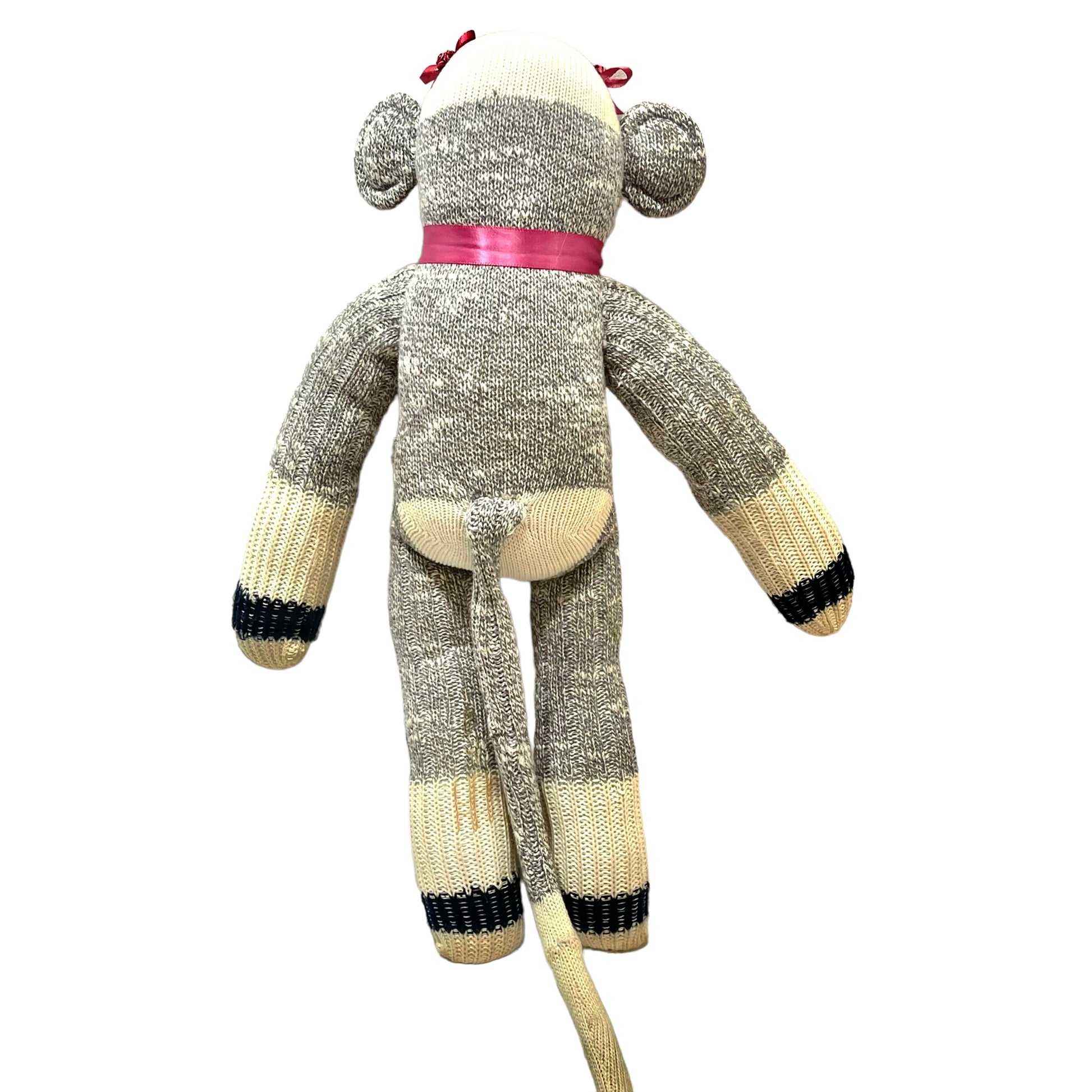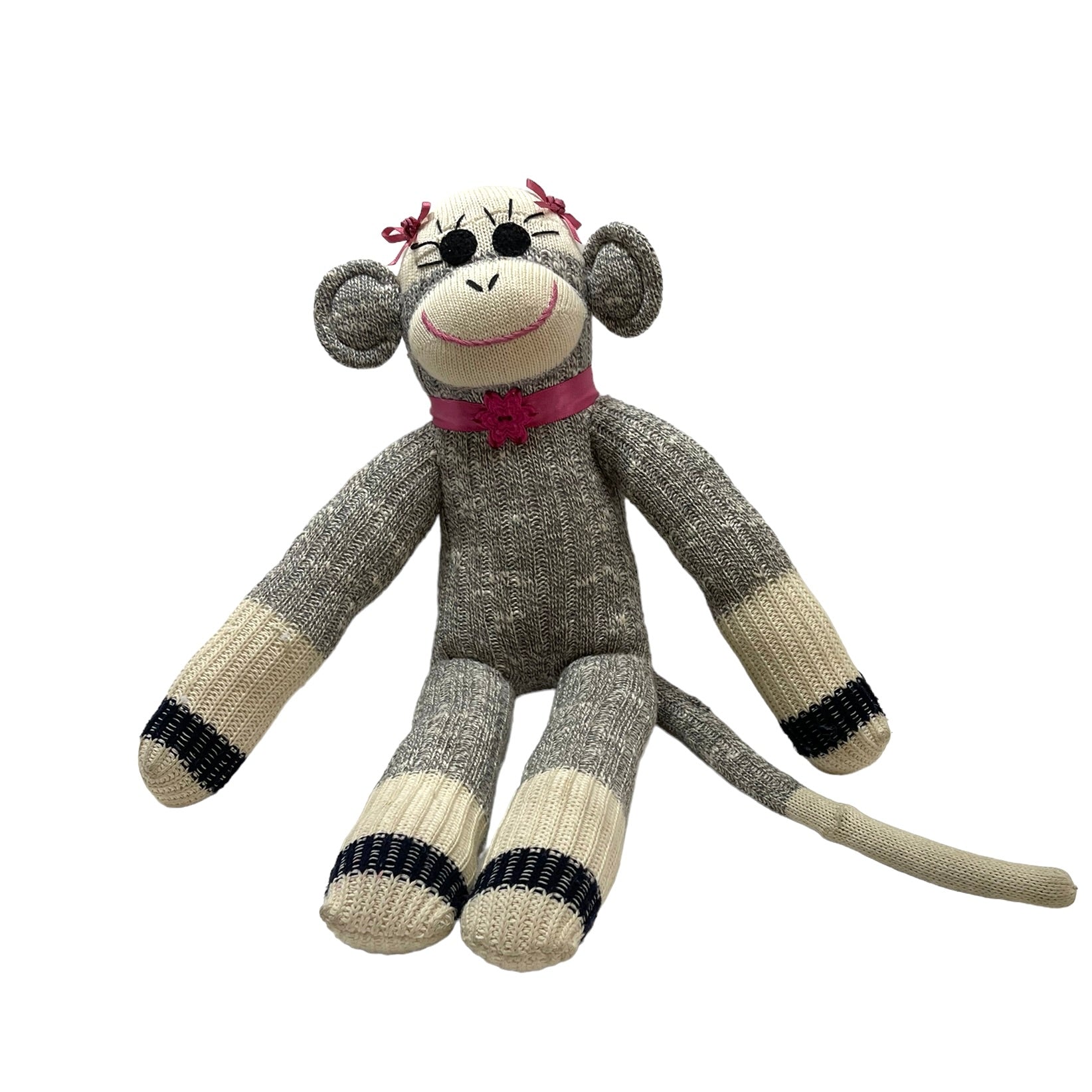 Adorable Grey/Cream/Magenta 16" Sock Monkey, Long Lashes, Pink Bows with Rosettes & Choker