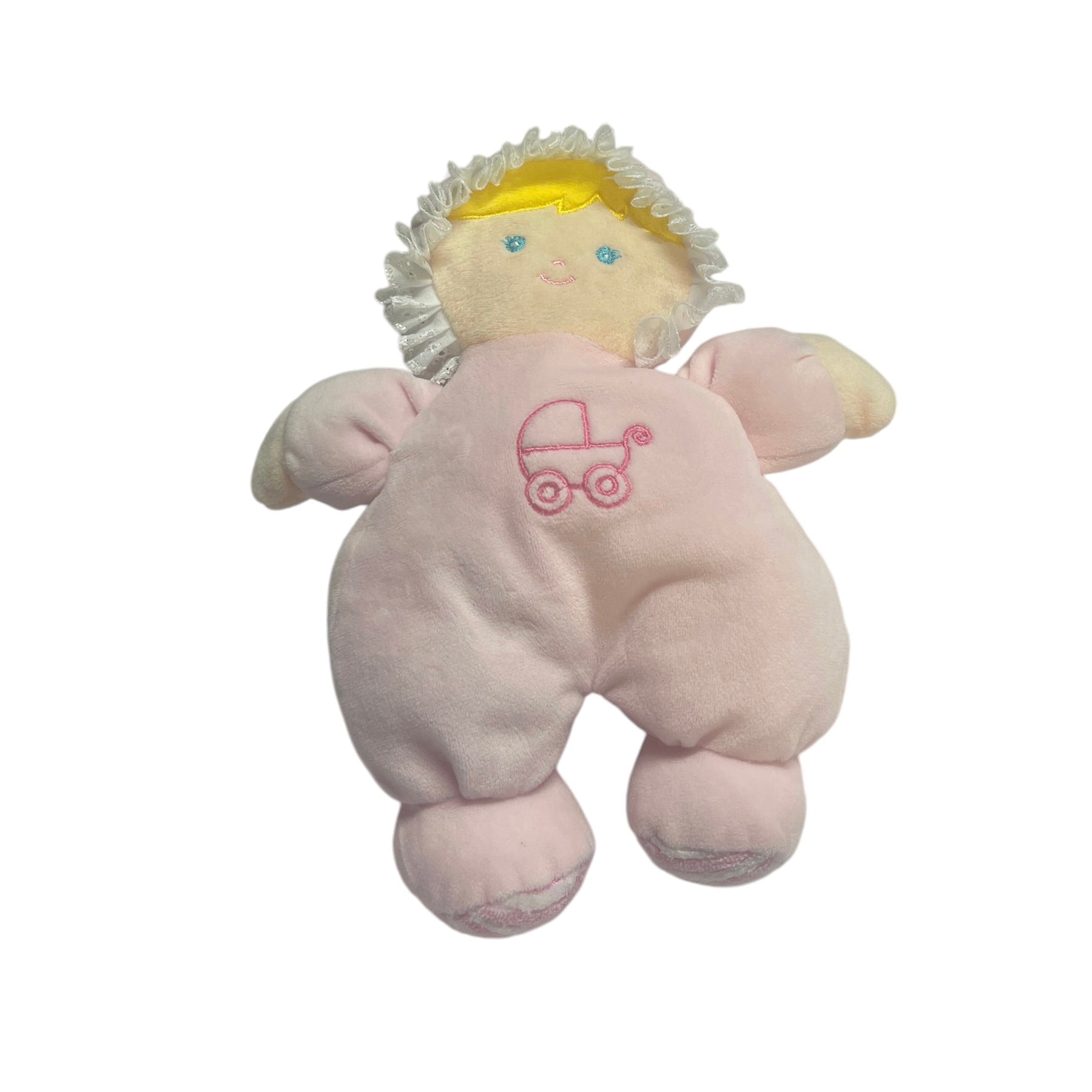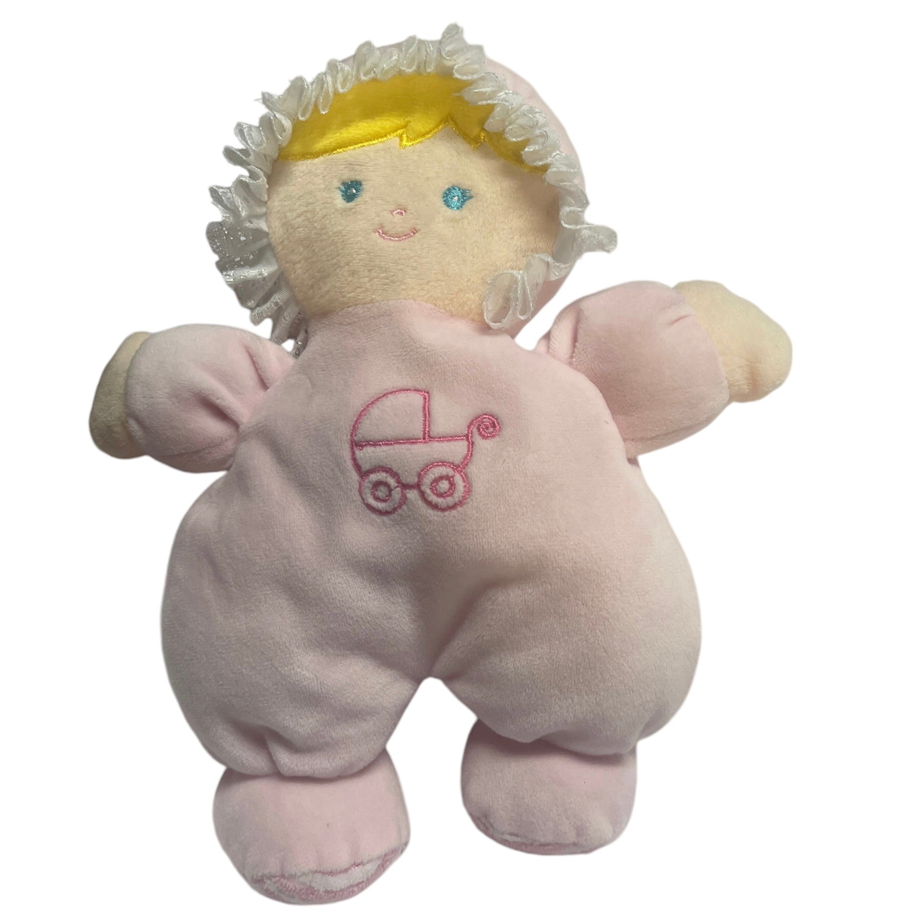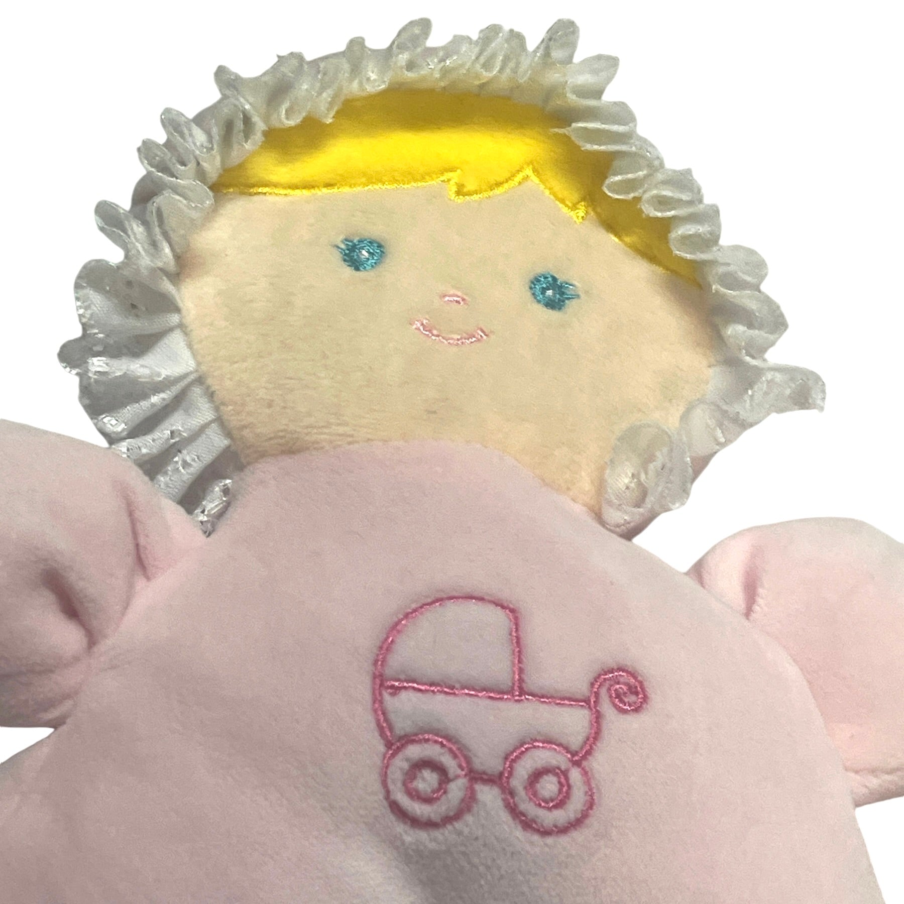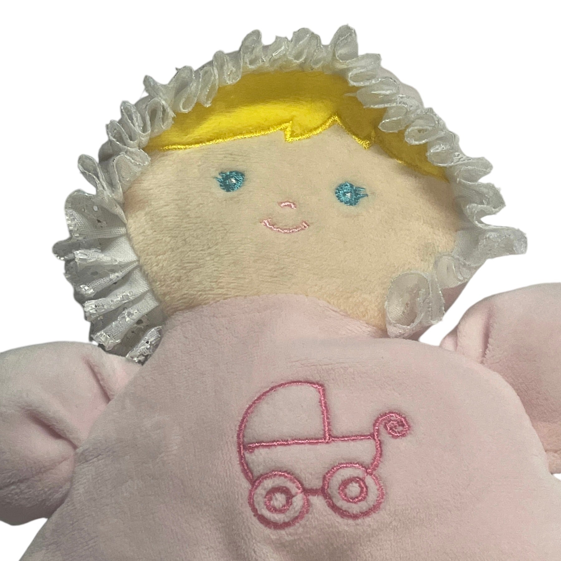 Soft Pink Plush Velvety Baby Doll Rattle, Lace Ruffled Bonnet, Embroidered Face & Carriage on Belly
