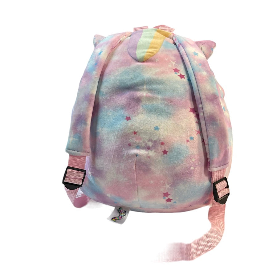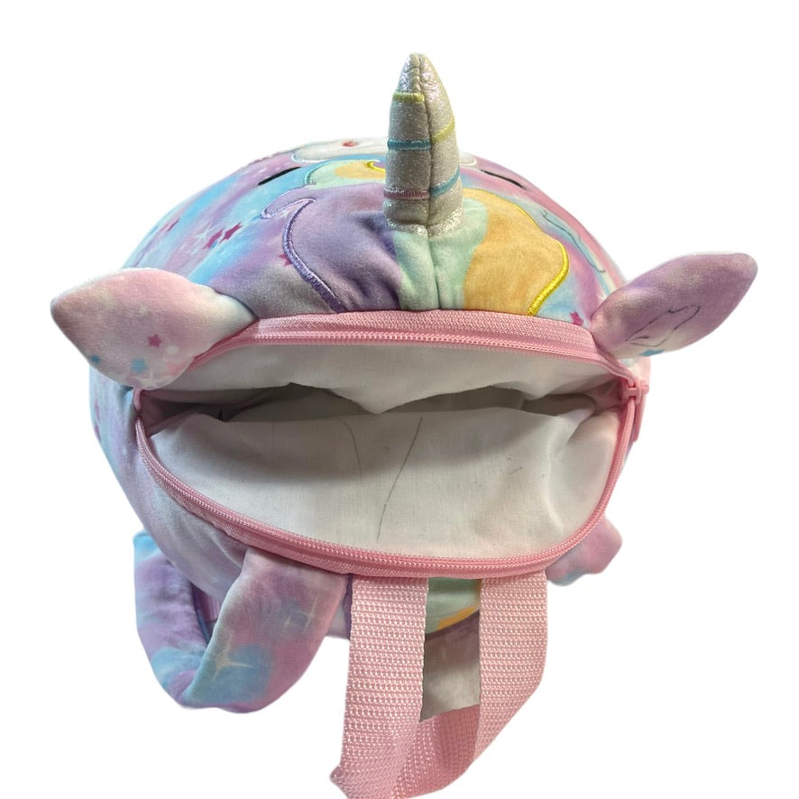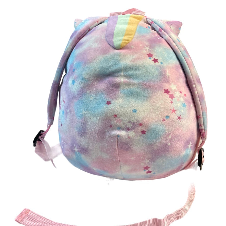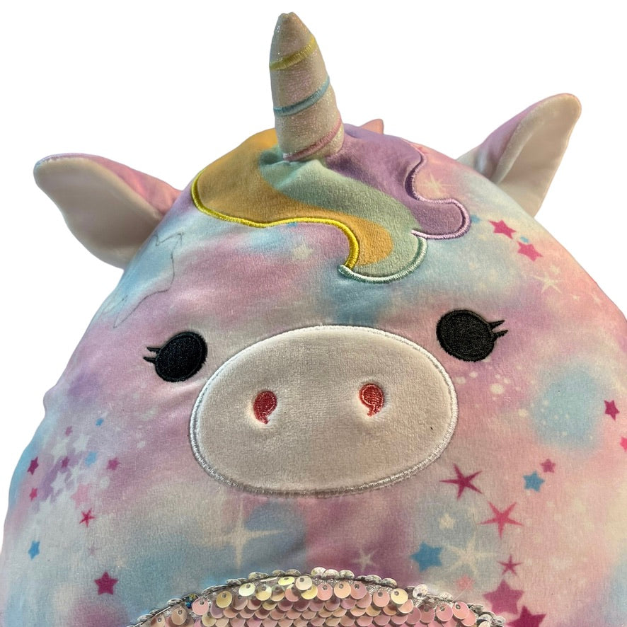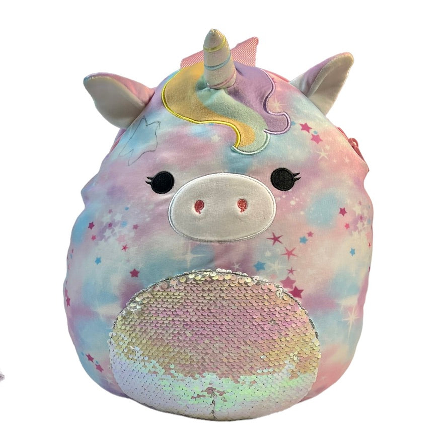 This adorable Squishmallow Unicorn Backpack/Pyjama Bag Stuffed Plush does triple duty as a toy, a pillow. and a backpack. Two way sequins on belly . EUC