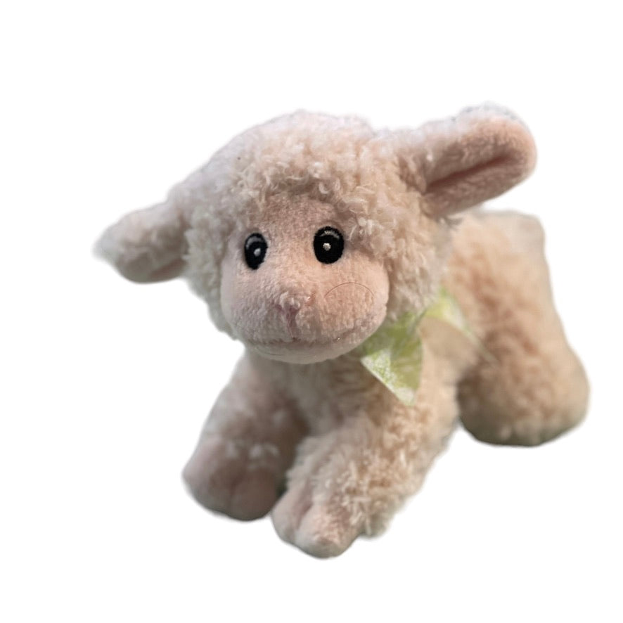 Sweet Baby Lamb, 6", Embroidered Face, Sheer Green Bow. Bean Bottom with Faded Tag