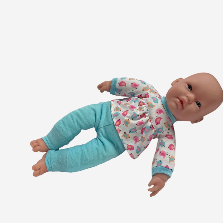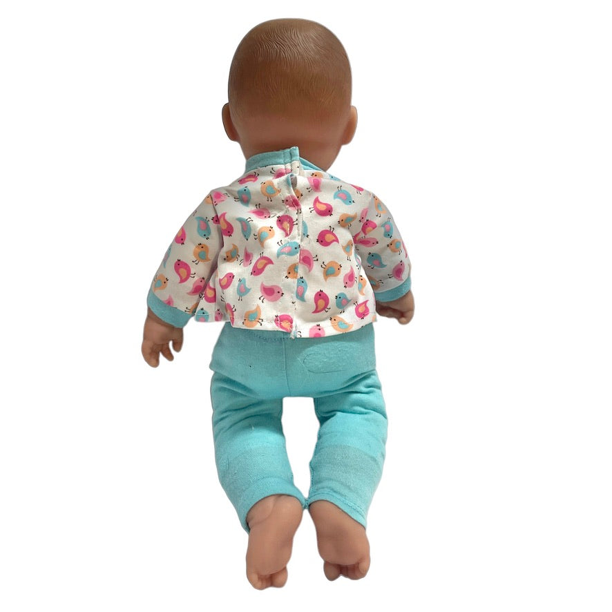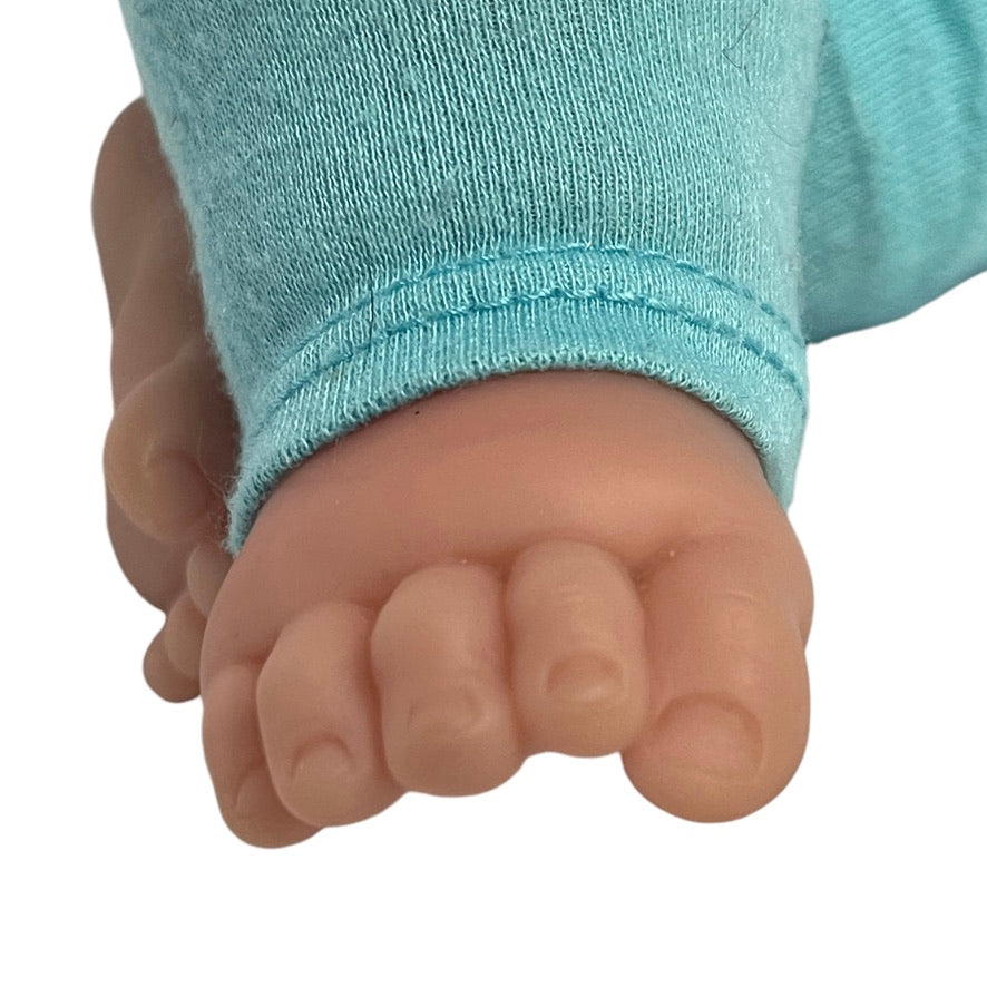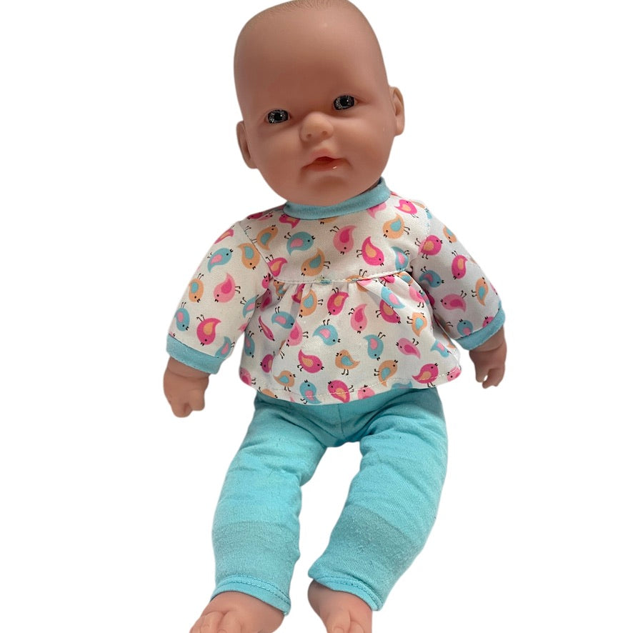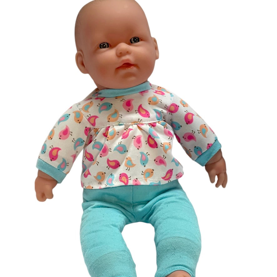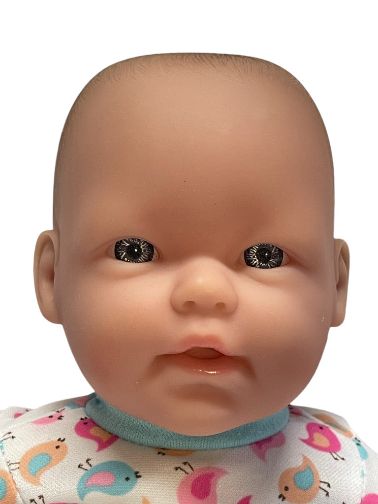 Such a lovely baby, wearing an aqua outfit with a pastel bird print. This 16" vinyl baby doll is nicely detailed and in excellent preowned condition. Missing tag