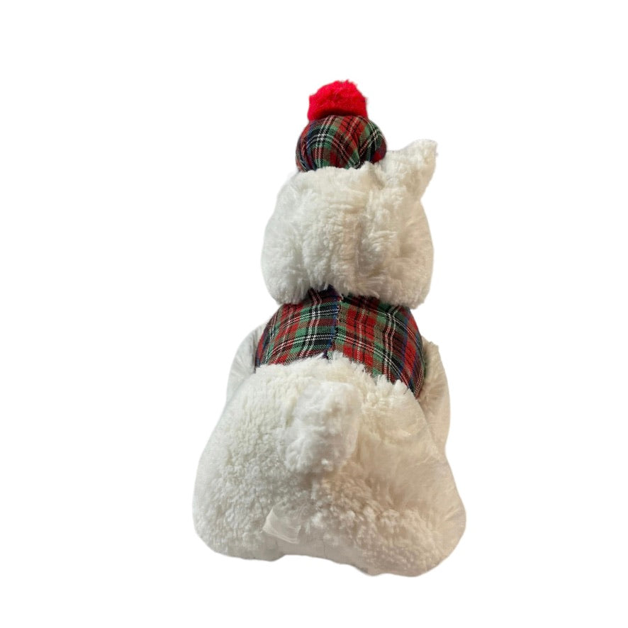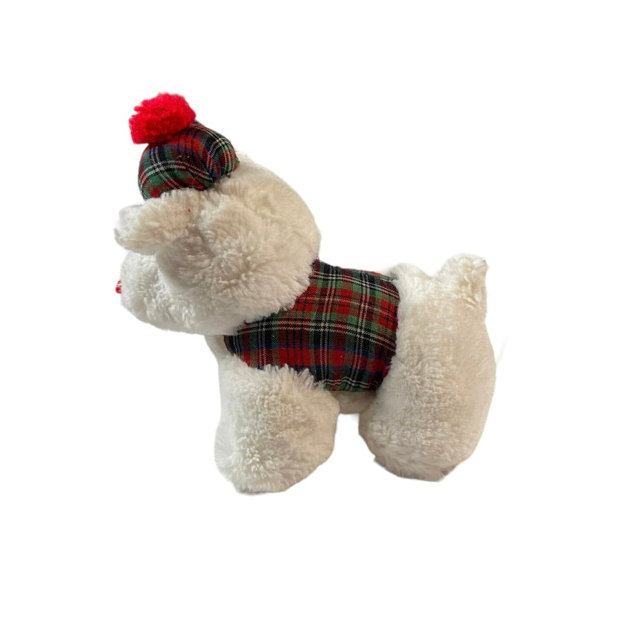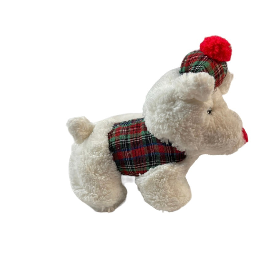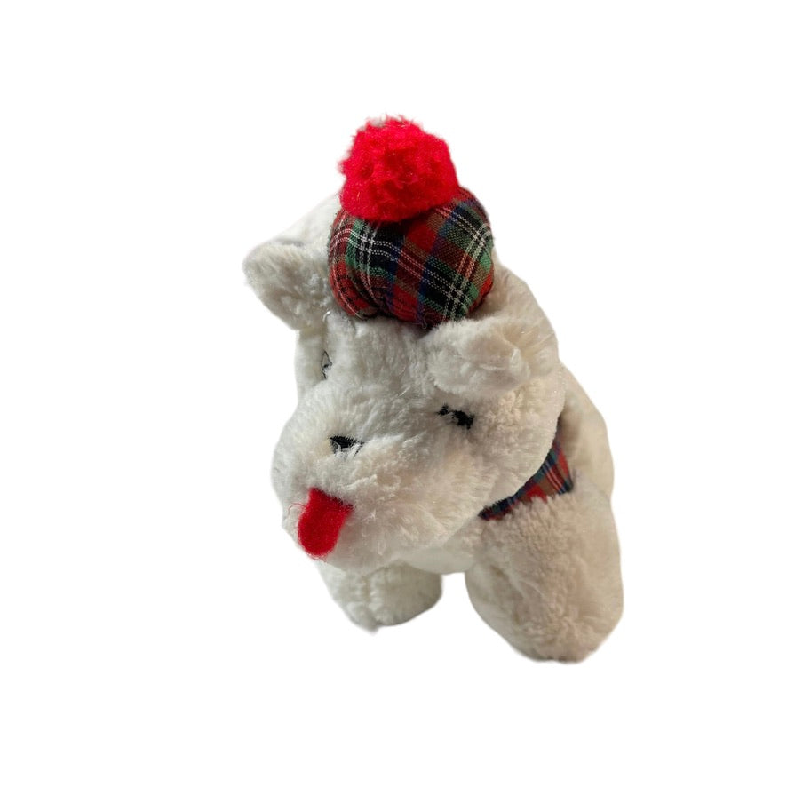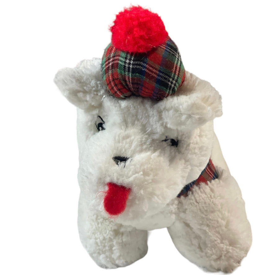 Sweet 7' Vintage Preowned White Westie /Scottie in Tartan Vest & Tam, Embroidered face and red felt tongue. Good preowned condition, without tags.