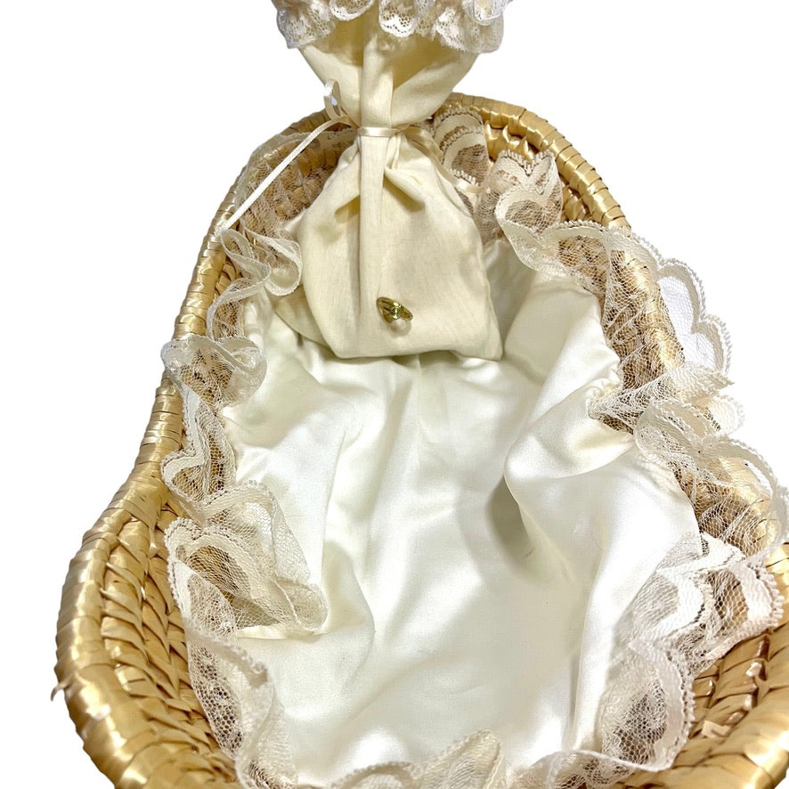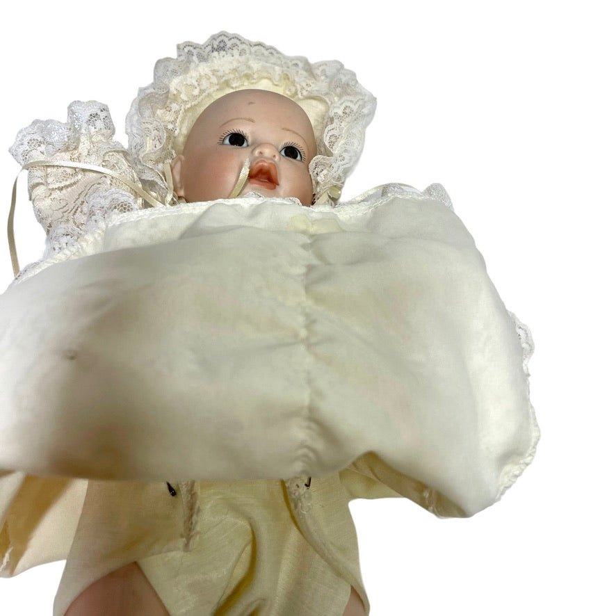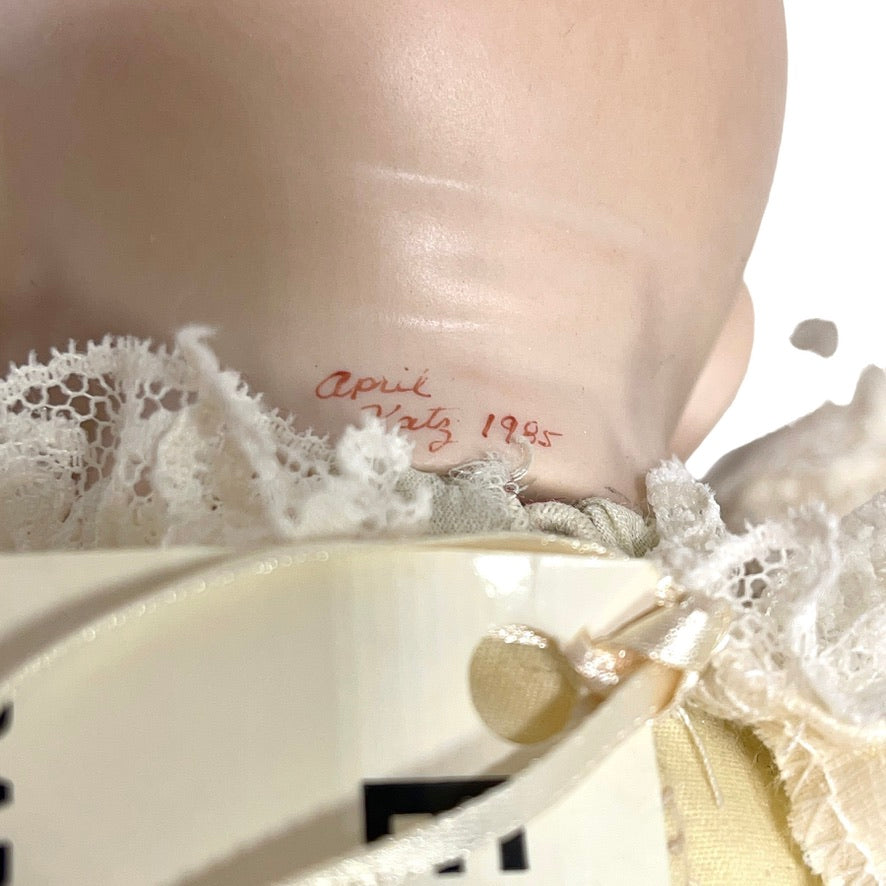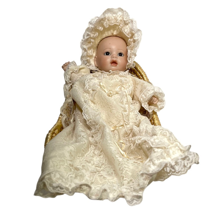 Exquisitely made & beautifully dressed in a riot of ivory lace, brocade and ribbons, Tiffany was made exclusively for Eatons by Doll Artist , April Katz, Christmas, 1985. Complete with a lace edged, satin lined blanket in wicker along with a music box encased in a satin pouch, this beautiful little porcelain doll is wearing original knit booties and cotton diaper complete with safety pin. In like new condition, Tiffany comes complete with original tag - Crease in tag. Please see pictures.