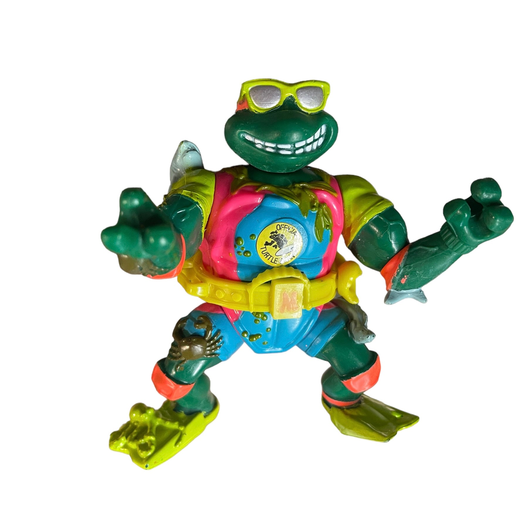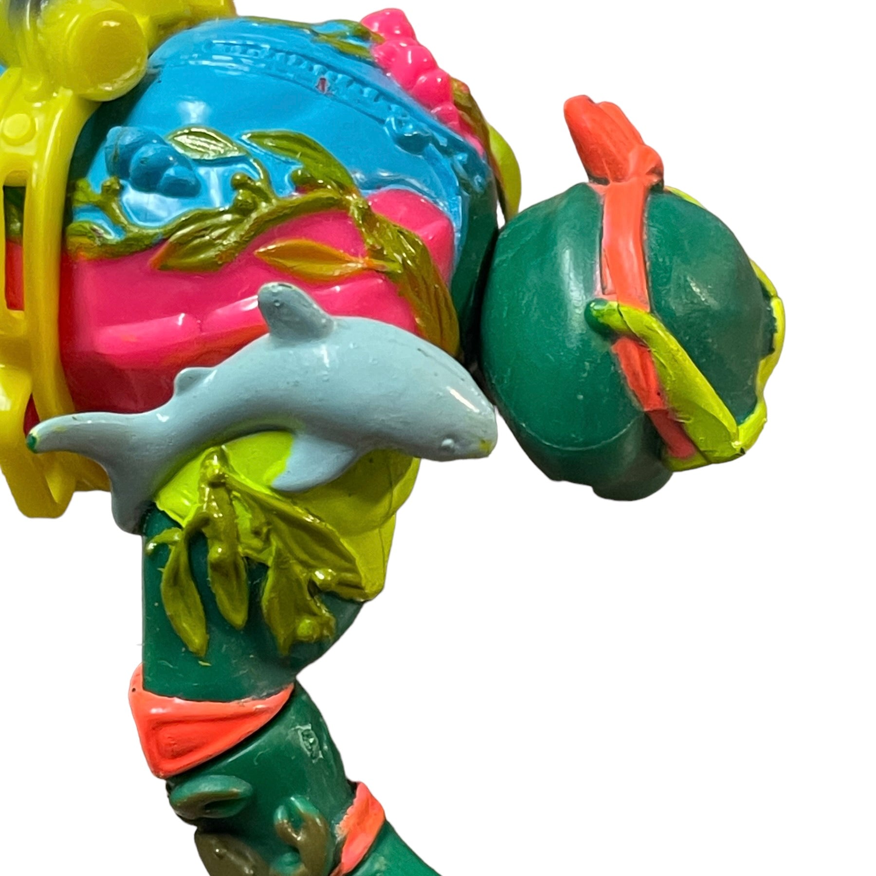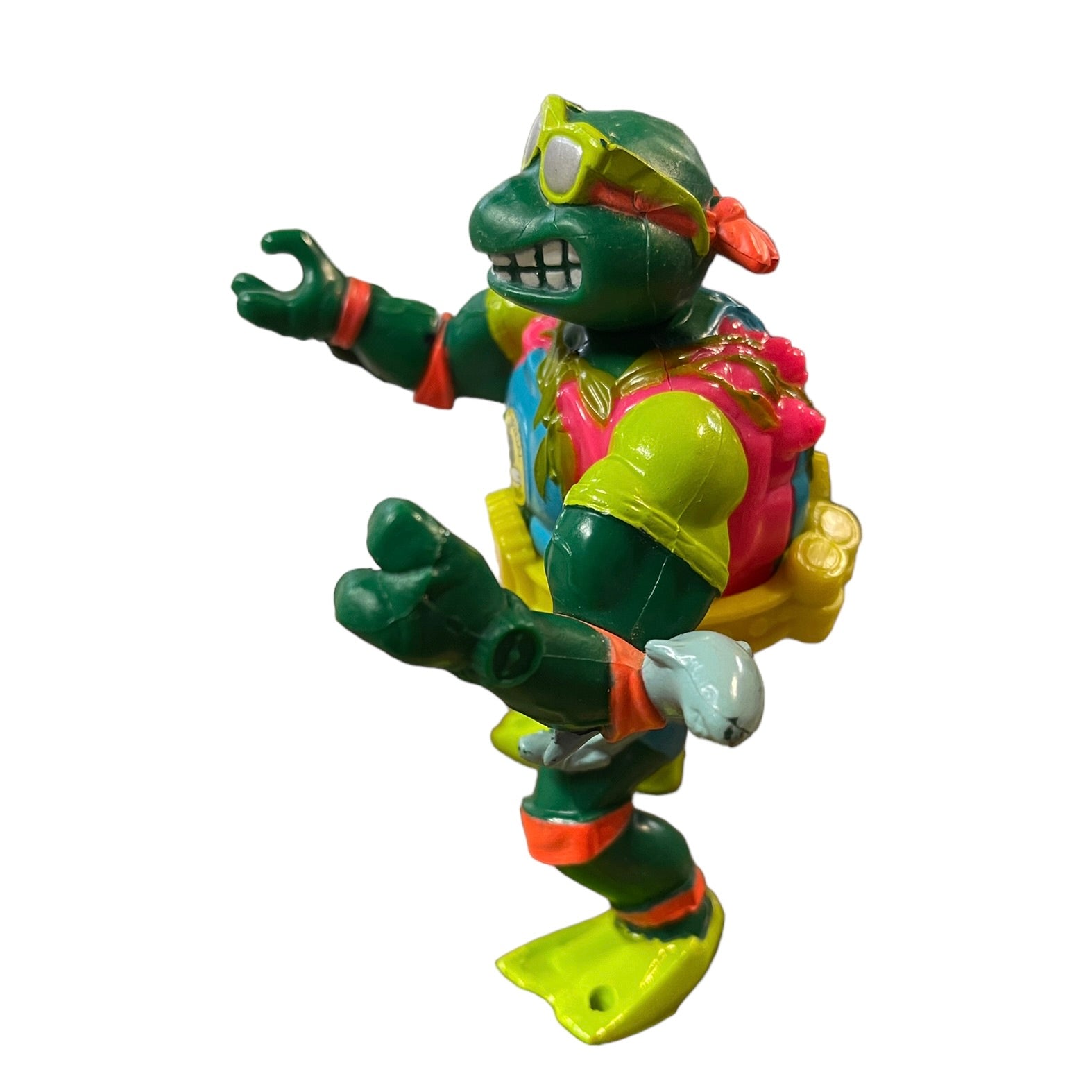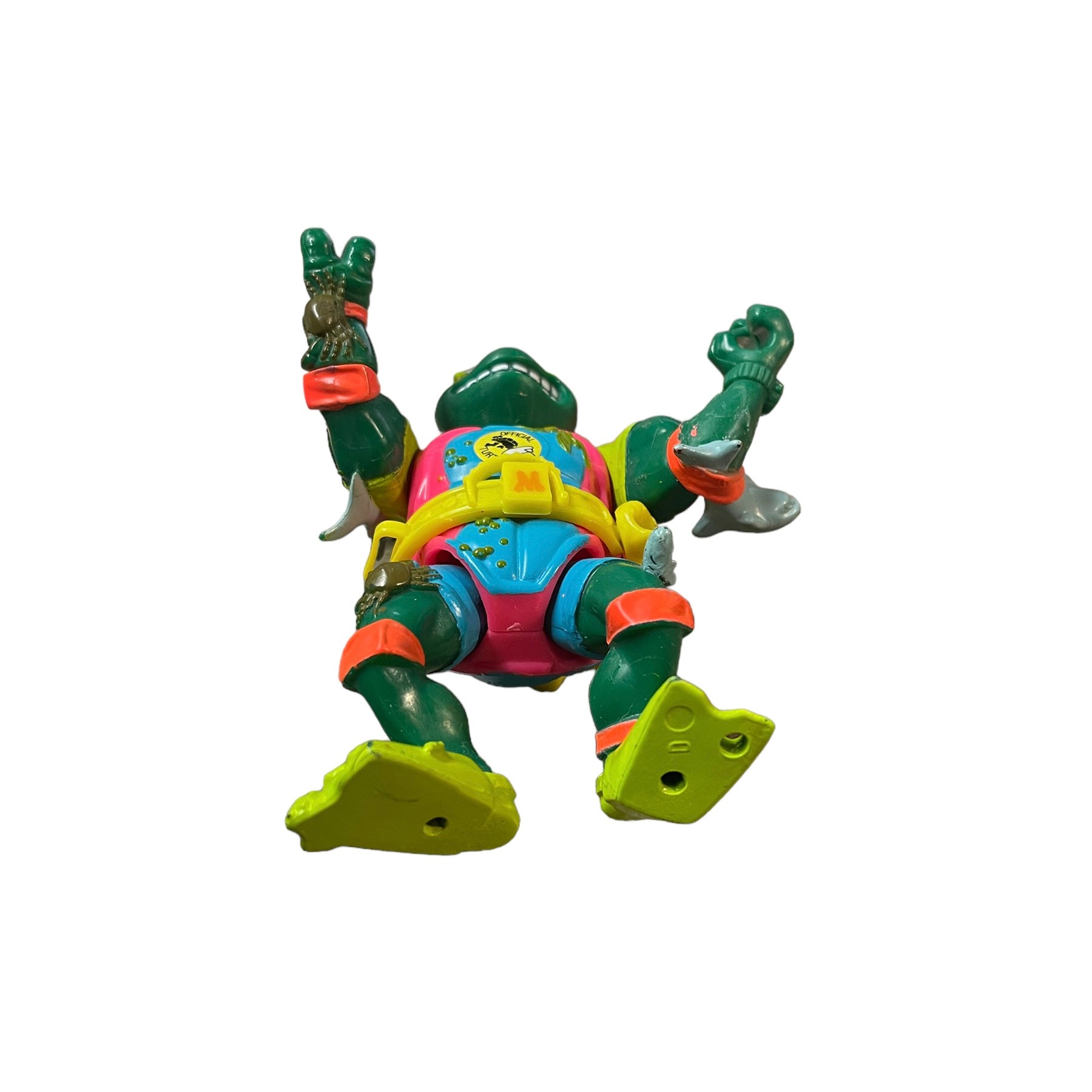 Amazing Mikey! Vintage Teenage Mutant Ninja Turtle dressed in a wetsuit with sharks attached to his arms. Excellent Vintage Condition. No accessories.