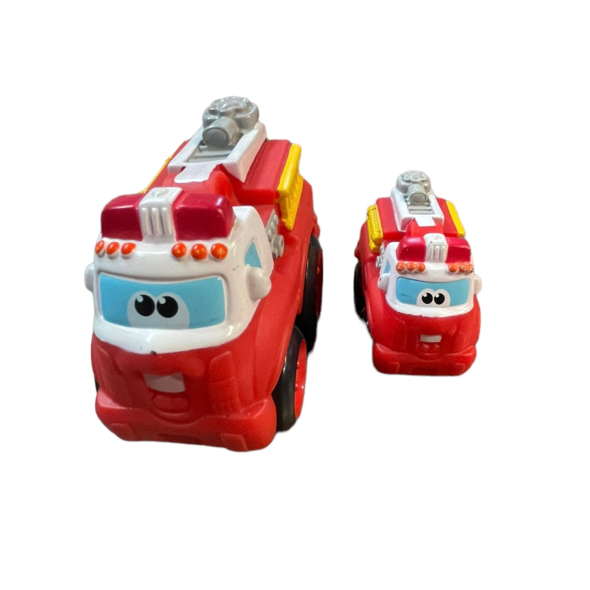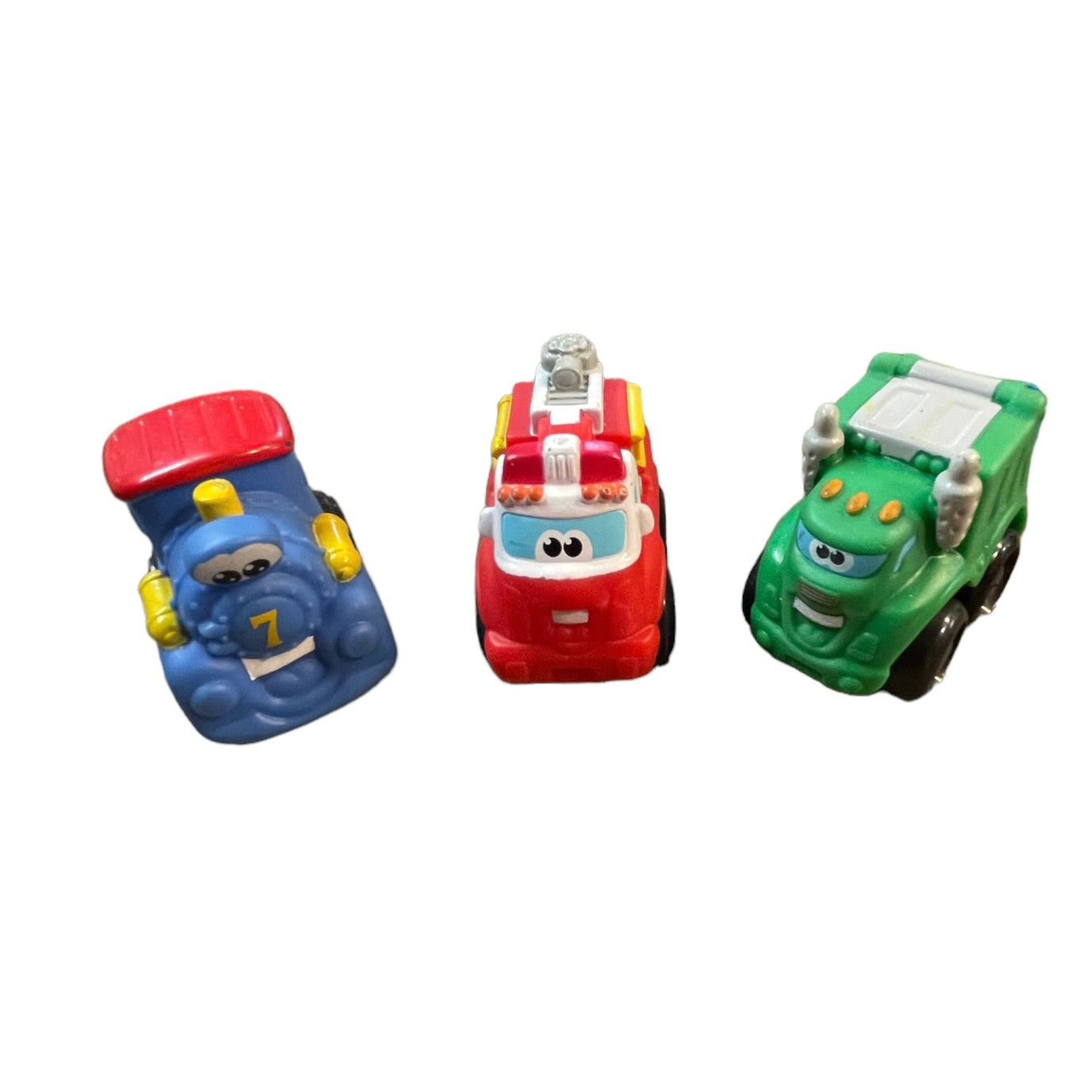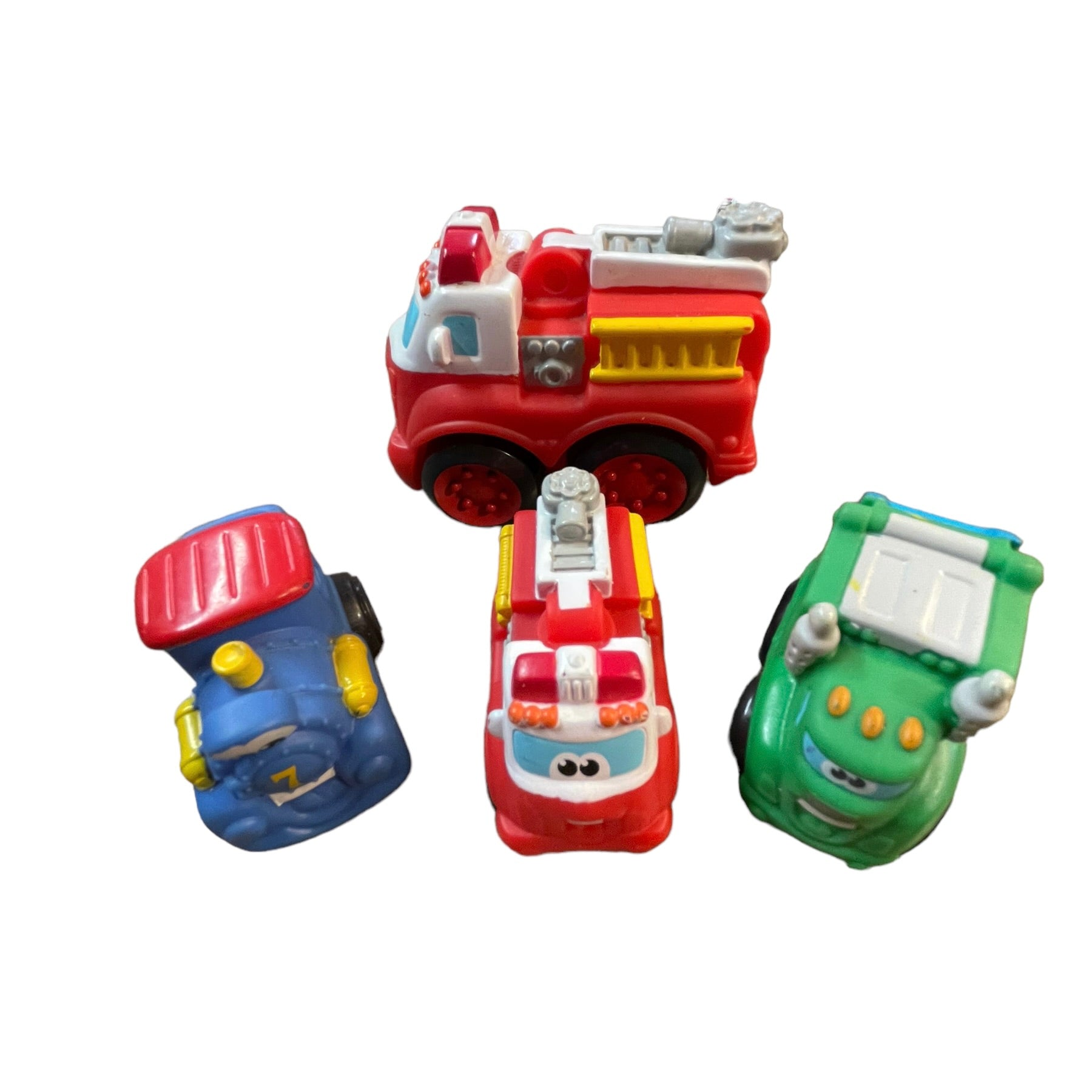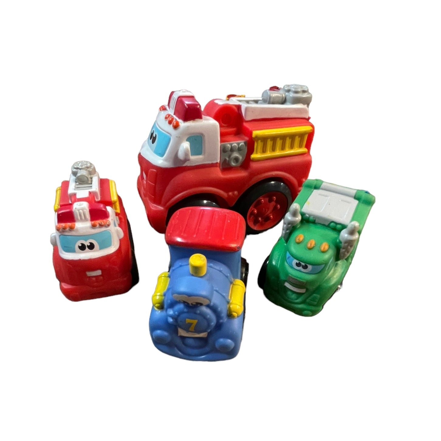 A fun collection of Tonka Lil Chuck and Friends Lot of 4, Big and Little Fire Trucks, Rowdy the Green Garbage truck, and Blue Train #7 all in excellent preowned collection. These chunky. rubber vehicles are just right for little hands!