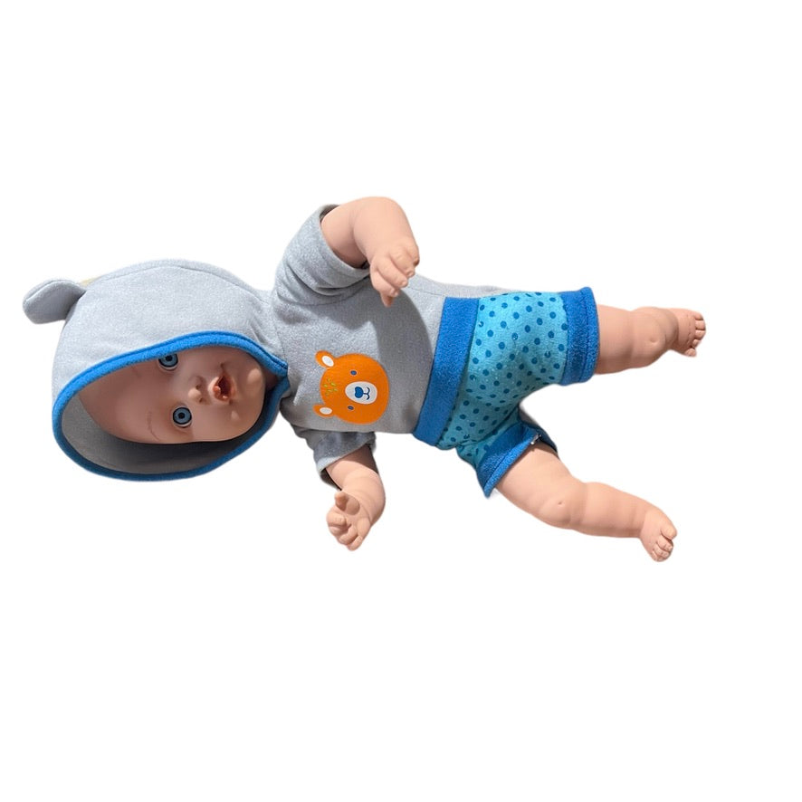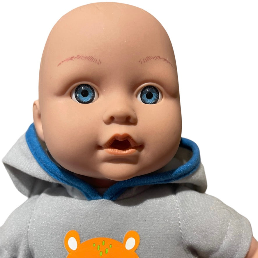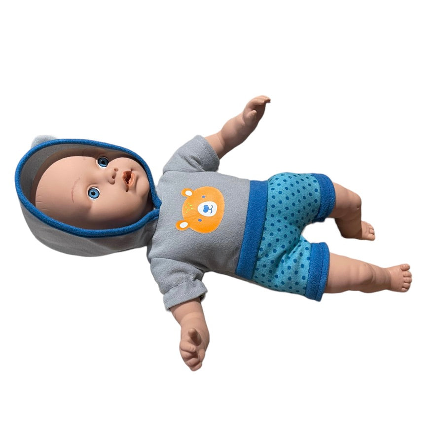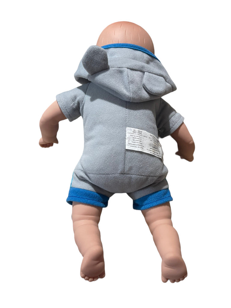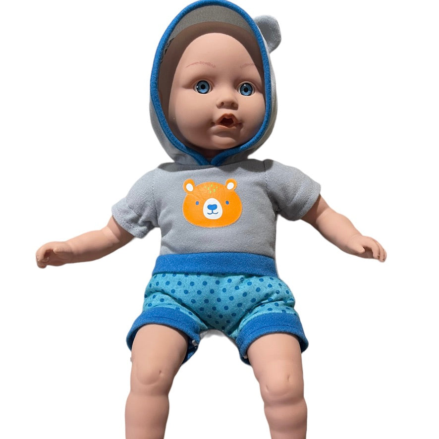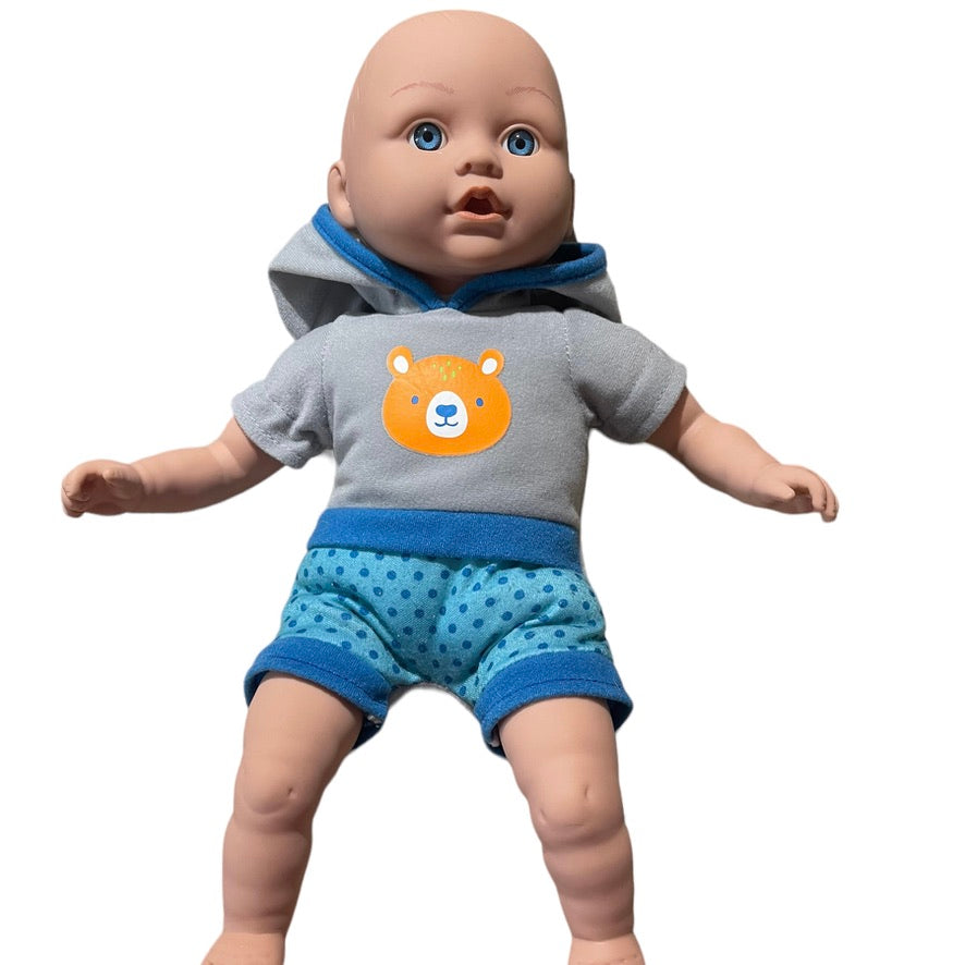 Blue eyed baby boy, grey & blue teddy bear hoodie in great preowned condition. 12" Citi Toy 2015