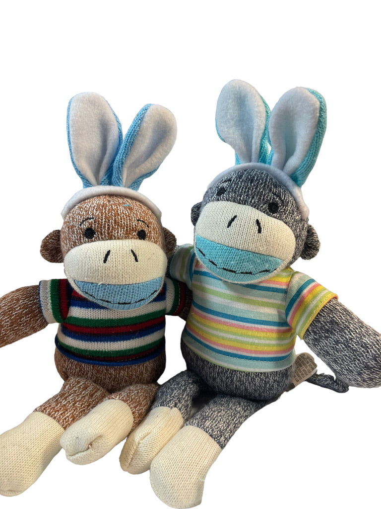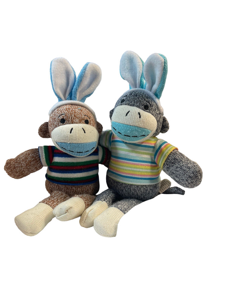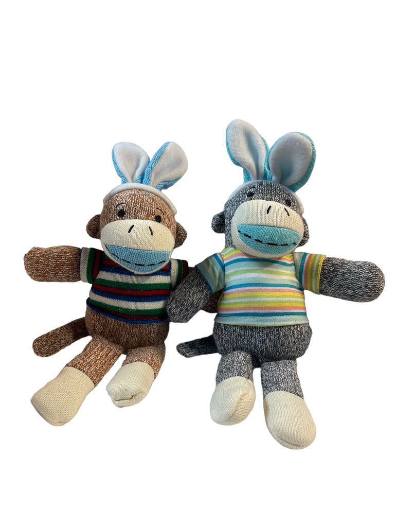 These Aqua/ Grey & Blue/ Brown Sock Monkeys are twice the fun! With Rabbit Ears and embroidered faces, these cuties are in excellent preowned condition.