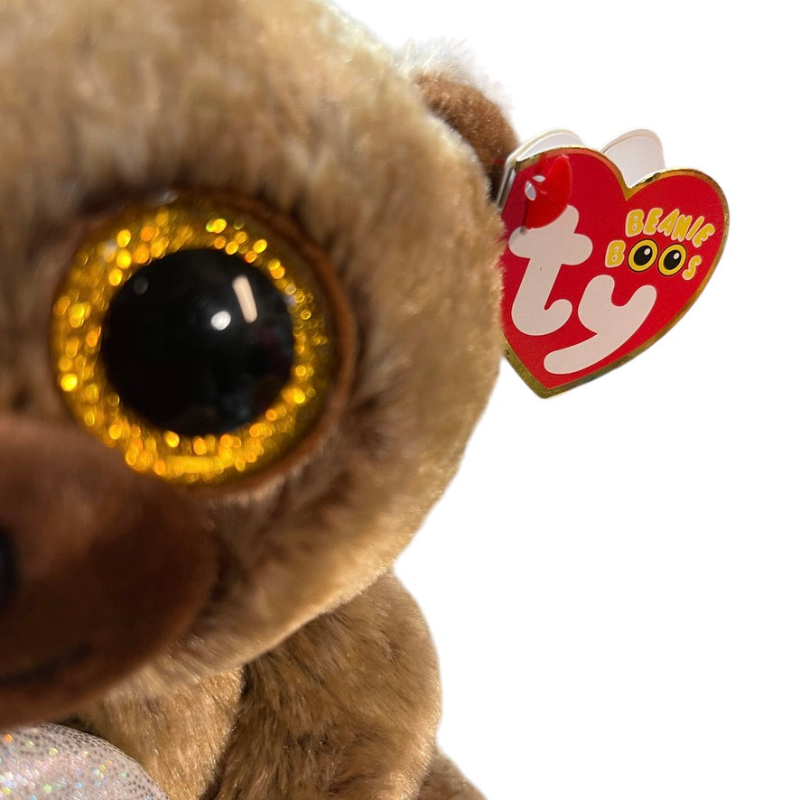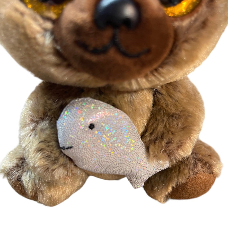 Ty Retired Beanie Boo, 'Henry' a beautiful, sparkly eyed bear proudly holding his sparkly catch! A Canadian exclusive in excellent preowned condition, with tags. A very special, collectible, stuffed animal toy.