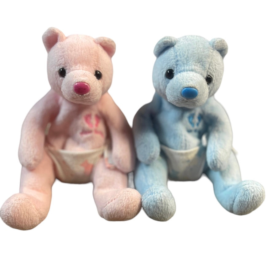 TY Retired Vintage, It"s A Boy! It's a Girl! Pink & Blue Beanie Babies with Little Diapers & Embroidery