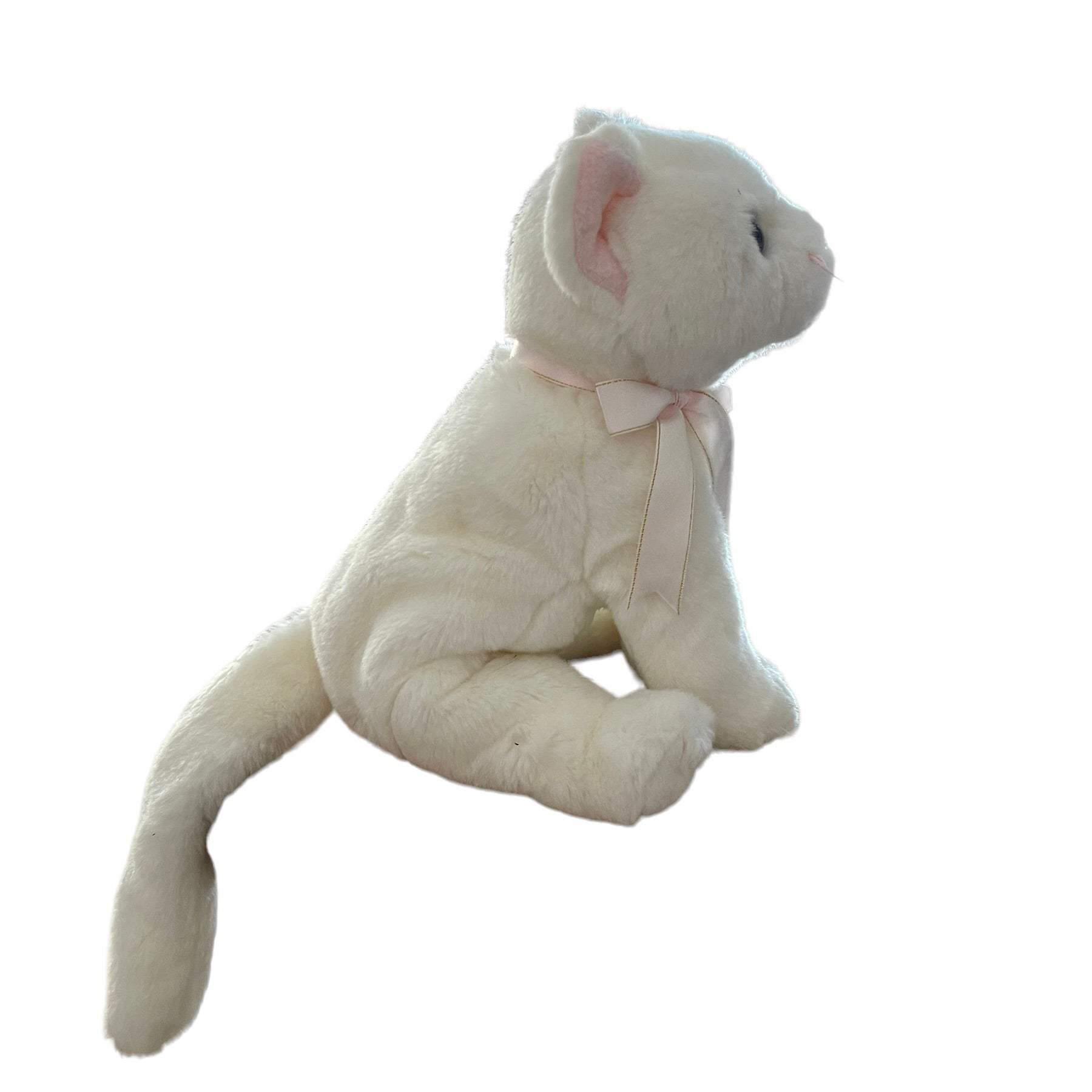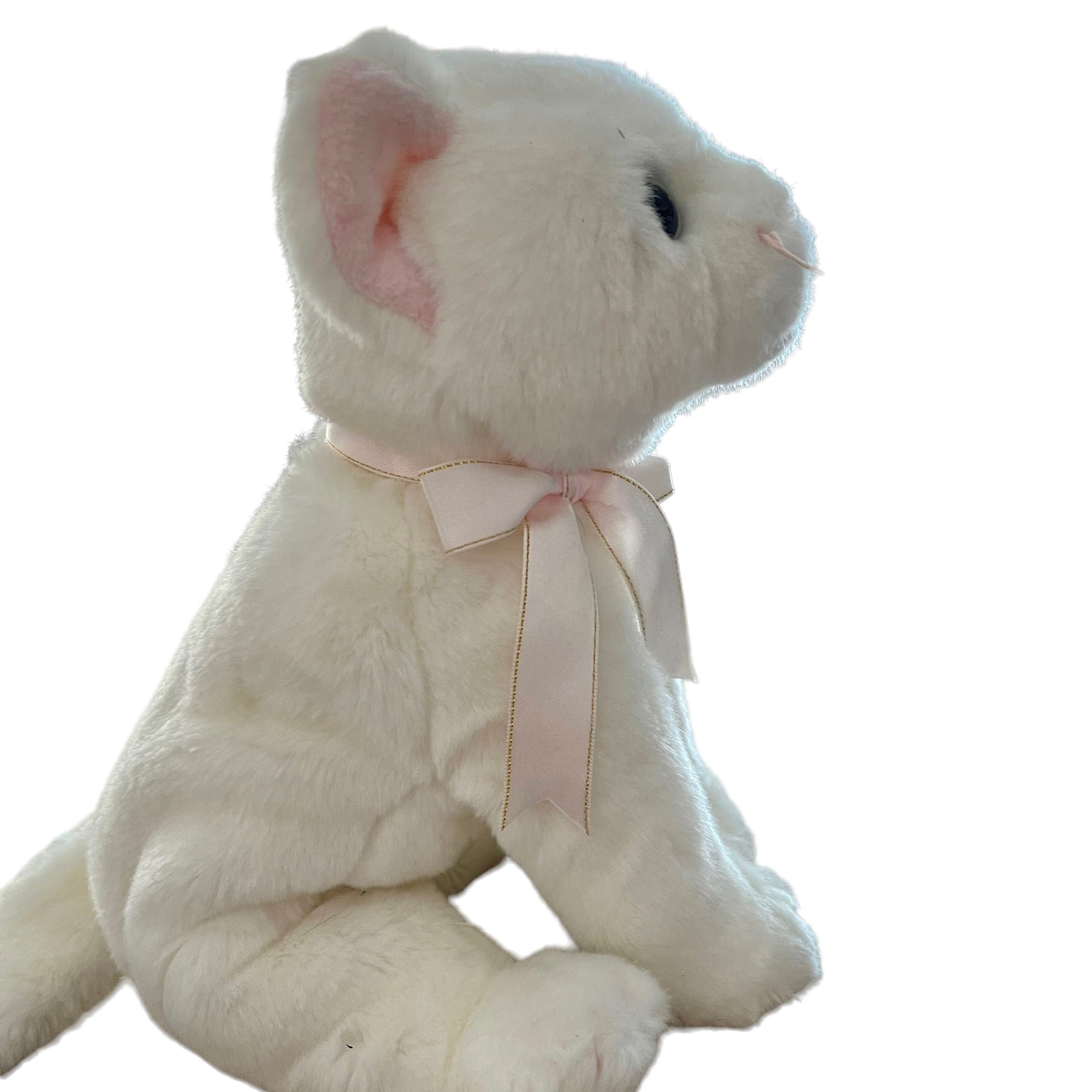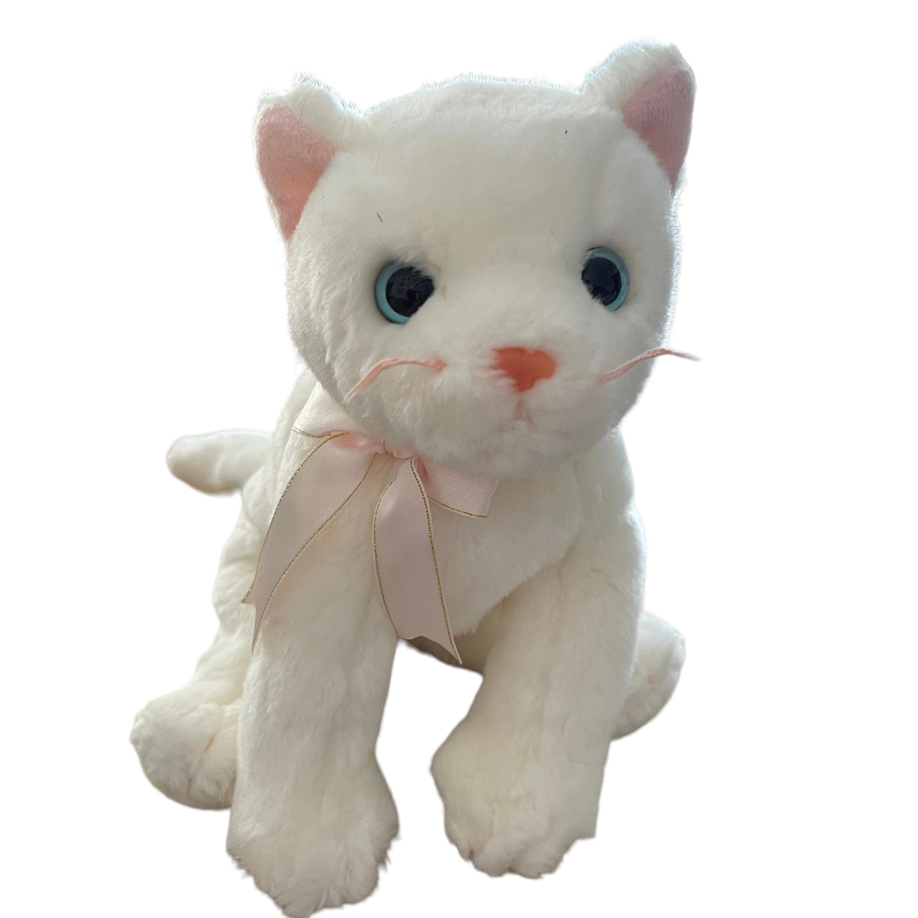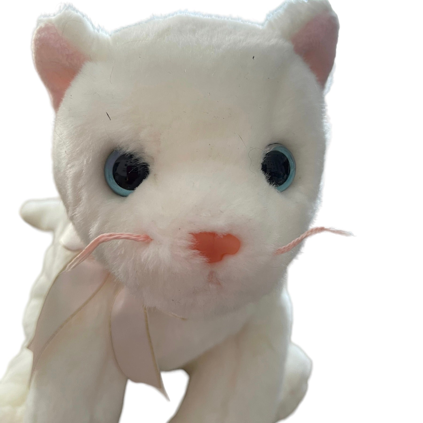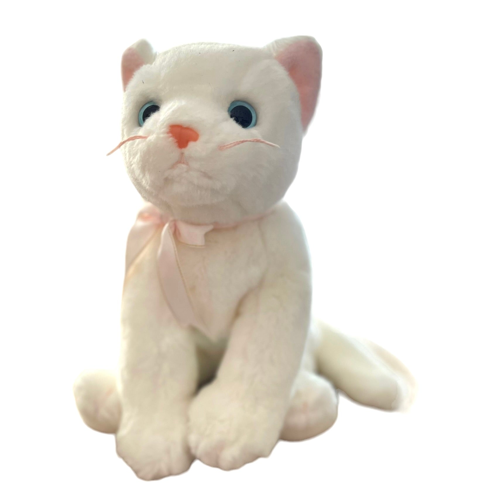 Adorable Vintage Beanie Buddy in great preowned condition. This white kitten has bright blue eyes, pink nose, whiskers, ears, and a pretty pink and gold bow. No hang tag.