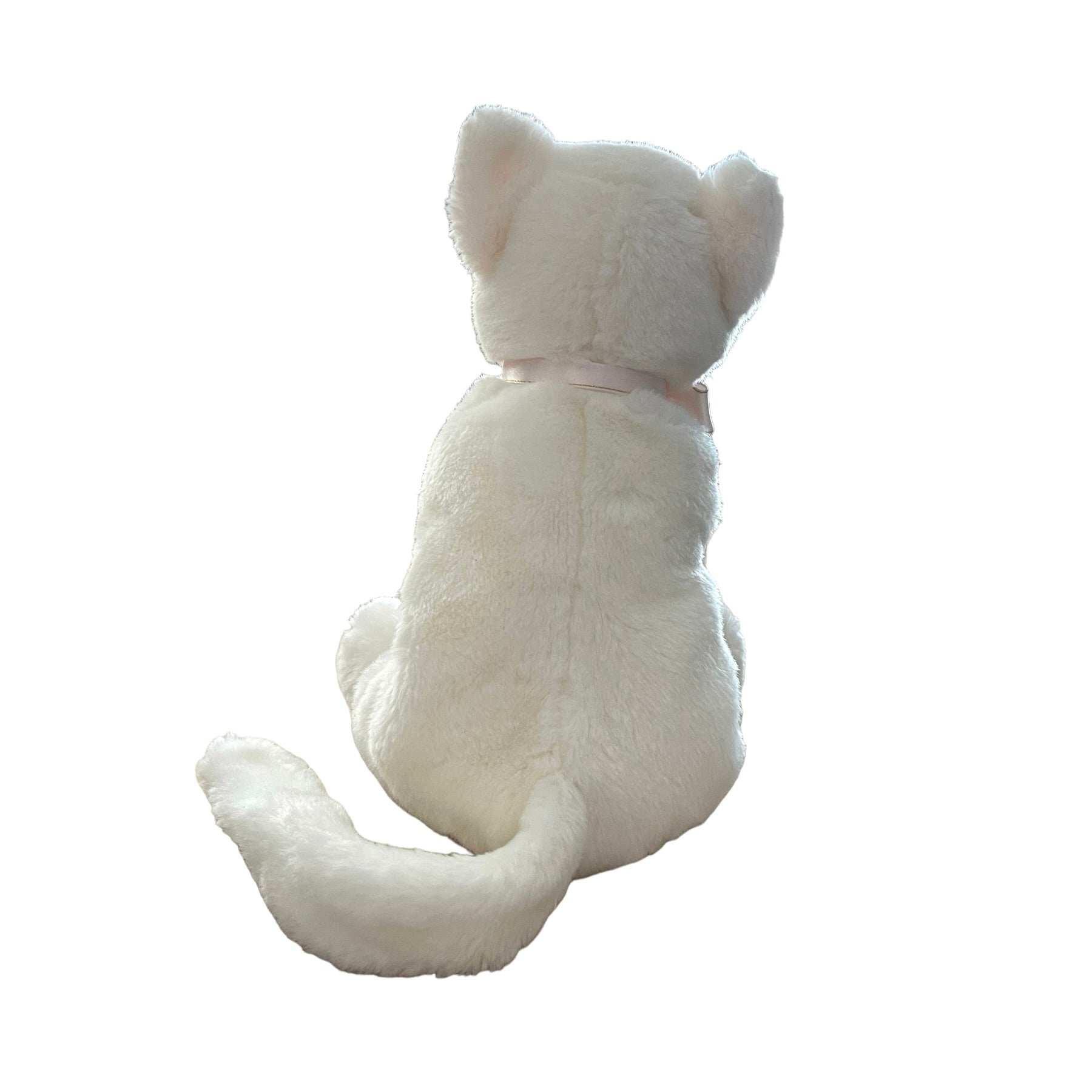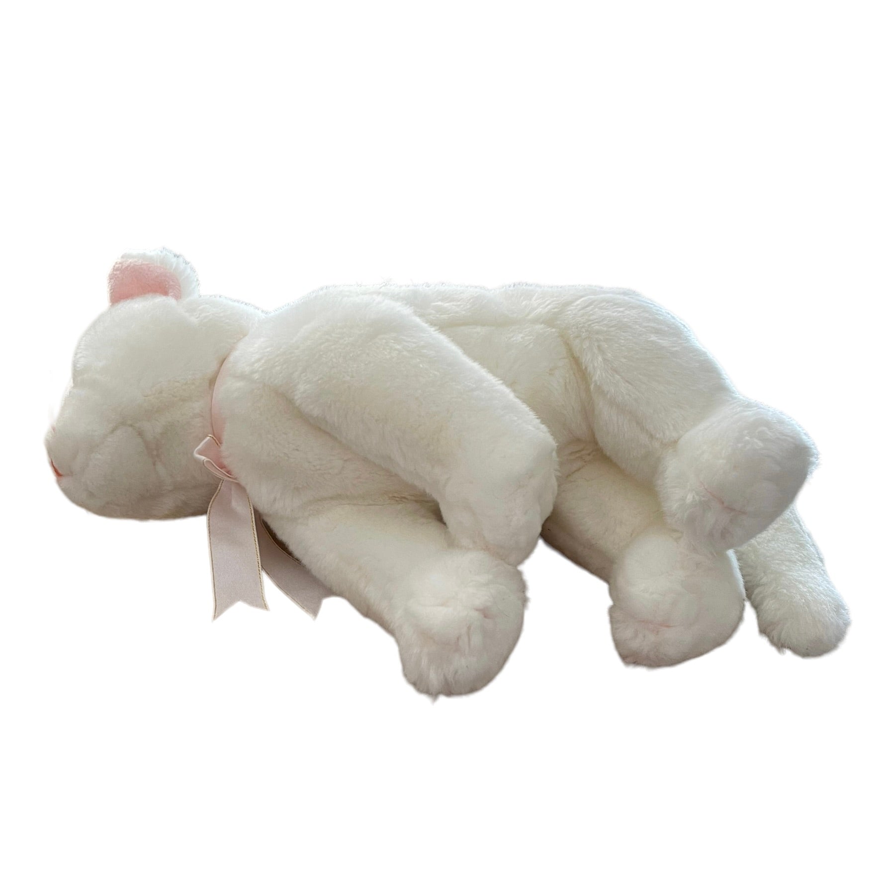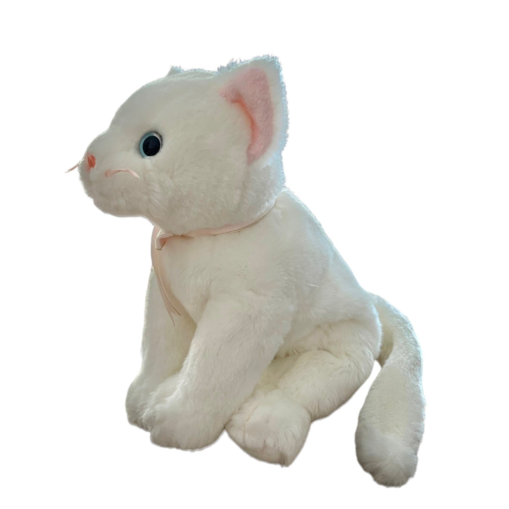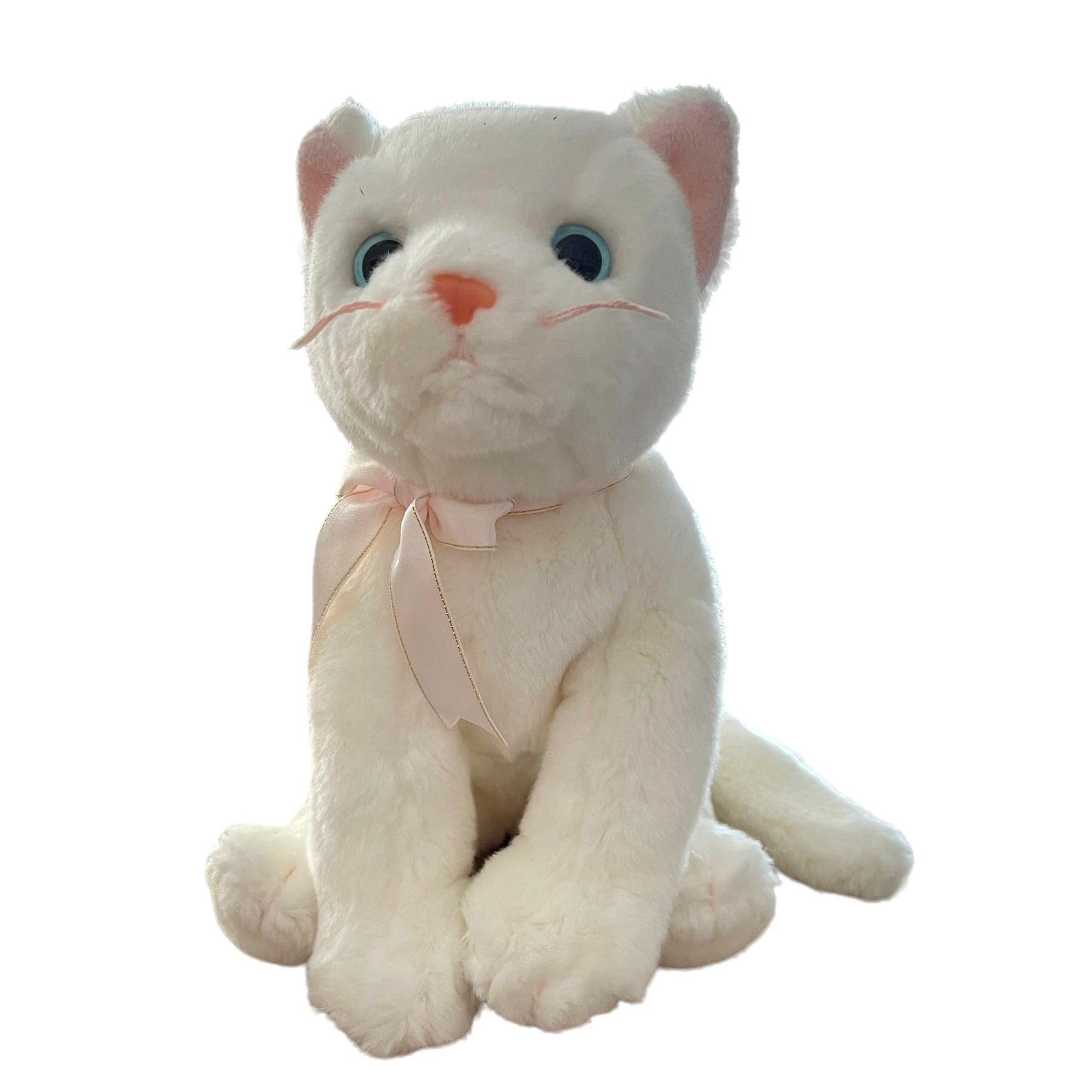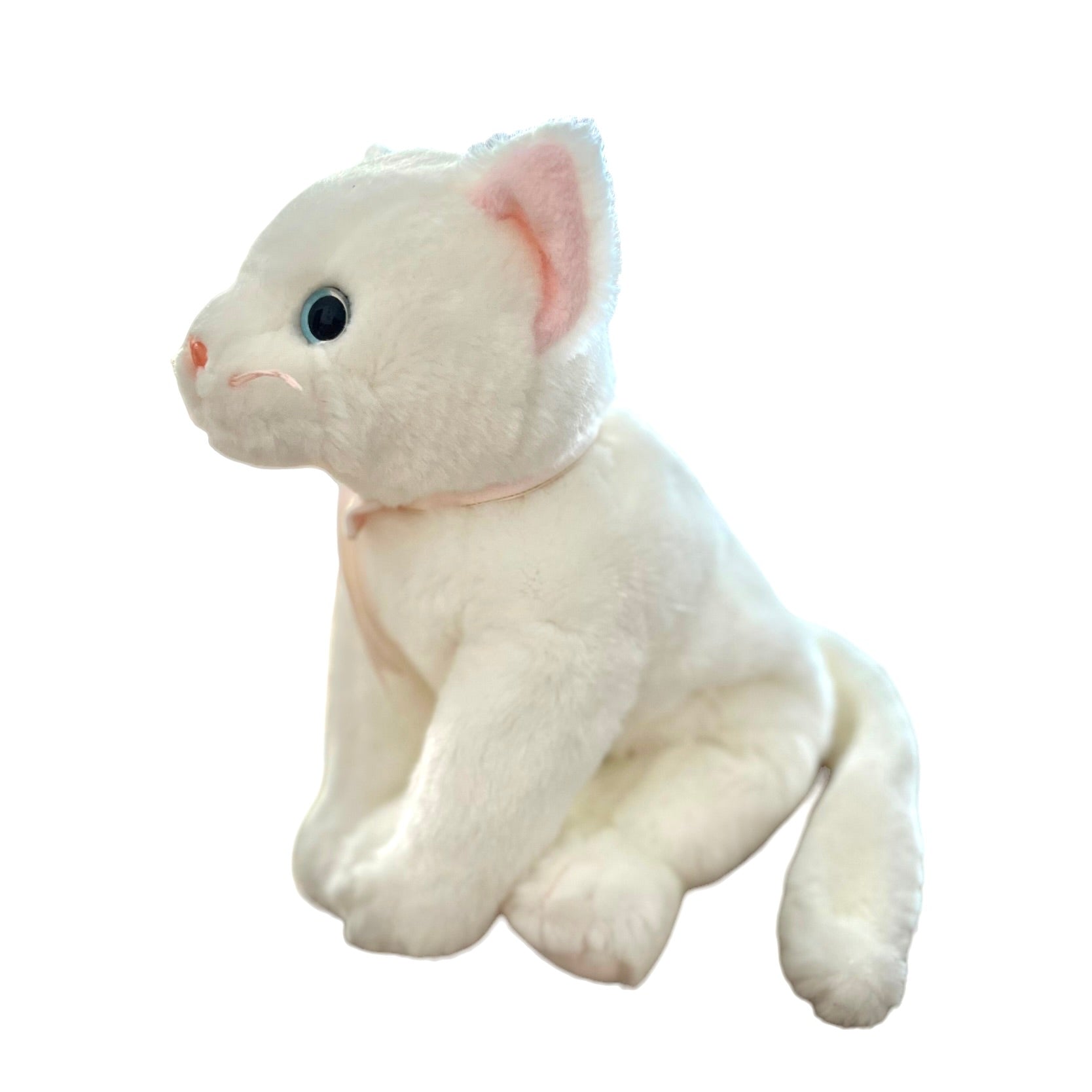 Adorable Vintage Beanie Buddy in great preowned condition. This white kitten has bright blue eyes, pink nose, whiskers, ears, and a pretty pink and gold bow. No hang tag.