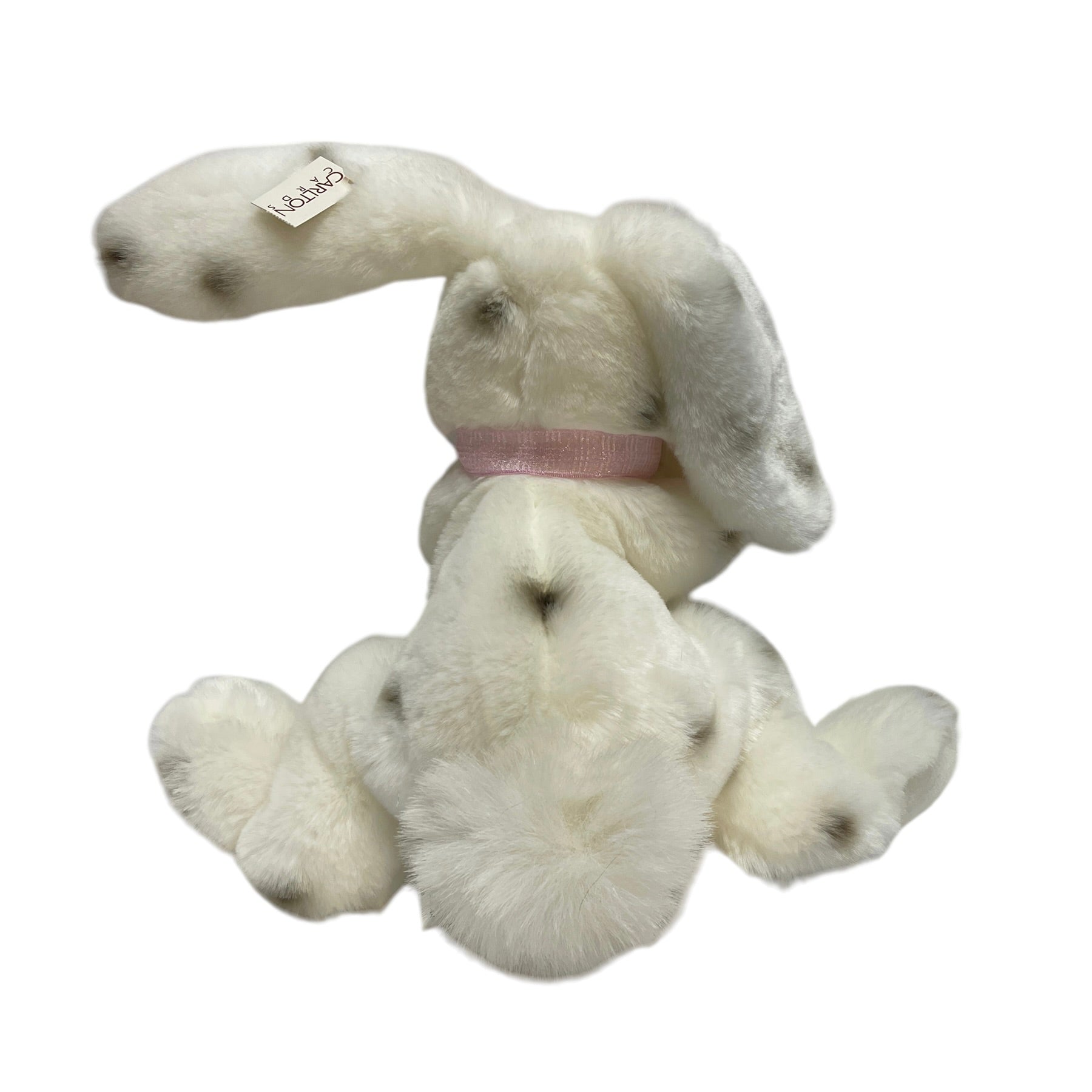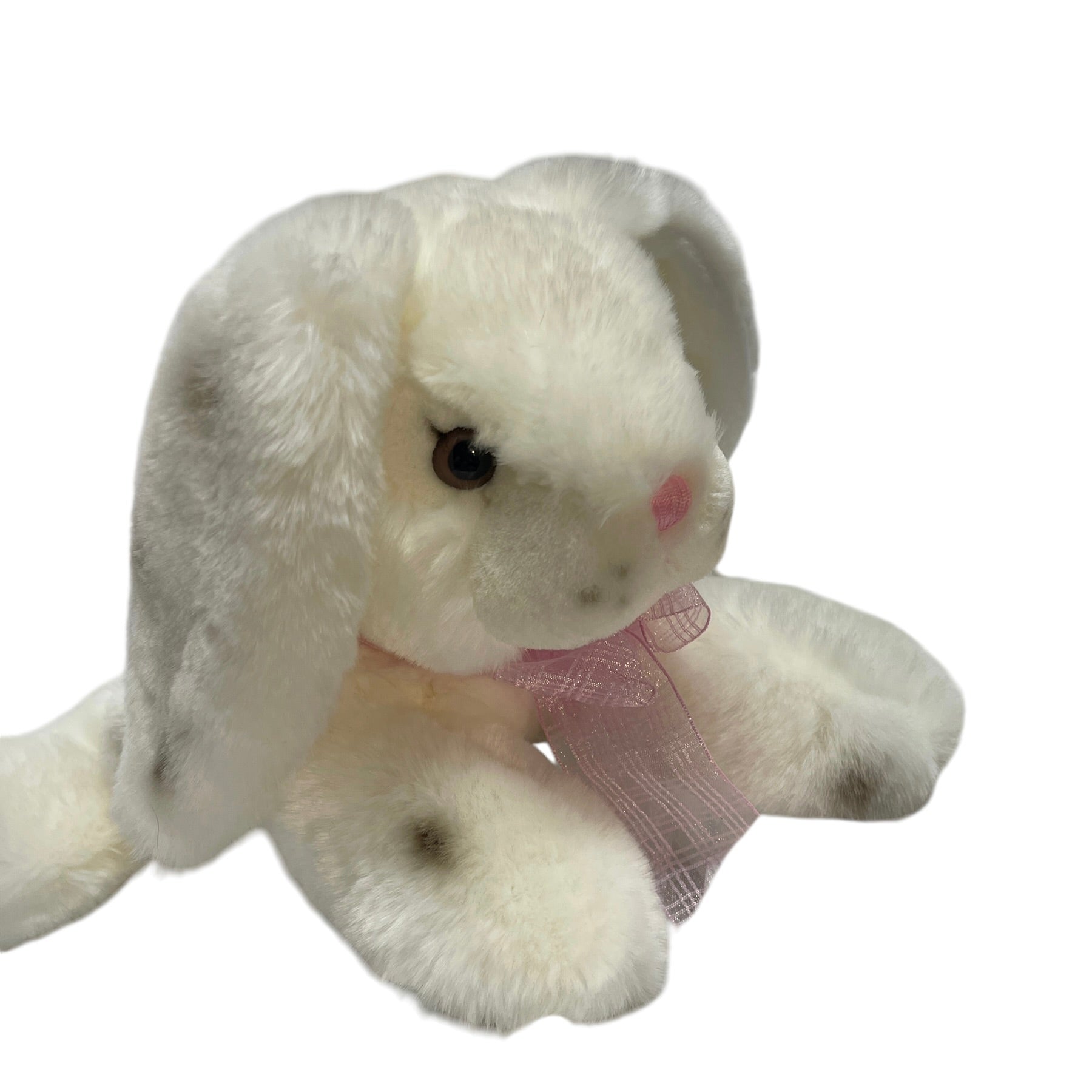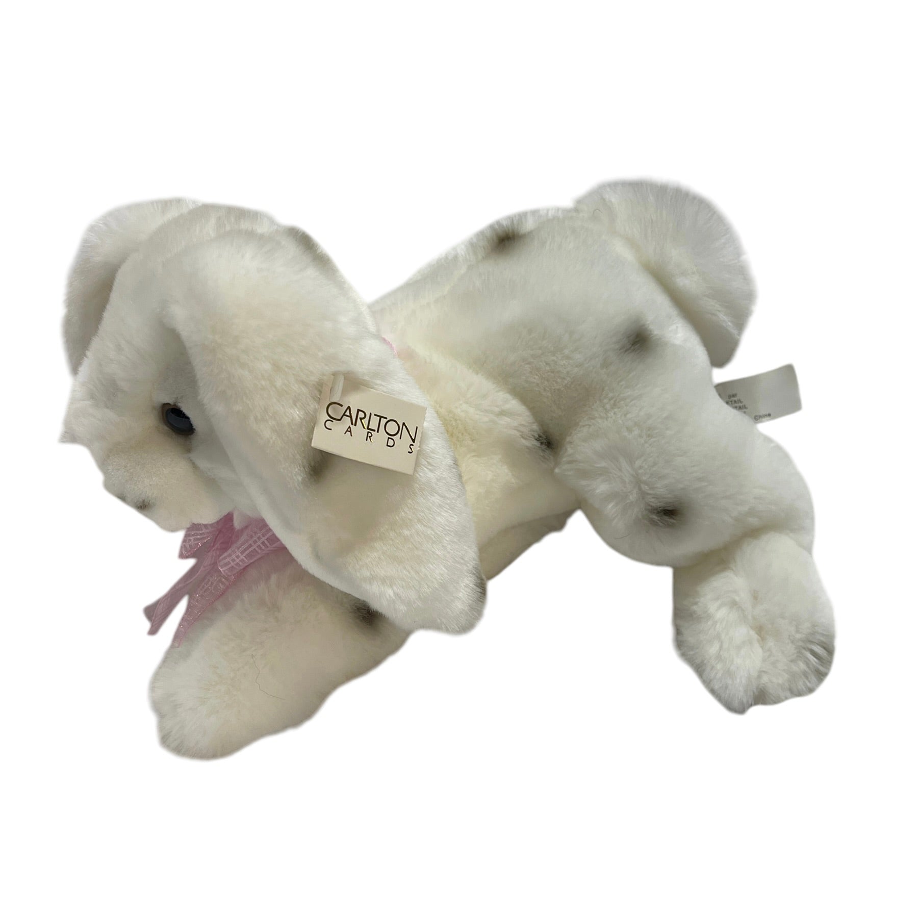 Incredibly sweet chunky weighted 12" lop eared white bunny rabbit weighted plush stuffed animal toy. Black spots & bright glass eyes. This little beauty has a pretty pink ribbon, BIG fluffy tail and Carlton Cards Hang Tag. So cute!