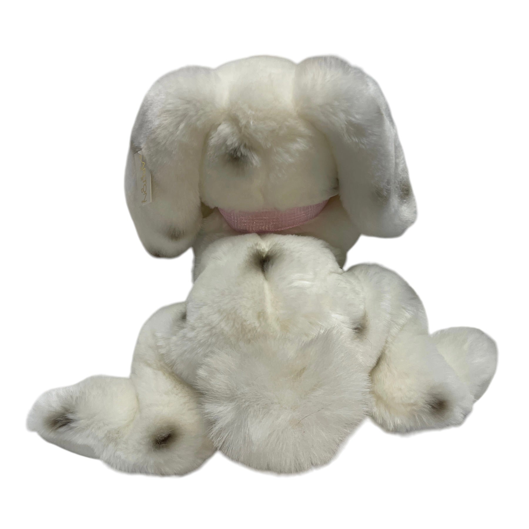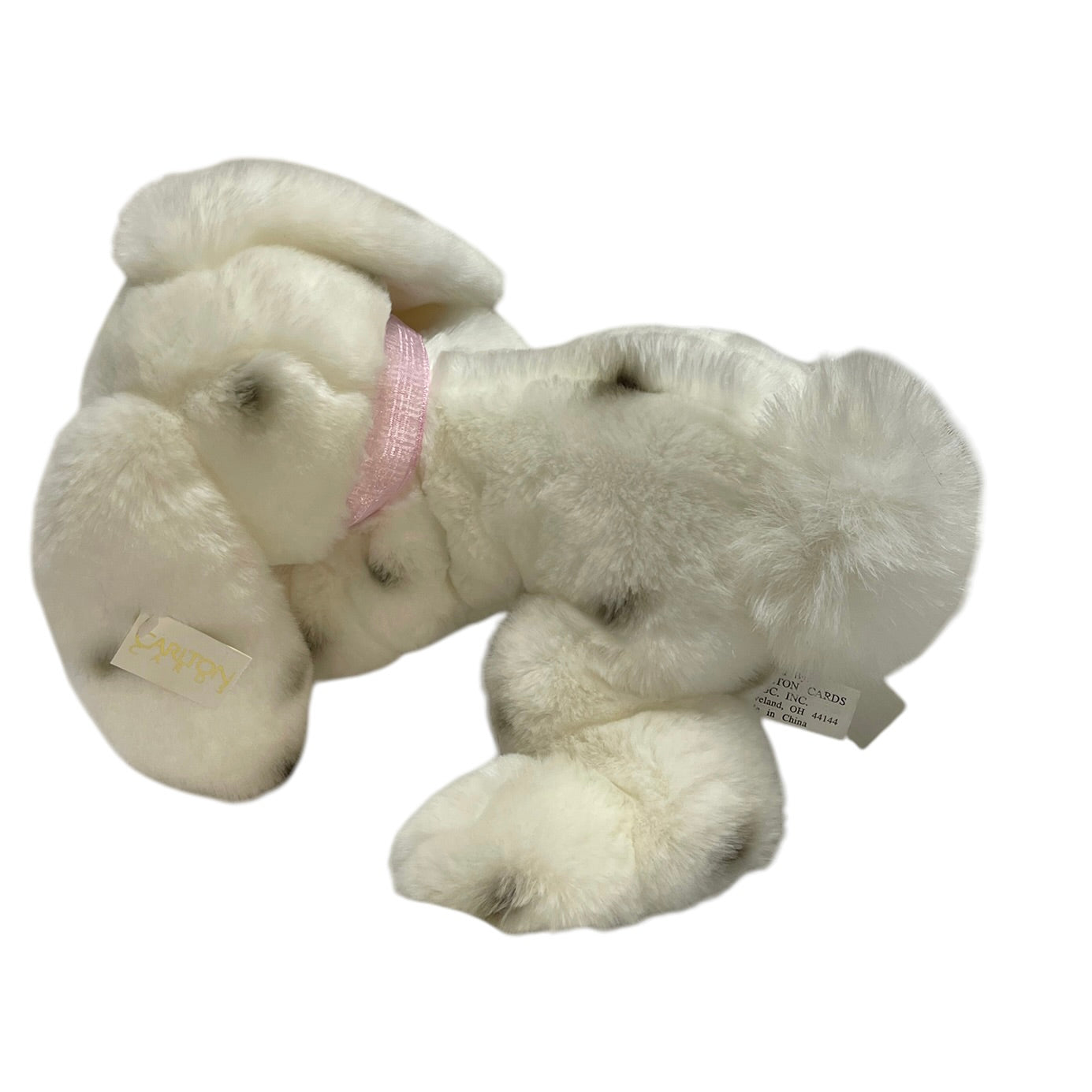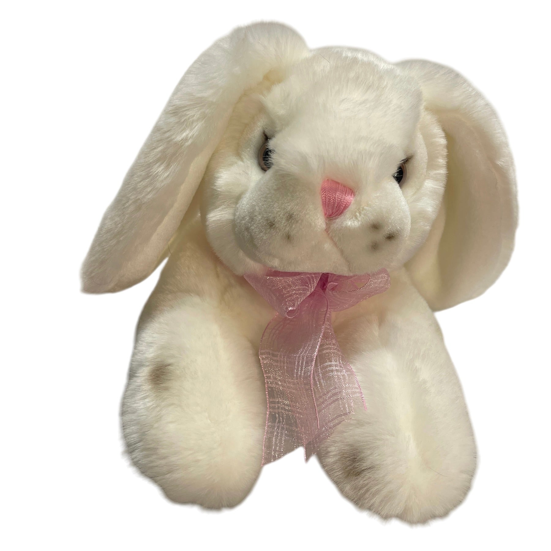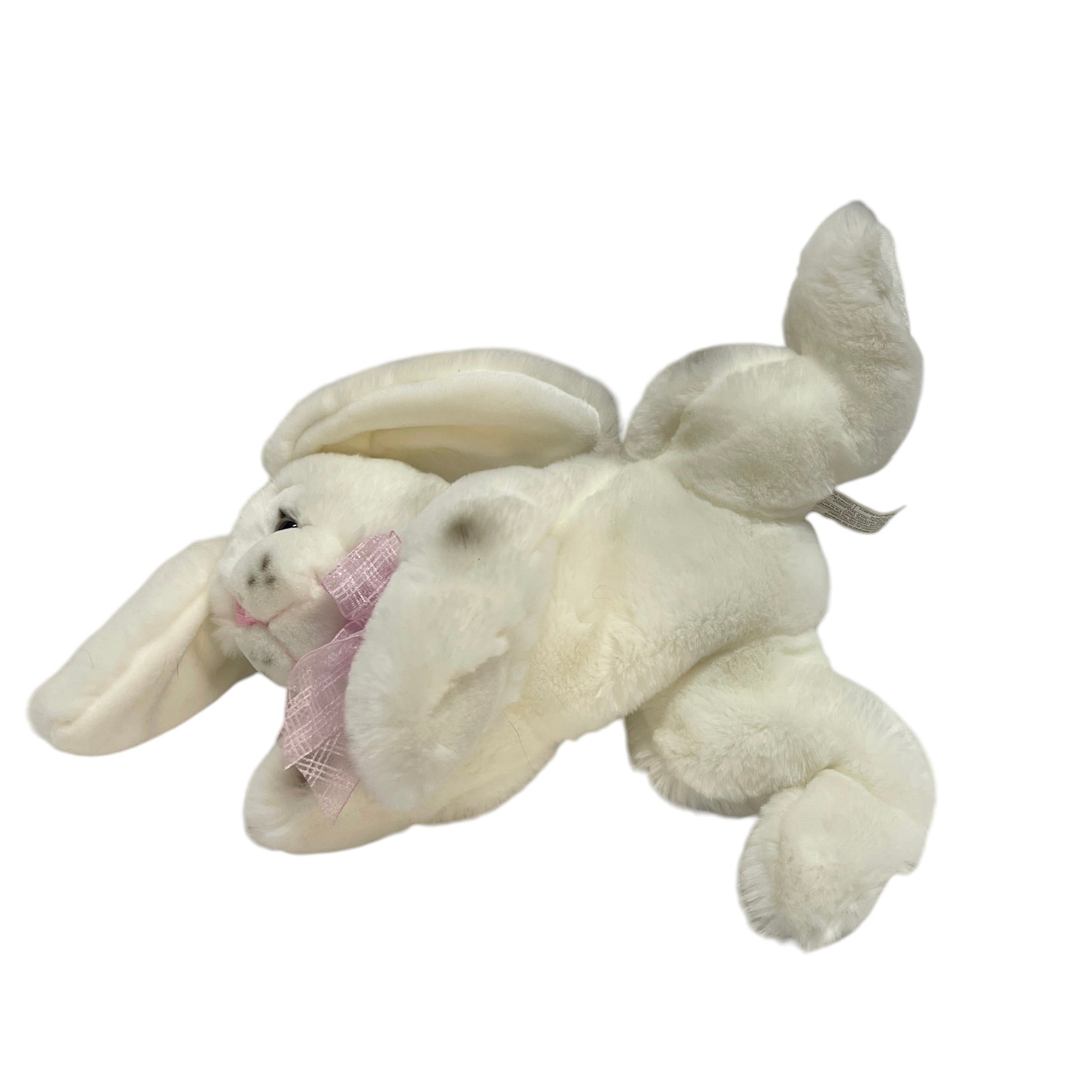 Incredibly sweet chunky weighted 12" lop eared white bunny rabbit weighted plush stuffed animal toy. Black spots & bright glass eyes. This little beauty has a pretty pink ribbon, BIG fluffy tail and Carlton Cards Hang Tag. So cute!