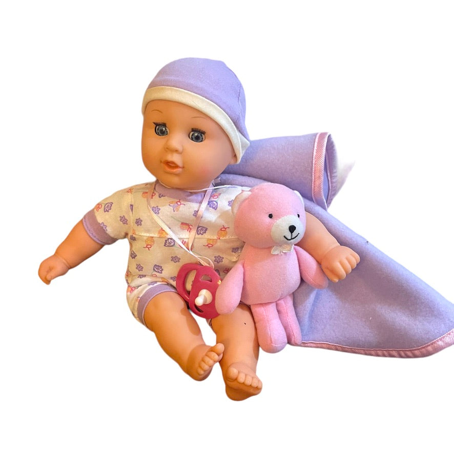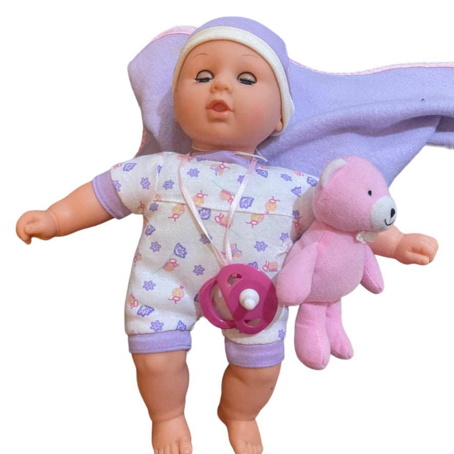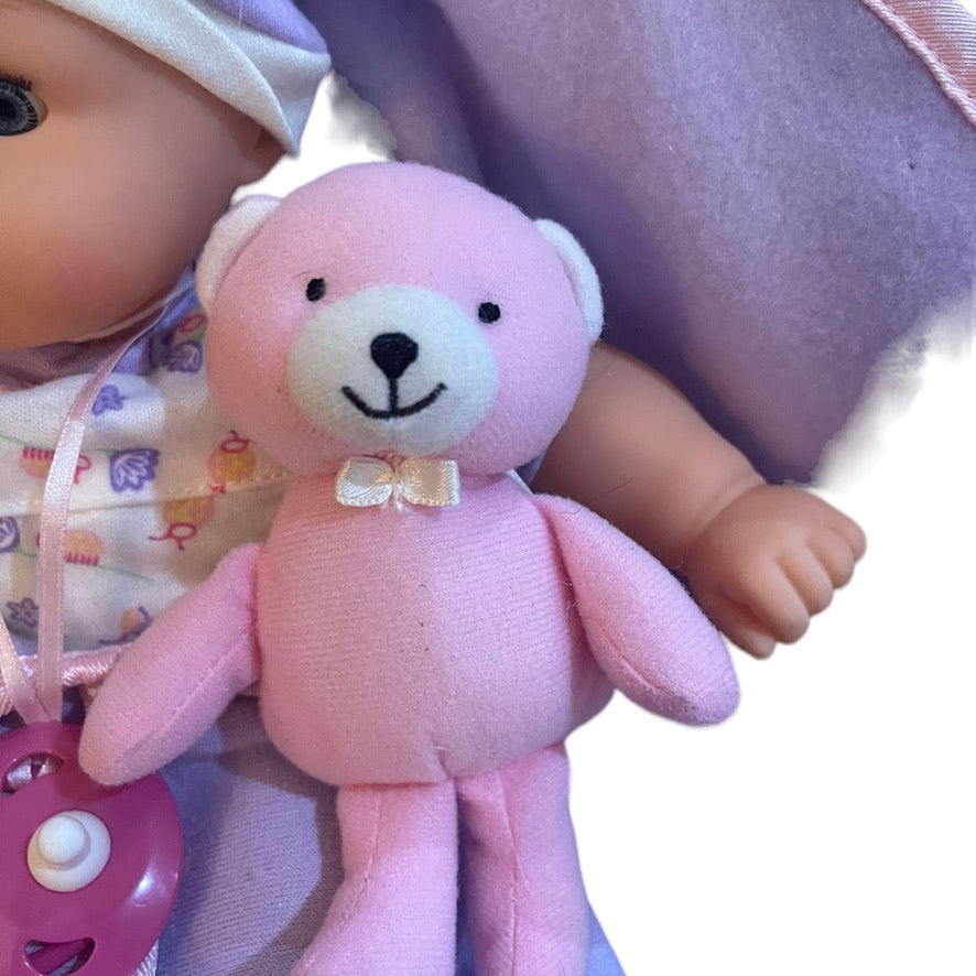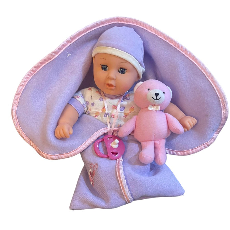 This Sweet Baby is cozy in her purple bunting bag complete with baby teddy toy and pacifier. A lovely little doll has sleepy eyes, long lashes & is perfect for gift giving.