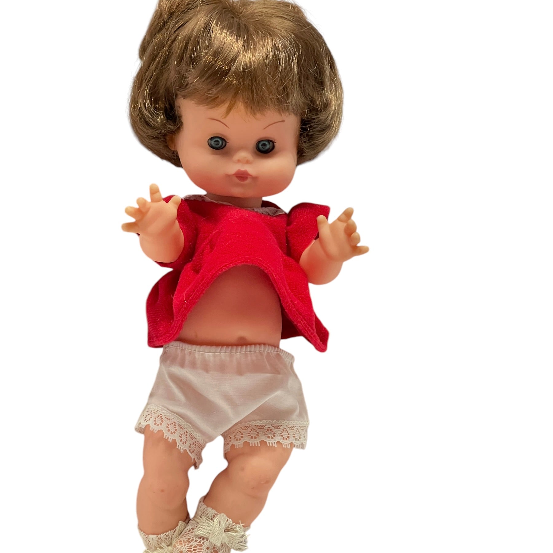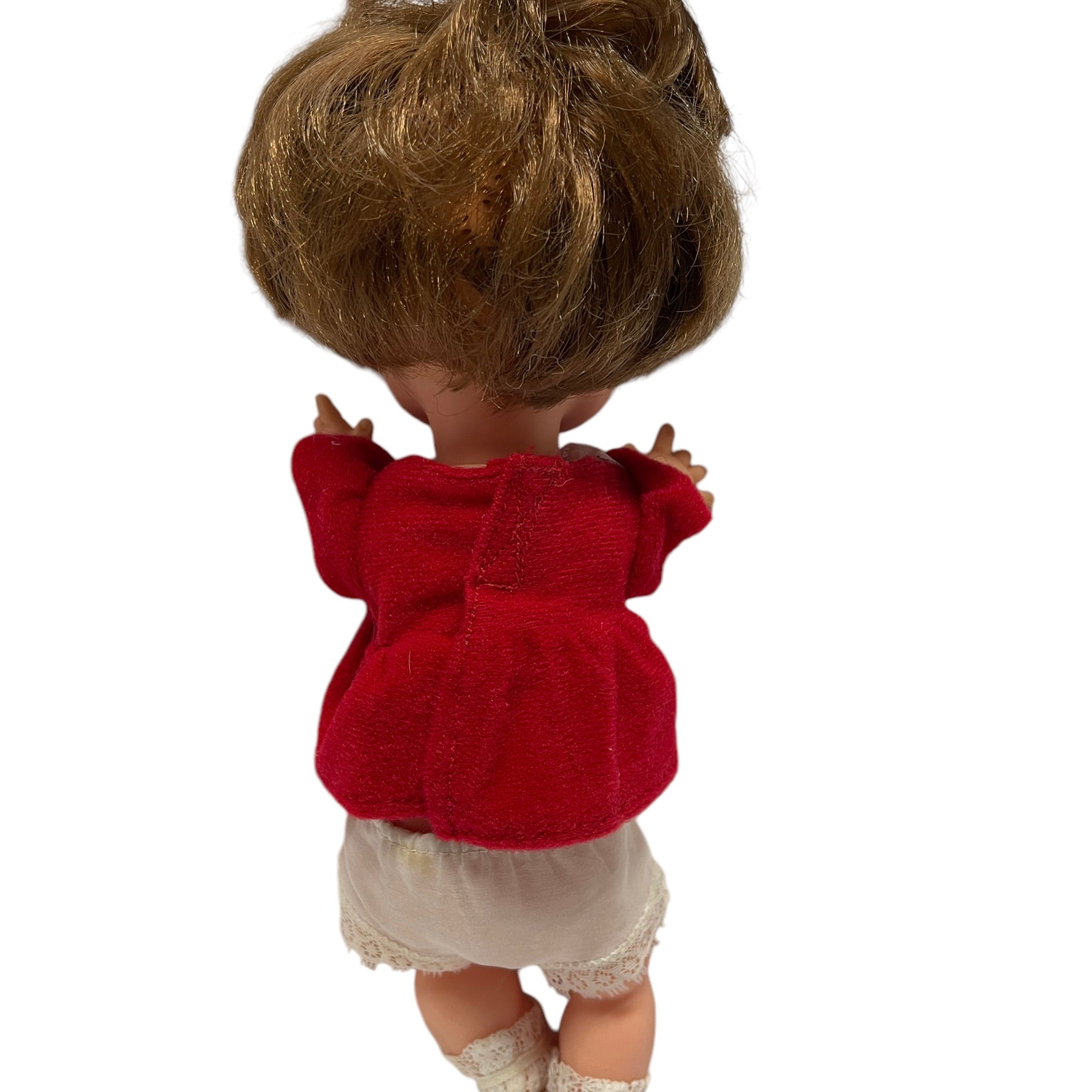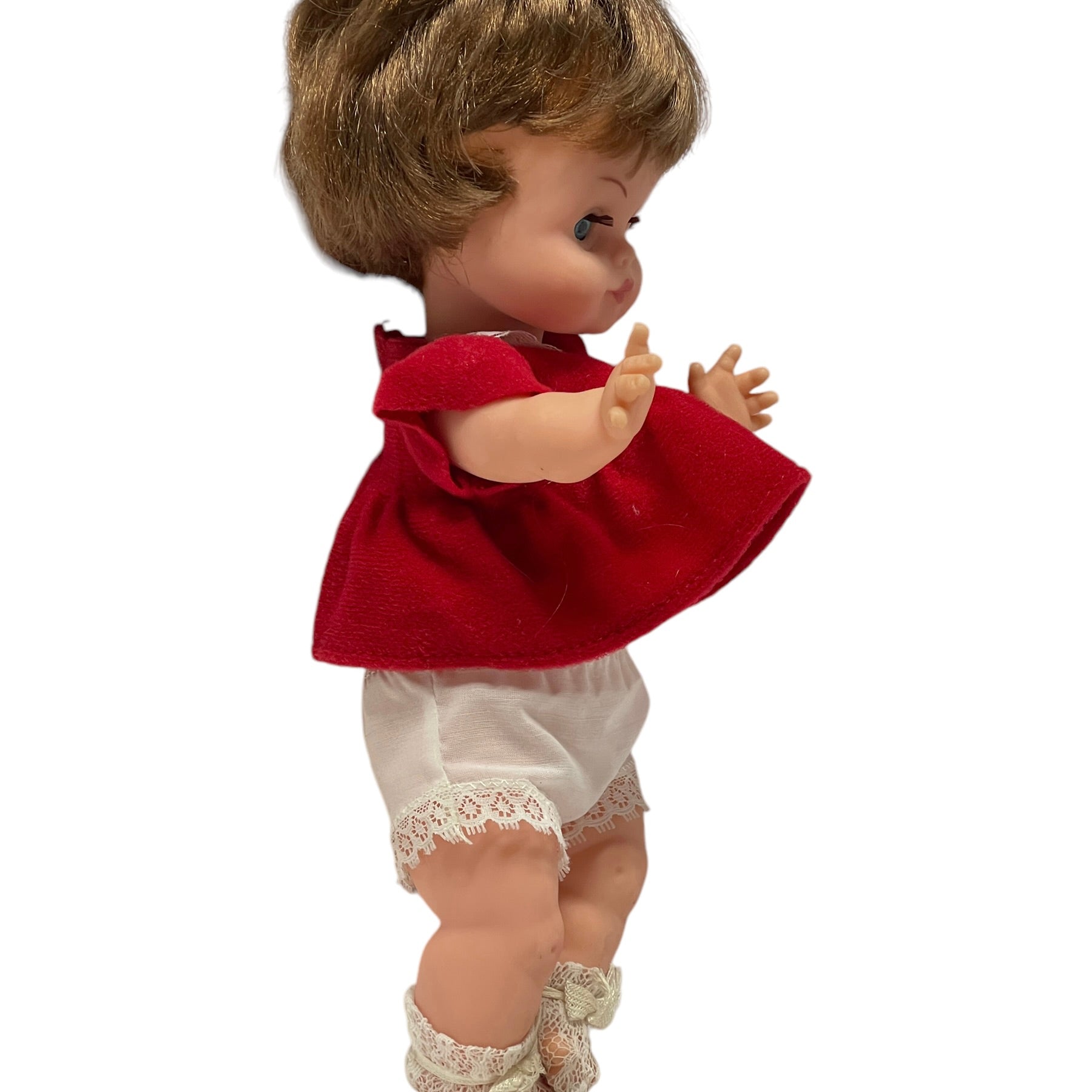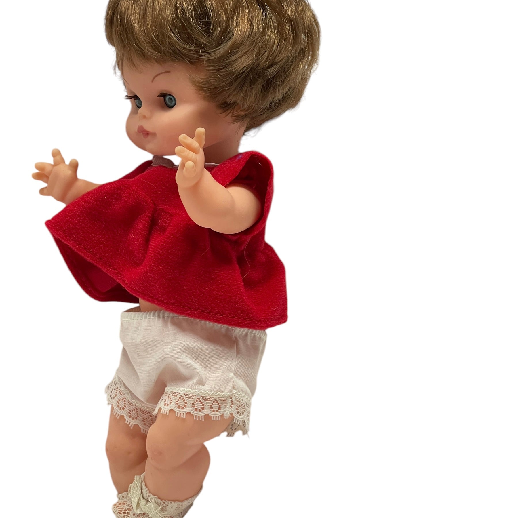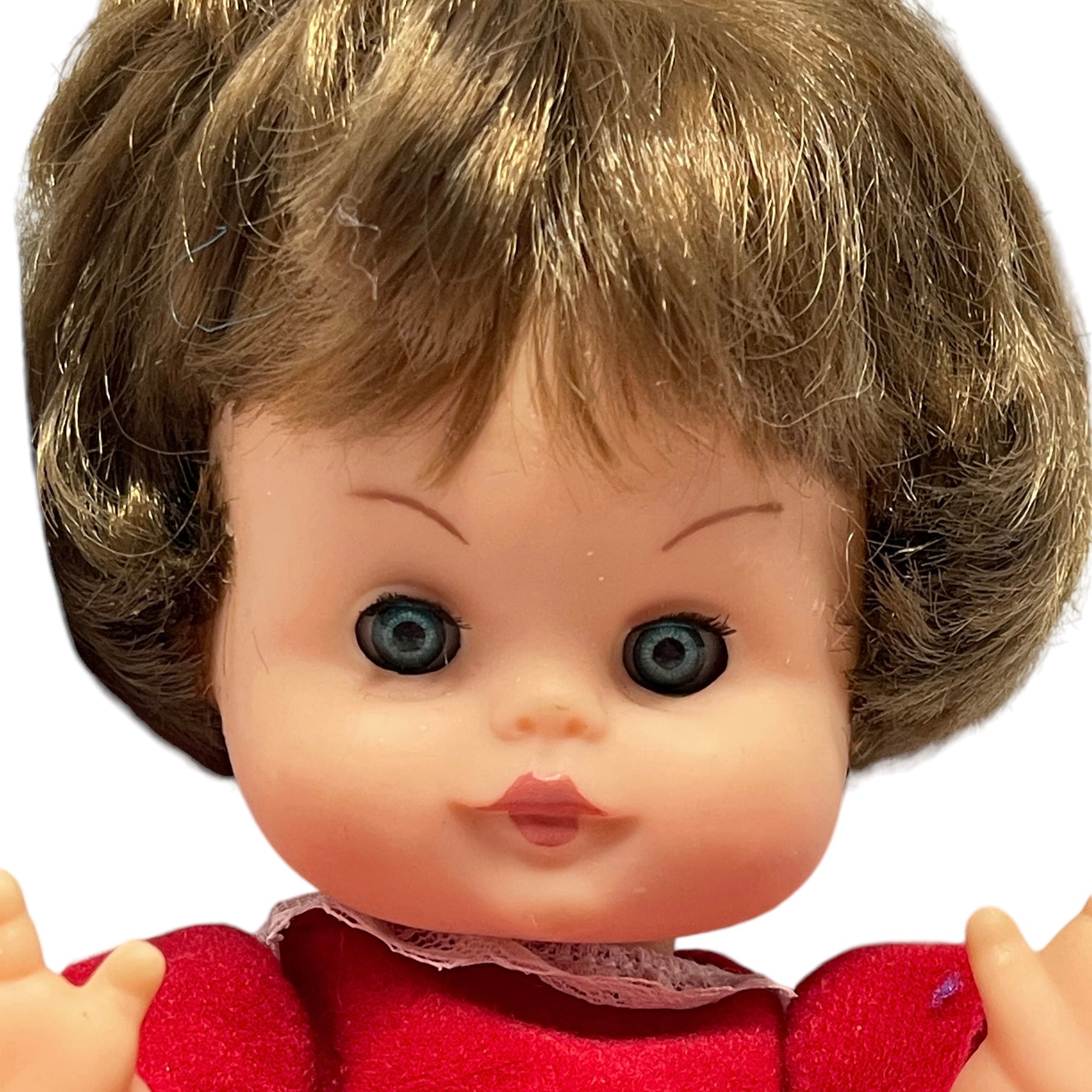 Vintage 11" Vinyl Doll Open/Shut Blue Eyes, Arched Painted Brows, Dainty Velvet & Lace Clothing