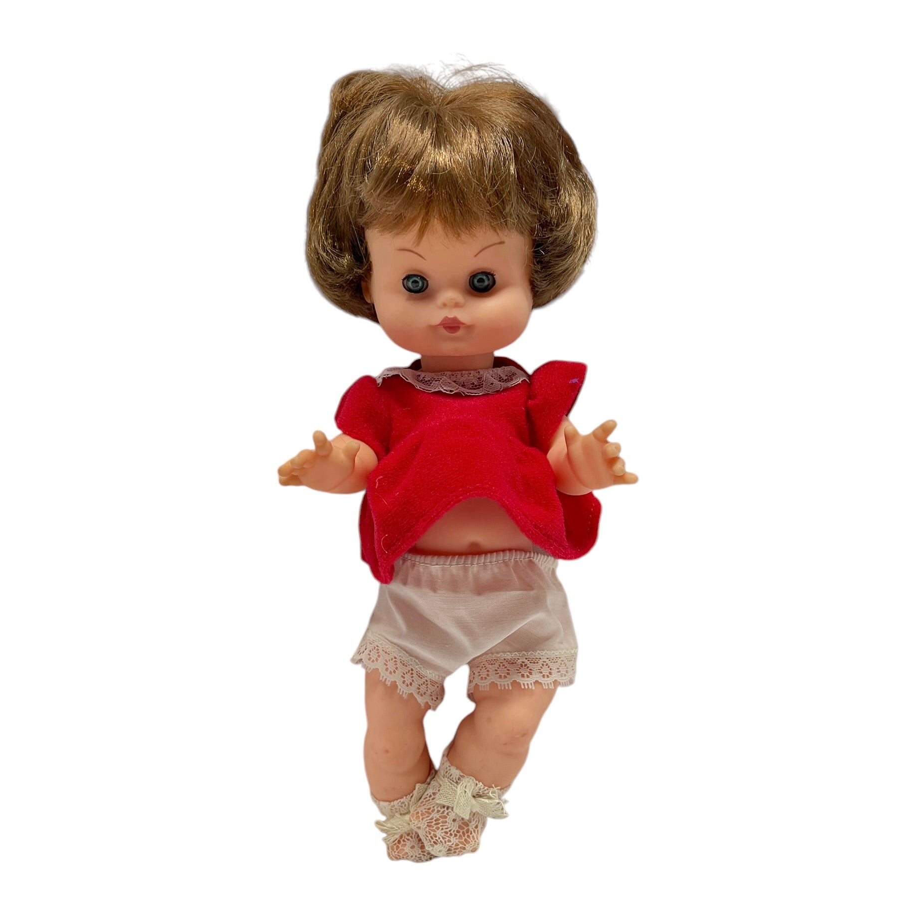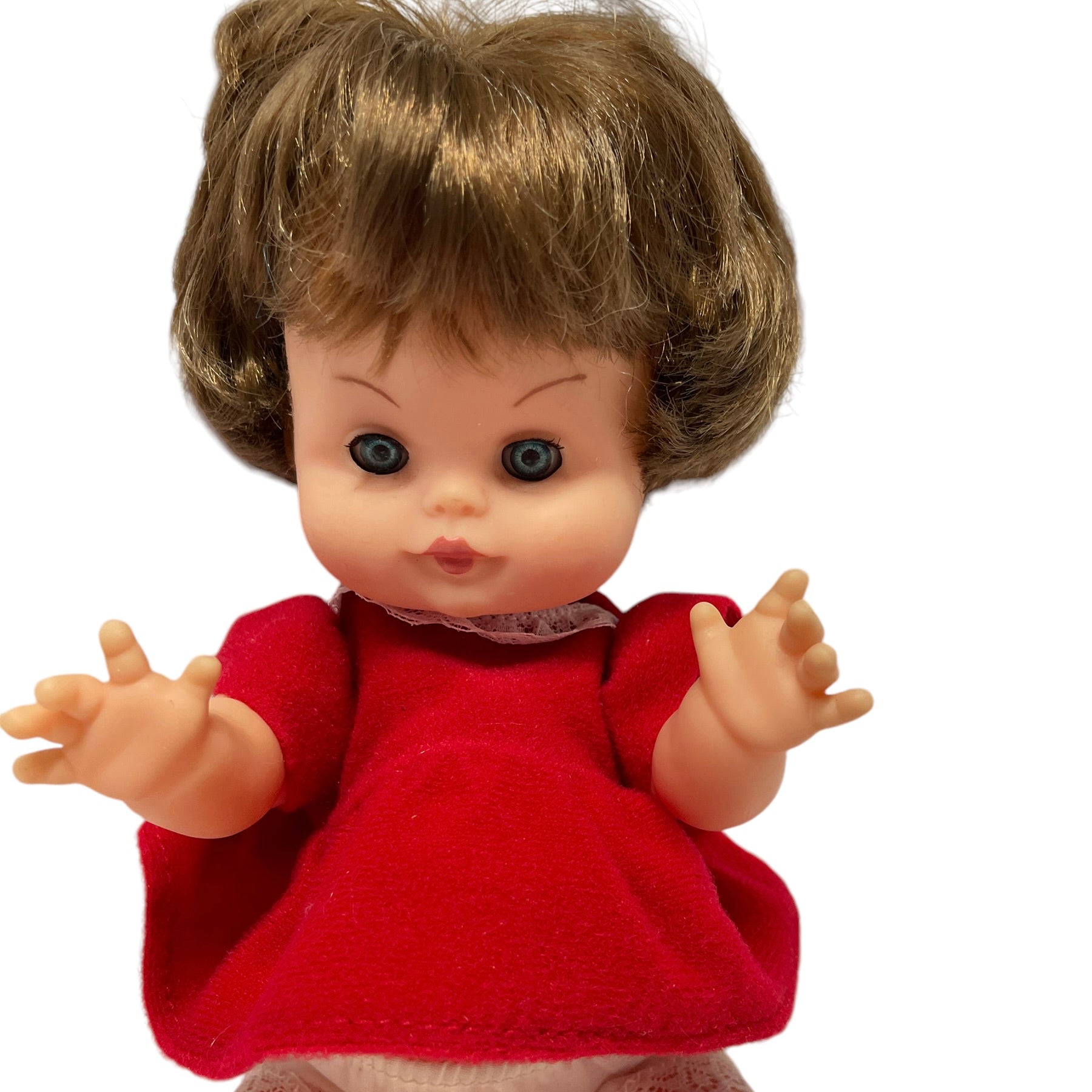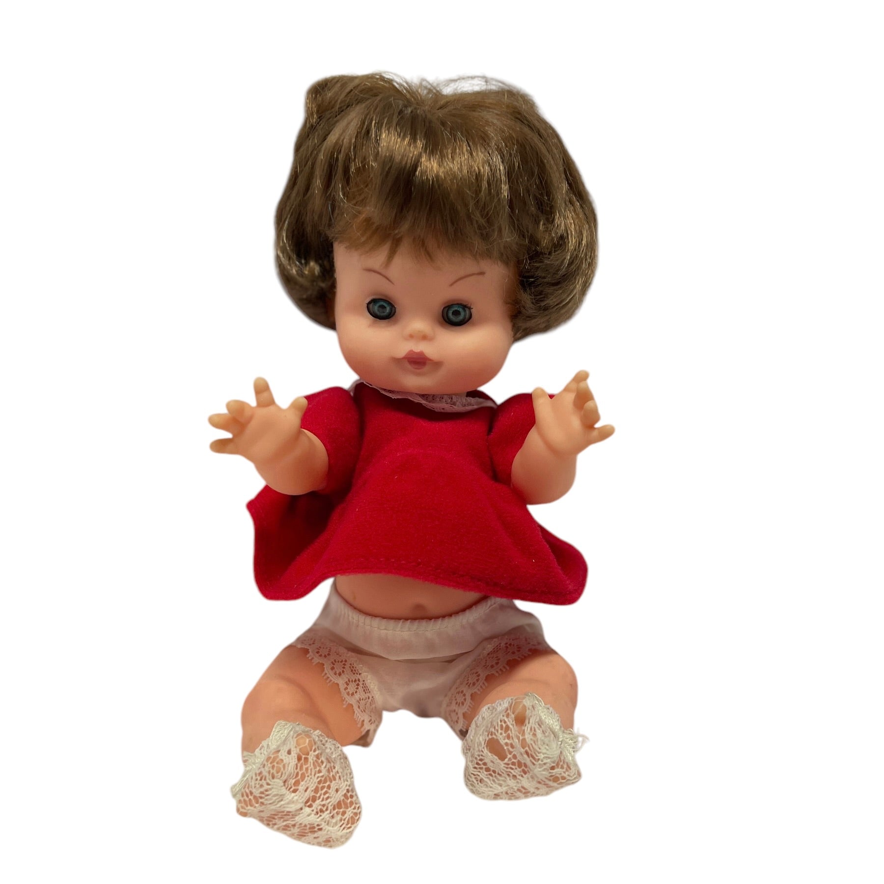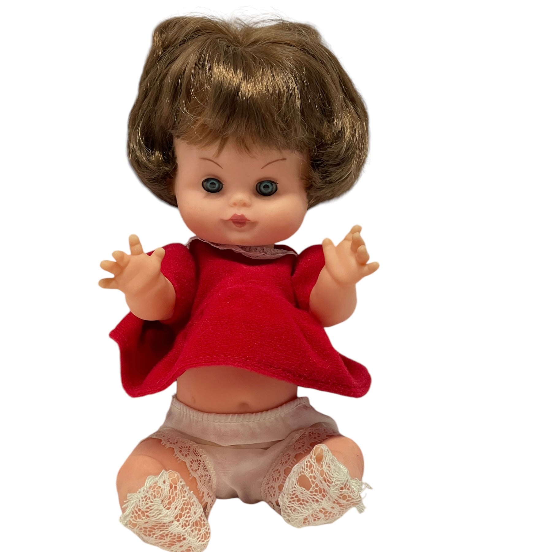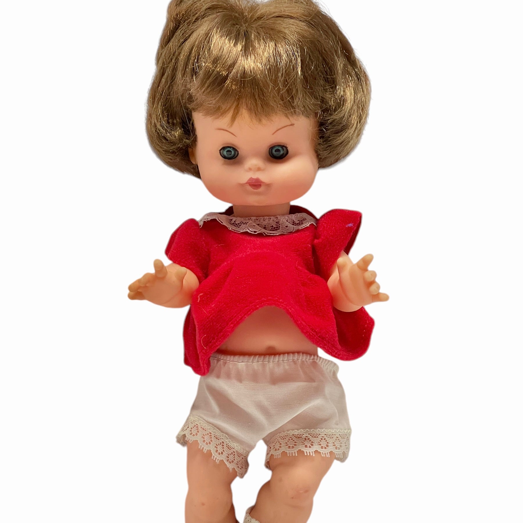 Vintage 11" Vinyl Doll Open/Shut Blue Eyes, Arched Painted Brows, Dainty Velvet & Lace Clothing