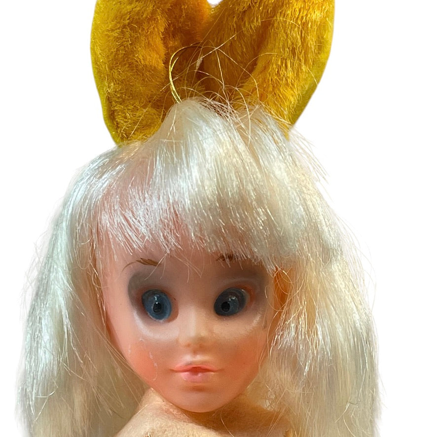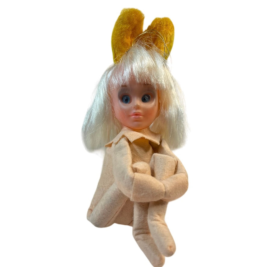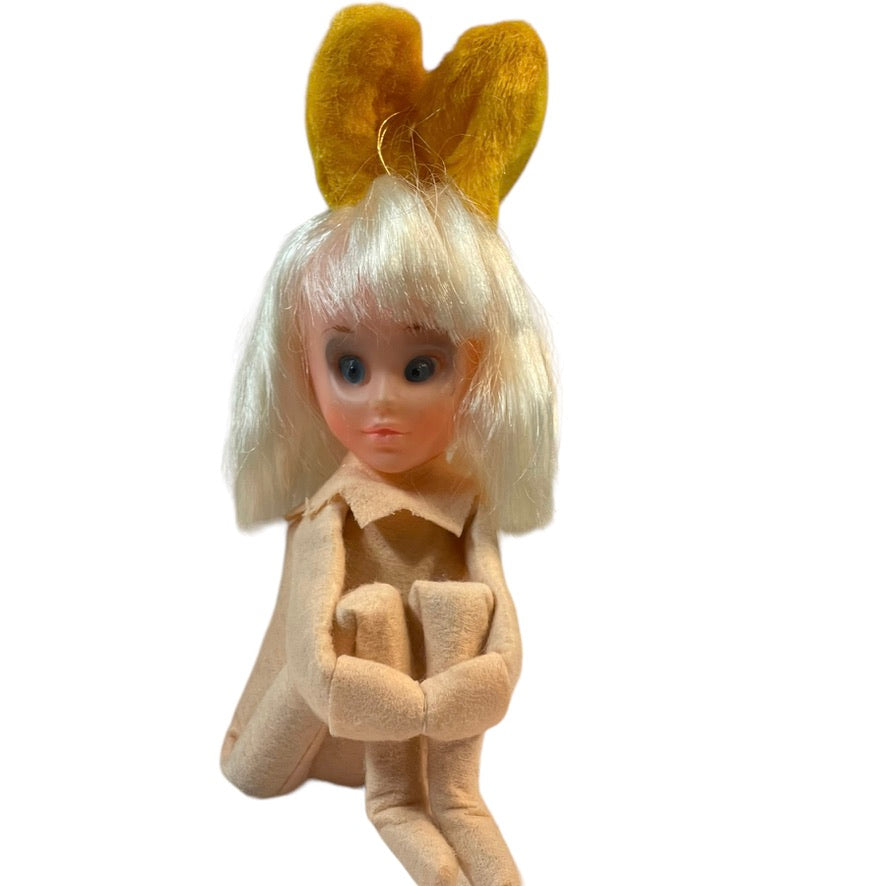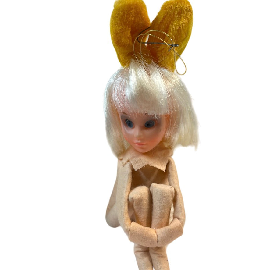 Vintage 1966 Kamar Knee Hugger/ Shelf Sitter Easter Rabbit with platinum hair, yellow Bunny Ears and gold hanging wire. This sweet girl is in good preowned condition