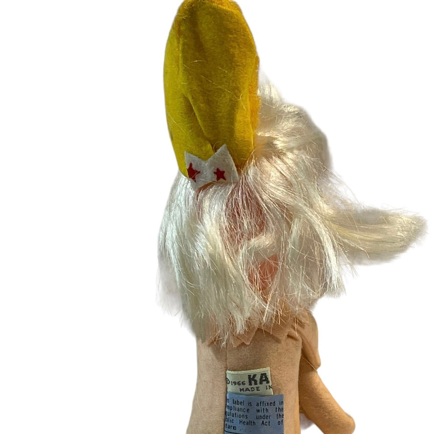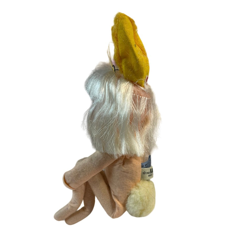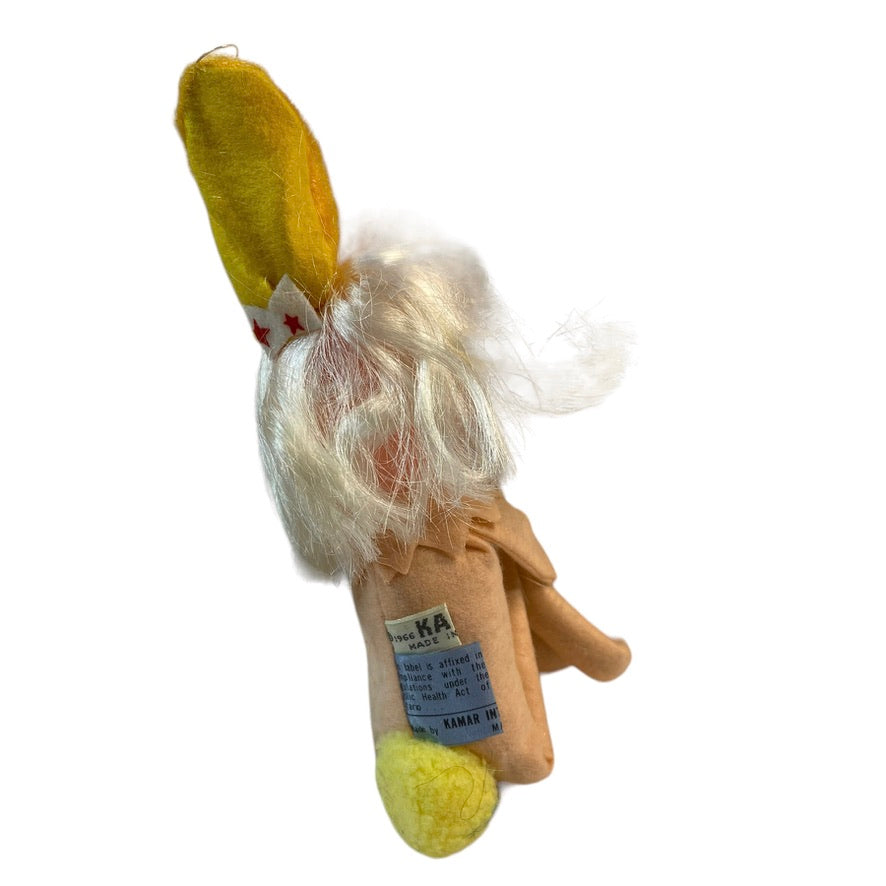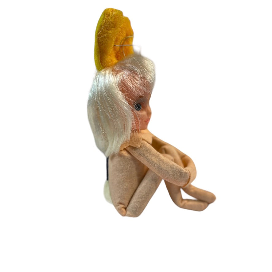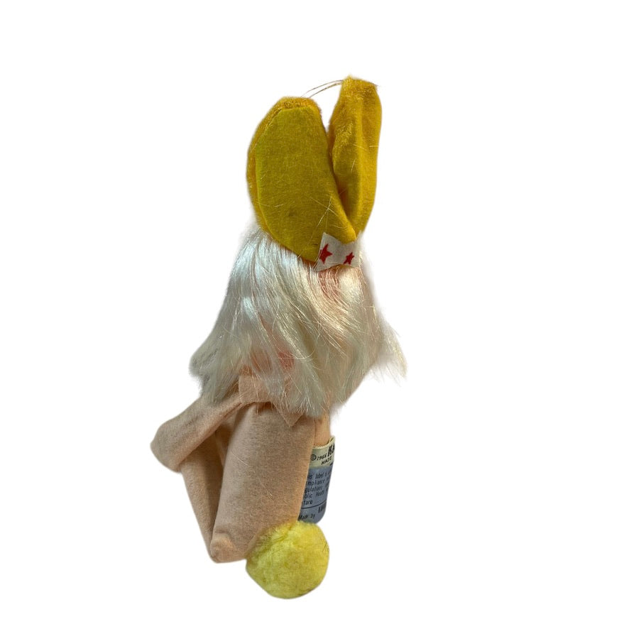 Vintage 1966 Kamar Knee Hugger/ Shelf Sitter Easter Rabbit with platinum hair, yellow Bunny Ears and gold hanging wire. This sweet girl is in good preowned condition
