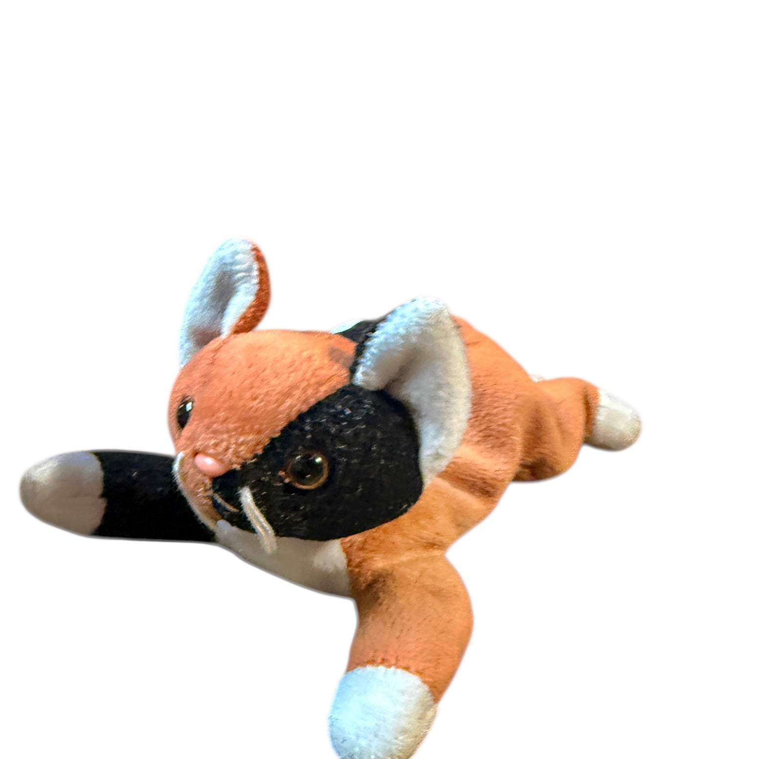 This sweet Ty Beanie Baby Calico Cat, 'Chip', vintage 1996 ,is in good preowned condition with tush tag intact. This handsome guy has topaz ringed eyes and long white whiskers. Missing ear tag.