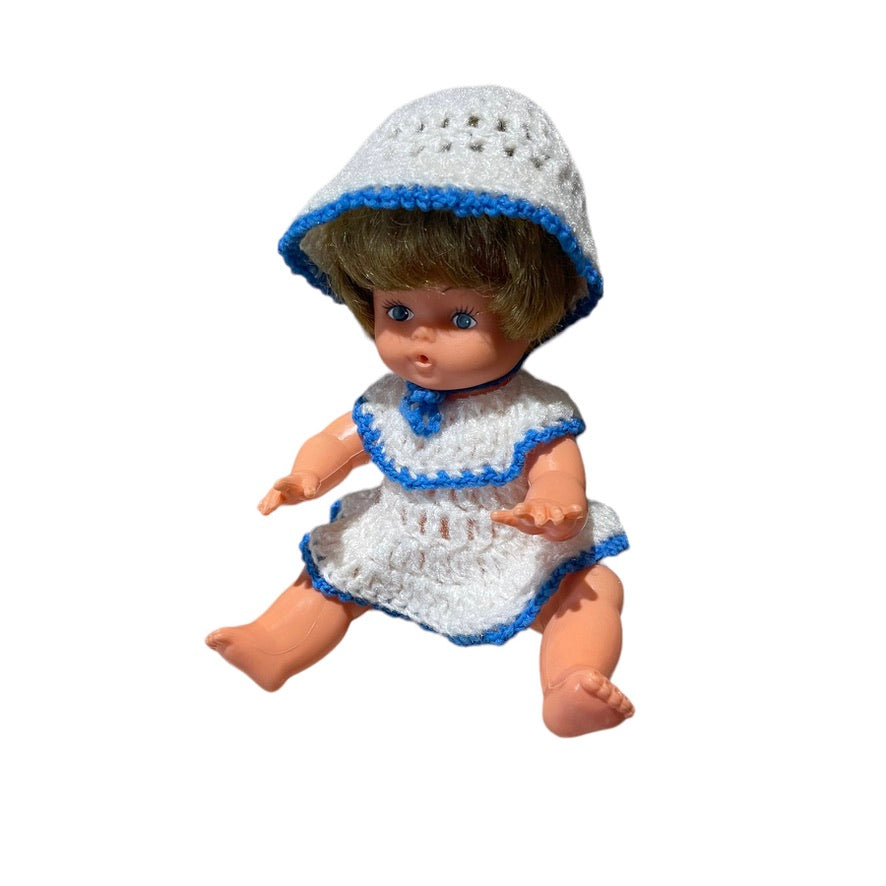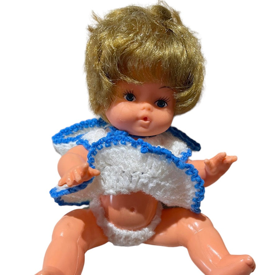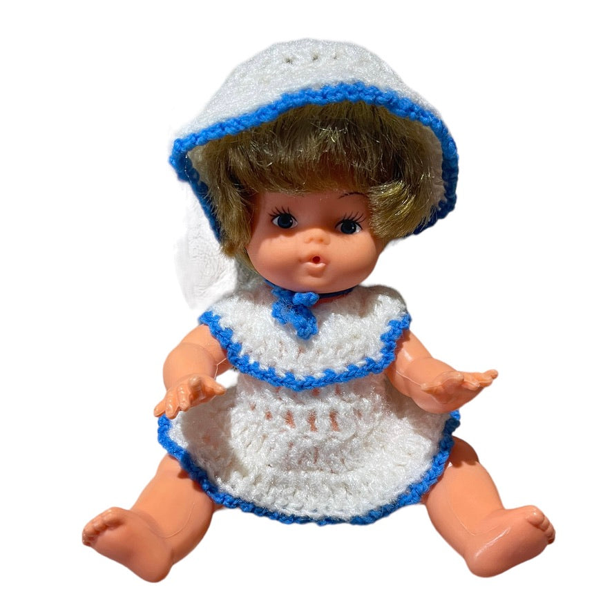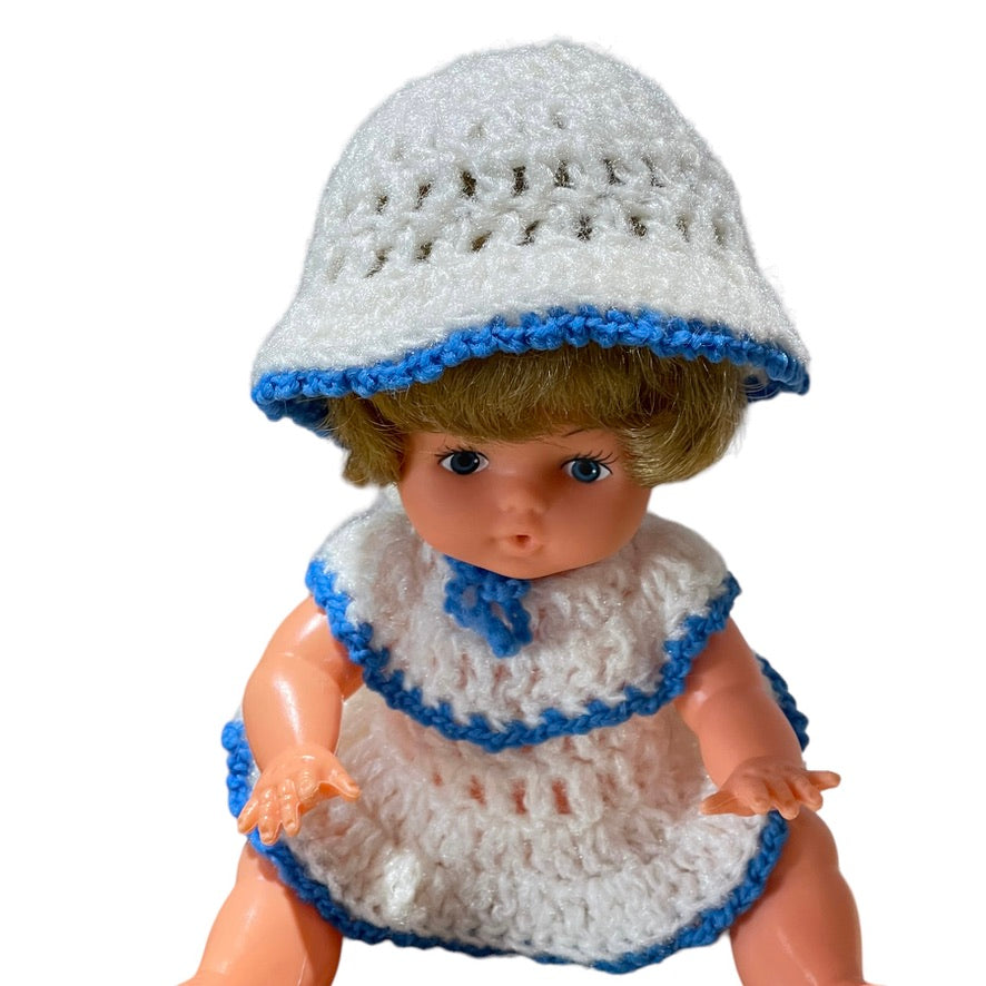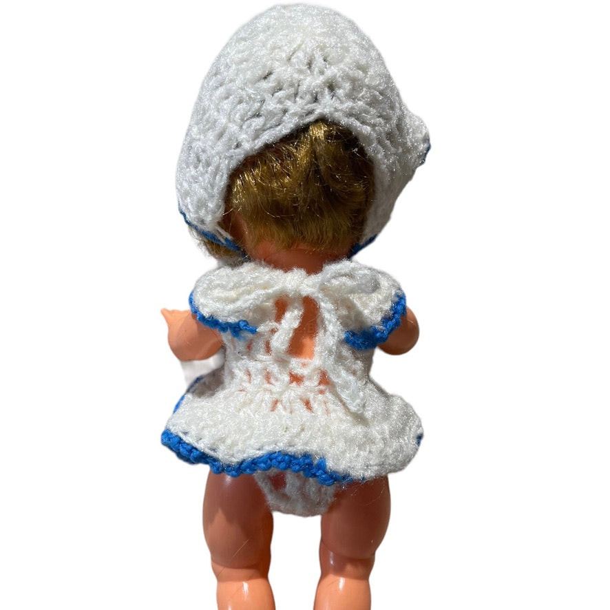 Vintage Blue Box Made in Hong Kong Drink & Wet Baby Doll in Knit White & Blue Outfit