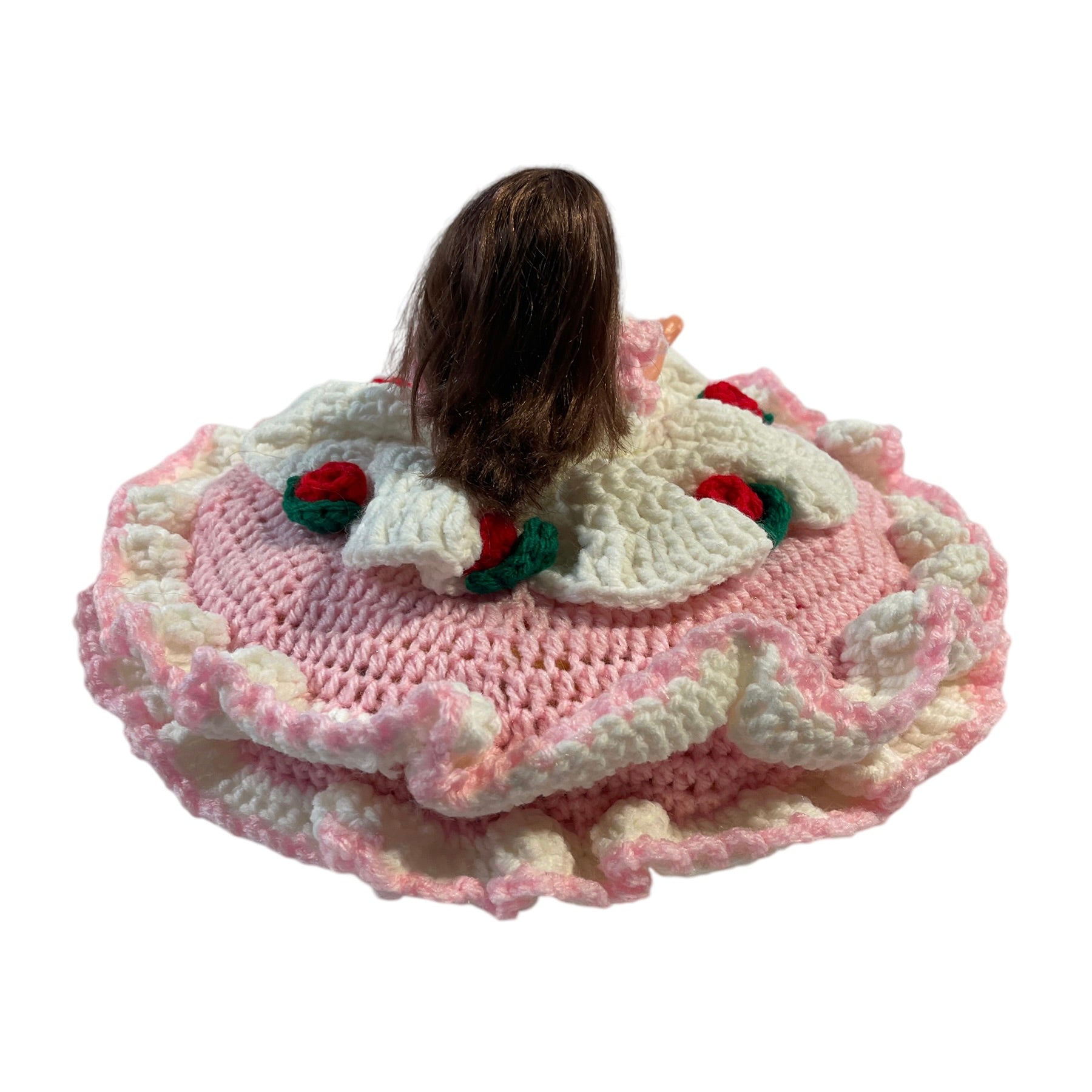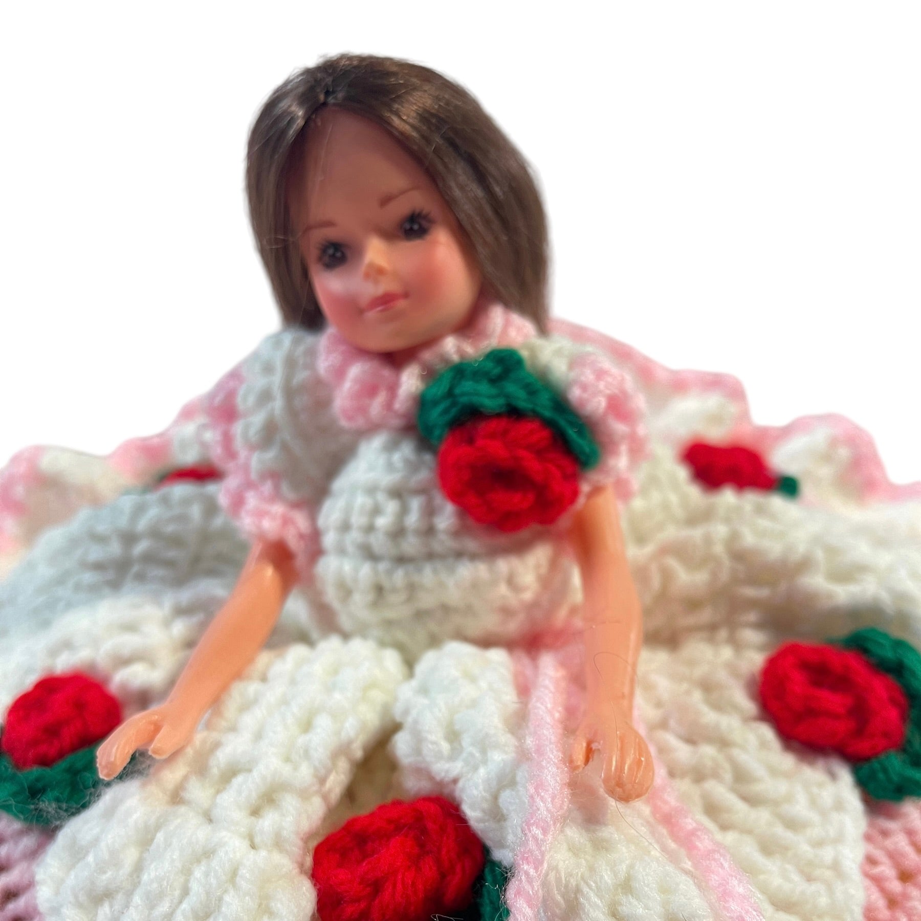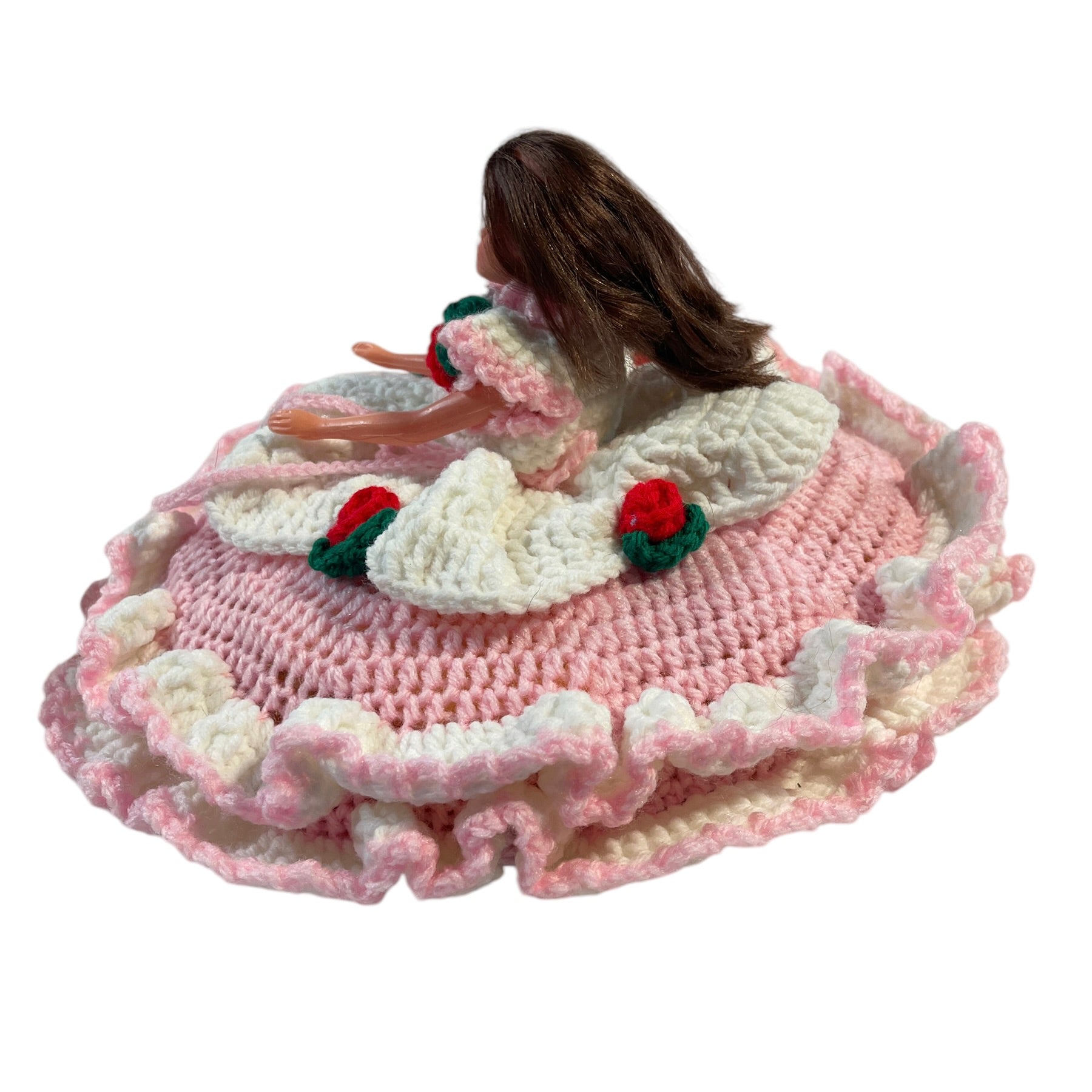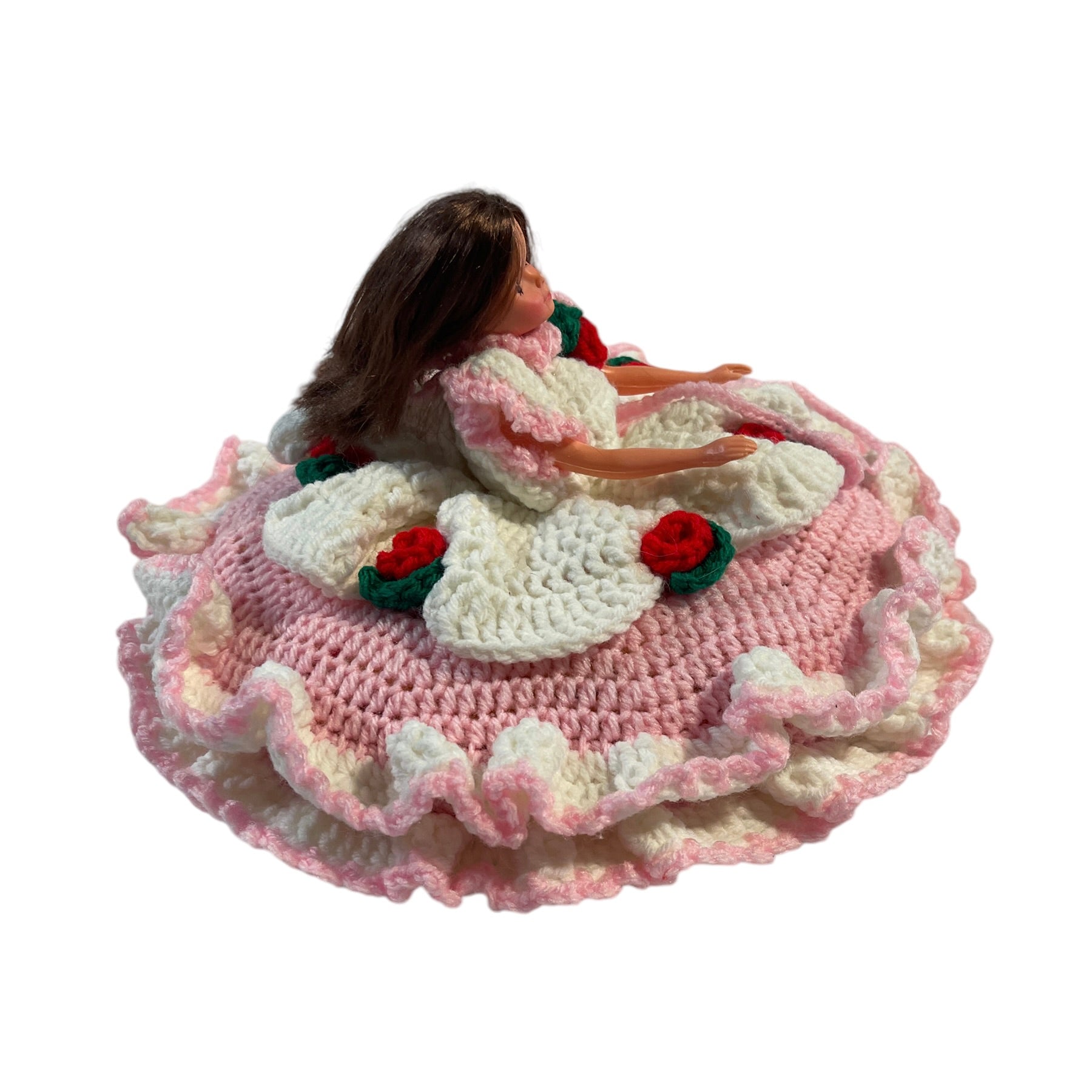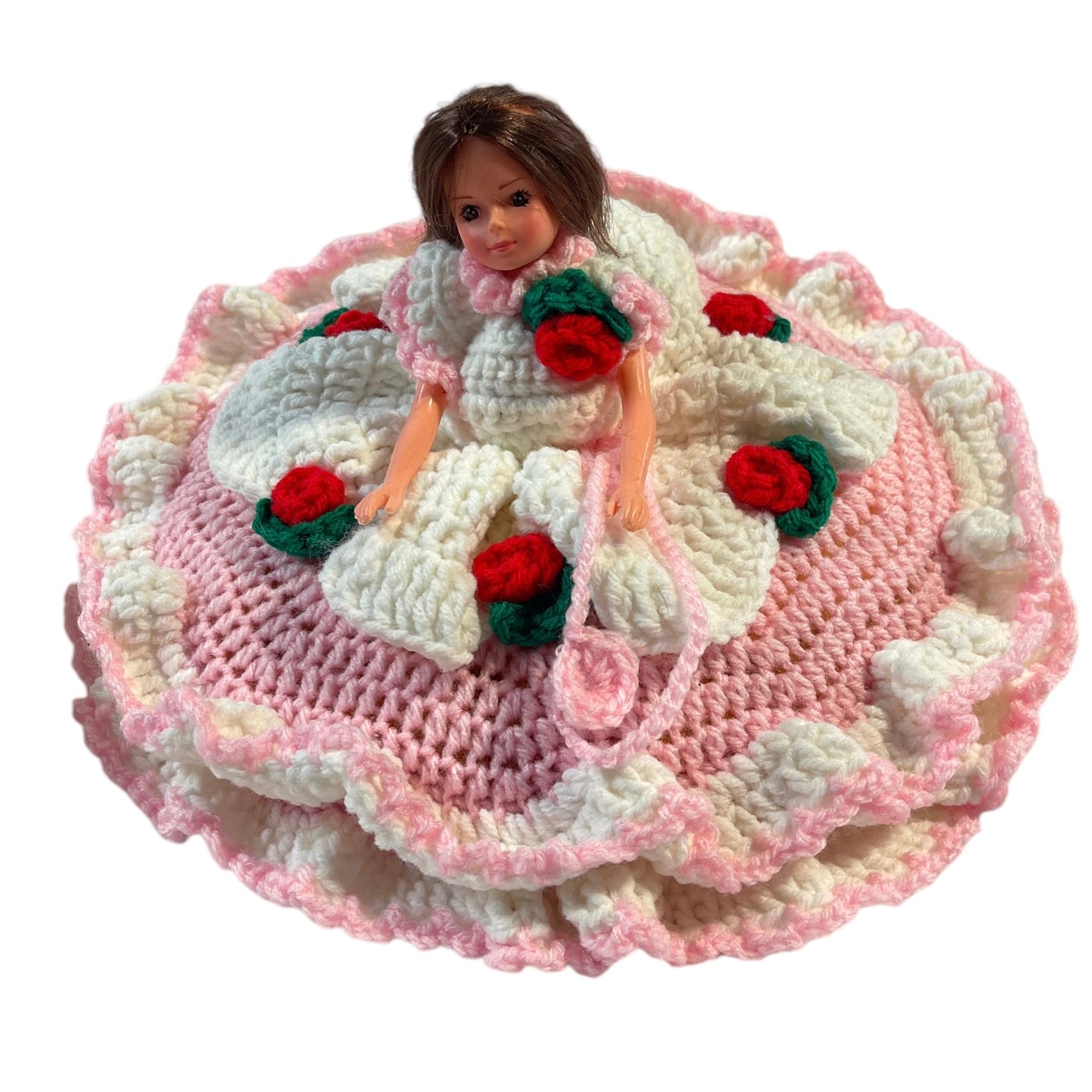 Vintage Crochet Bed Sitter Doll, Pink & White Dress. Embellished with Red Roses & Green Leaves