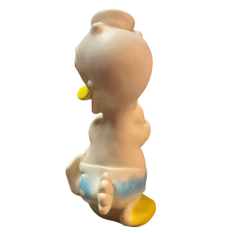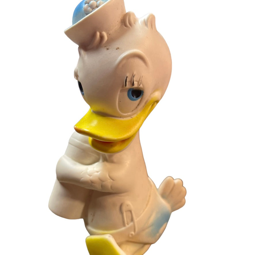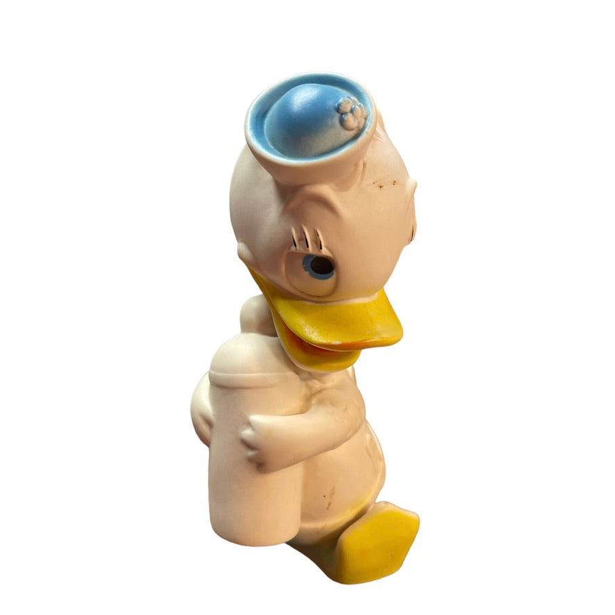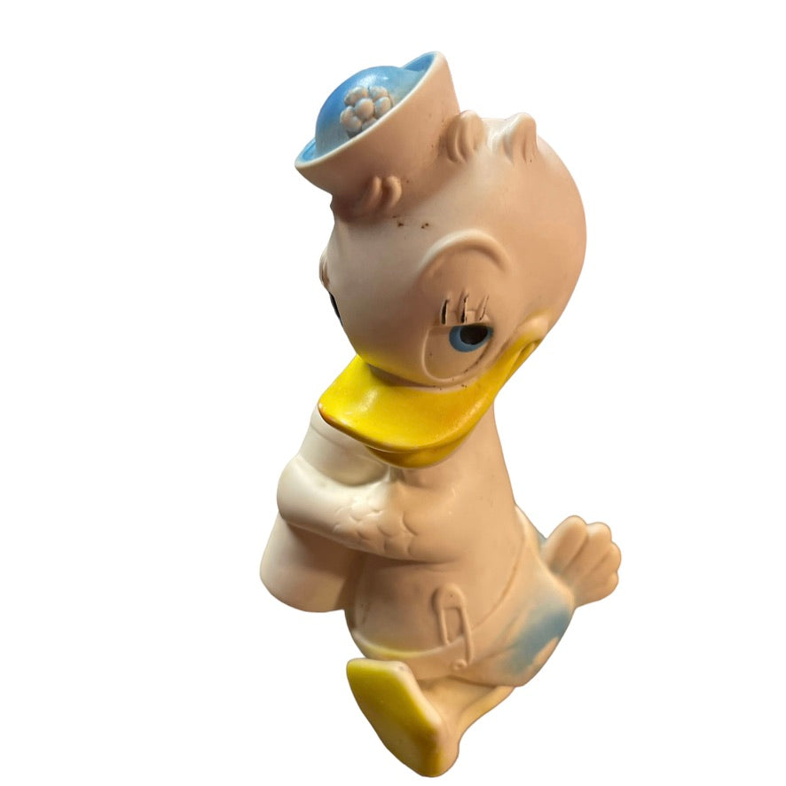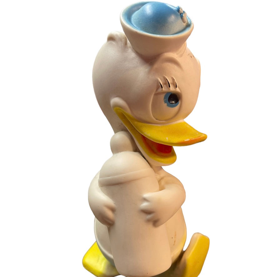 Vintage Vinyl Donald Duck in a diaper holding an oversize bottle has some marks from wear, but is still adorable. A fun addition to a Disney Collection, or for a lucky baby to play with.