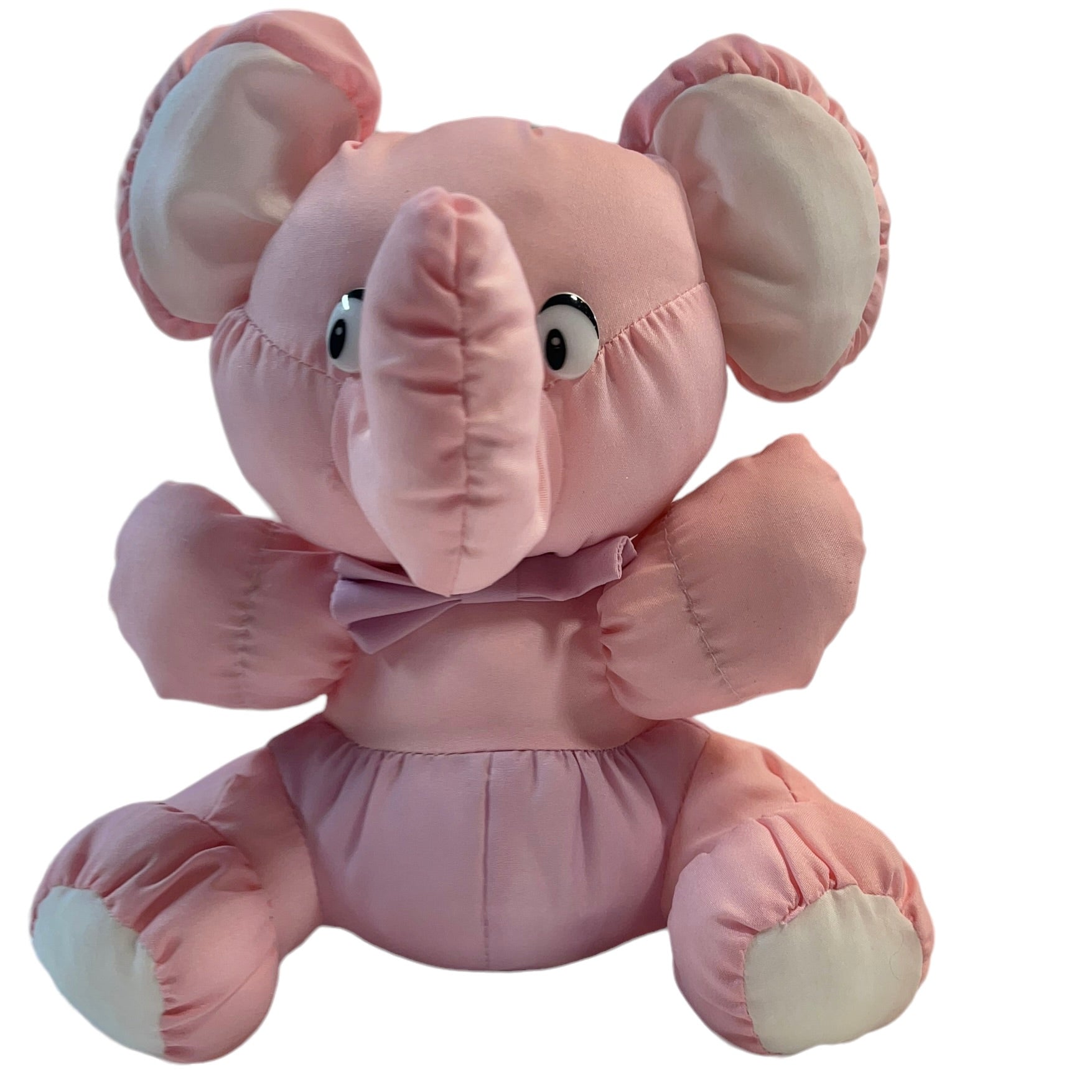 Vintage pink elephant with a raised trunk, parachute nylon fabric, shiny plastic eyes and pink bow tie. This sweet elephant is in excellent preowned condition, but the tag is faded and frayed.