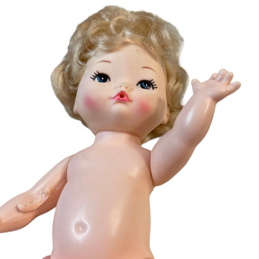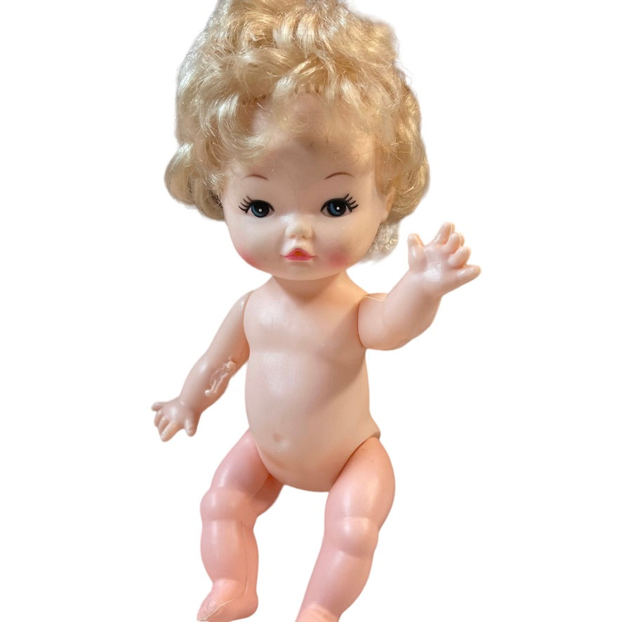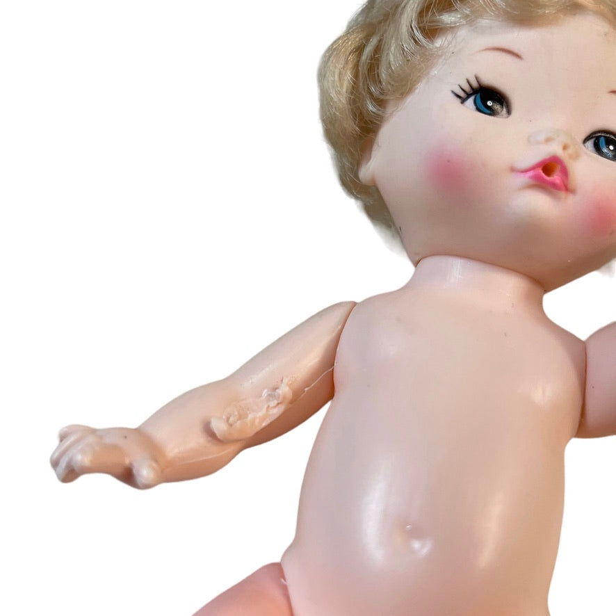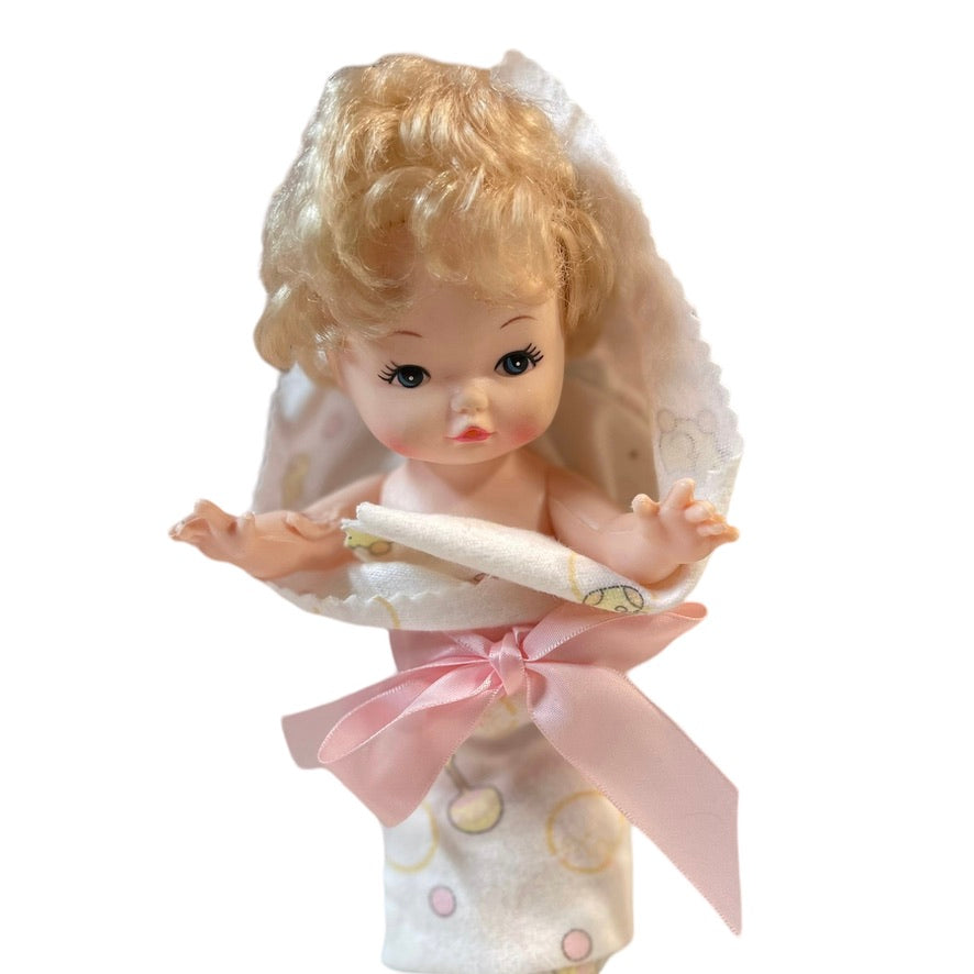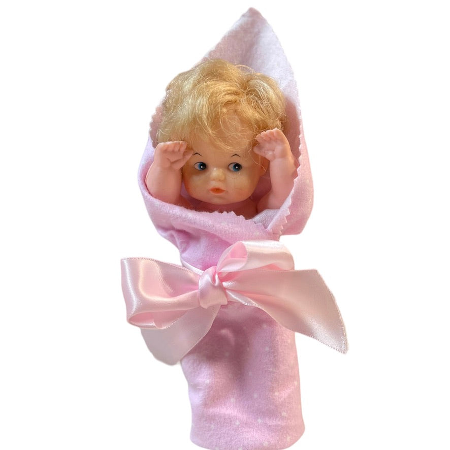 Sweet Plastic Baby Girls, 2 x6" and 1 x7" wrapped in single ply flannel receivers. Lots of fun in the playroom or in the bath! One baby has a defect on her arm, please see pictures.