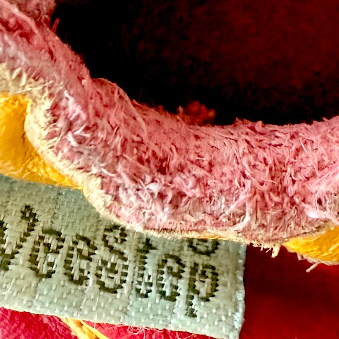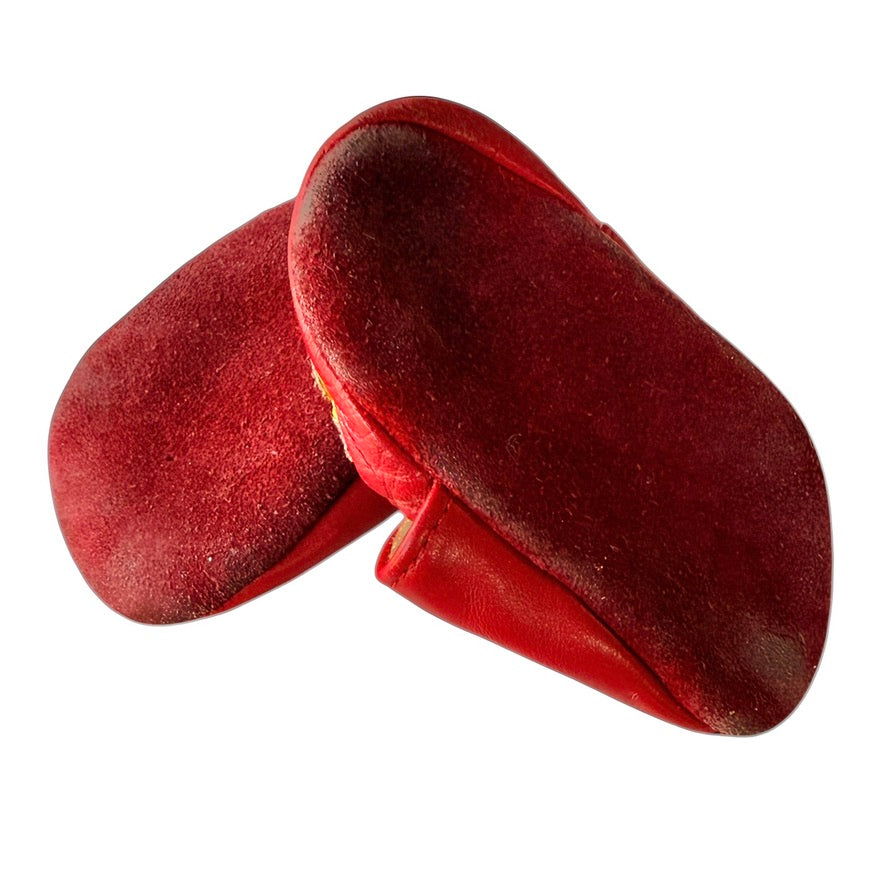 These cute little leather infant slippers are in good preowned condition with some wear on the suede soles. Made in Mexico, these little shoes feature a red leather upper with yellow and black truck applique. Expansion elastic ensures a snug fit.