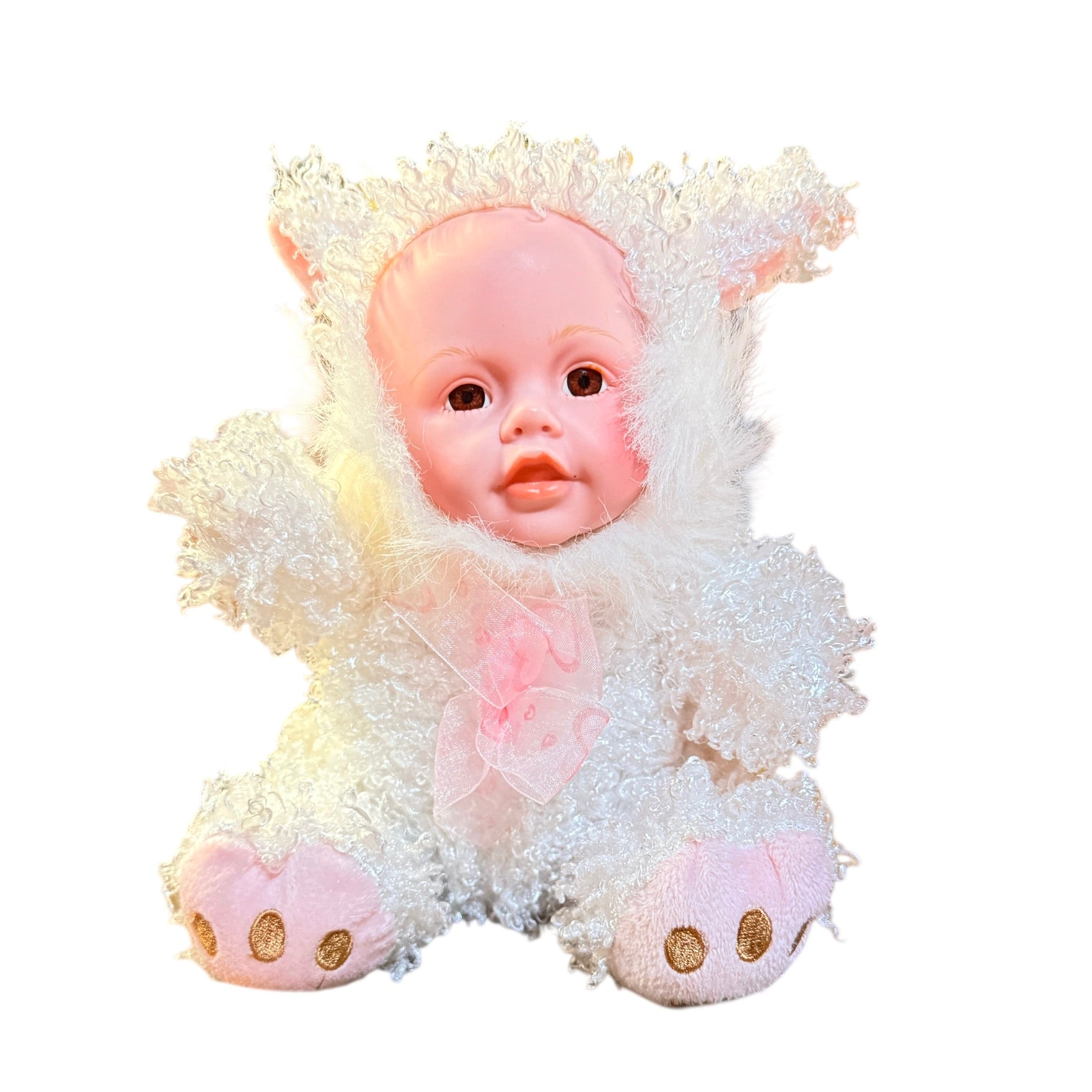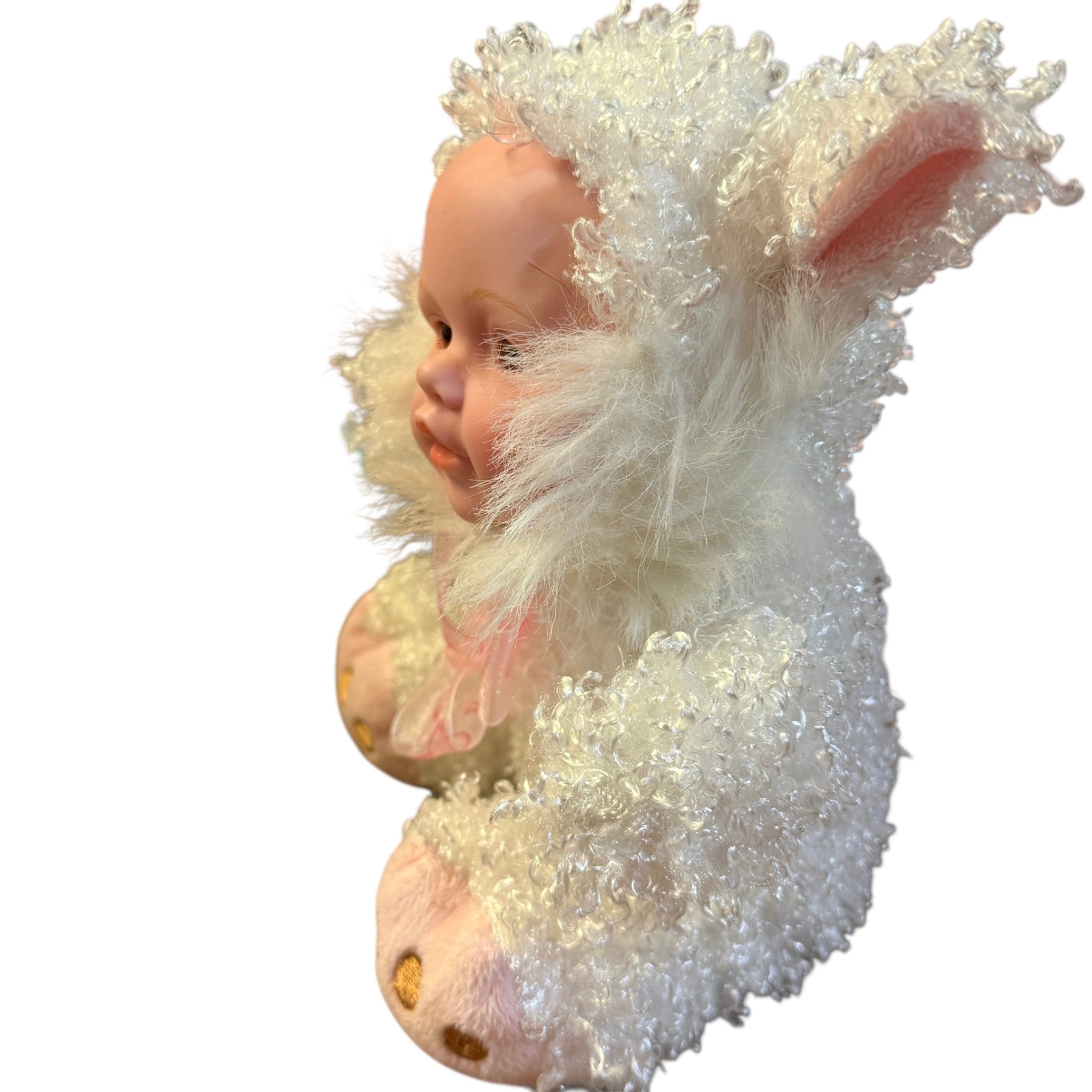 Adorable 8" Seated Bunny Baby Doll, Vinyl Face, Brown Eyes & Curly White Body, Pink Accents
