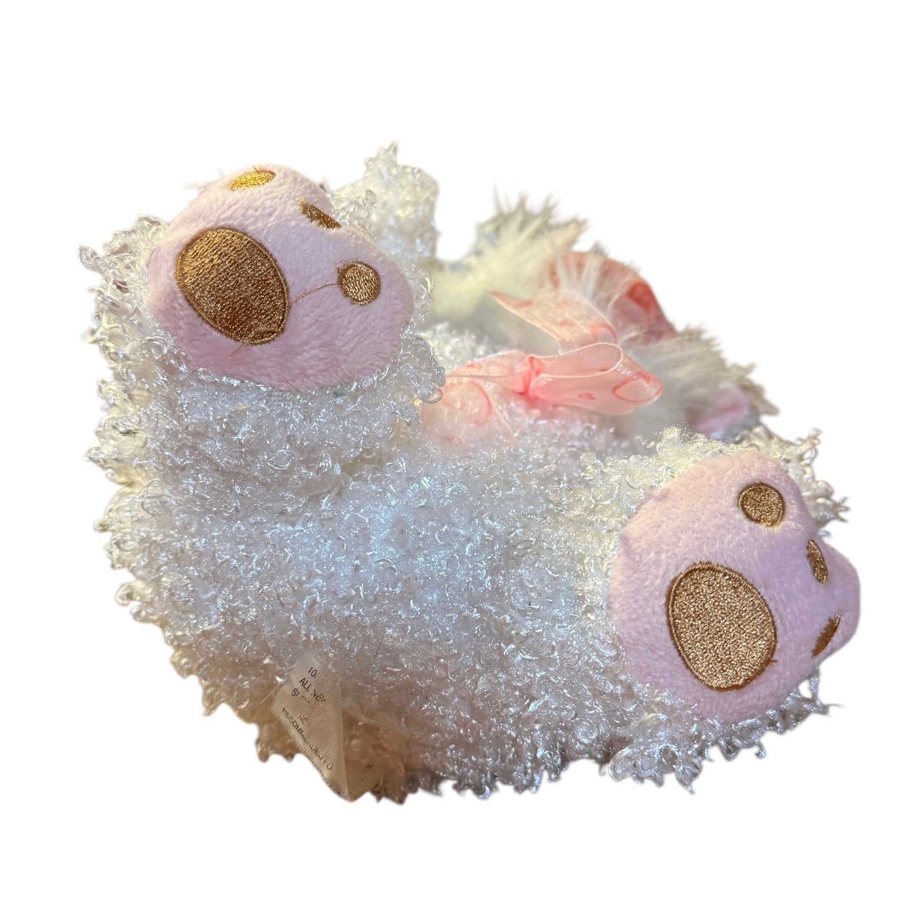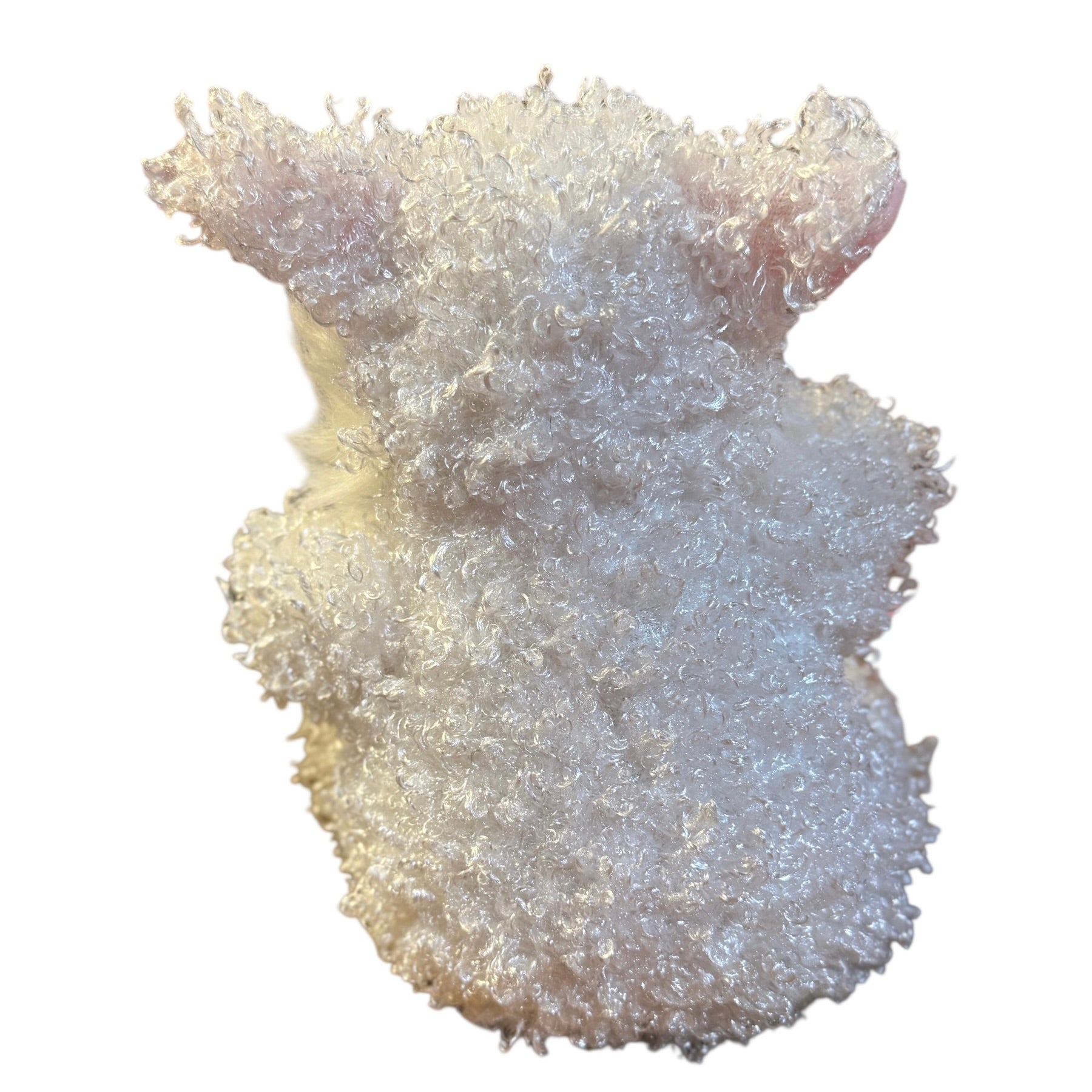 Preowned Baby Bunny Doll, unbranded with a faded tag. This sweet baby has a sparkly, curly white coat with pink ears and a pink chiffon bow. Excellent preowned condition.